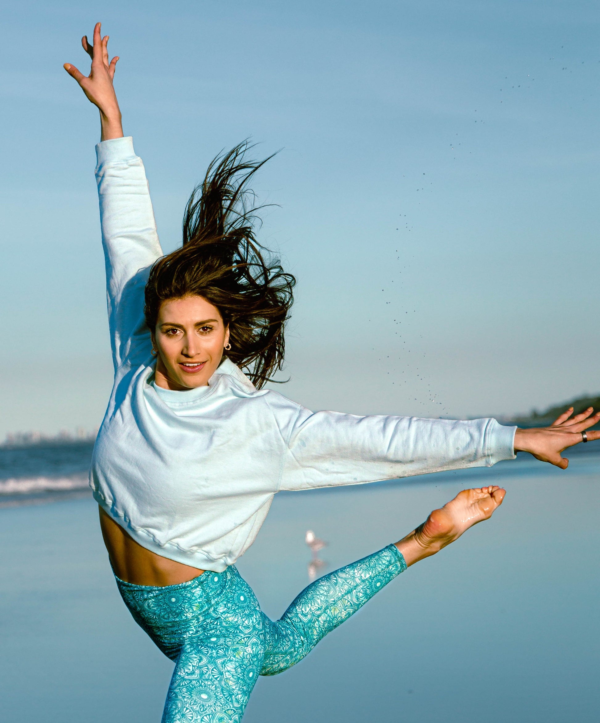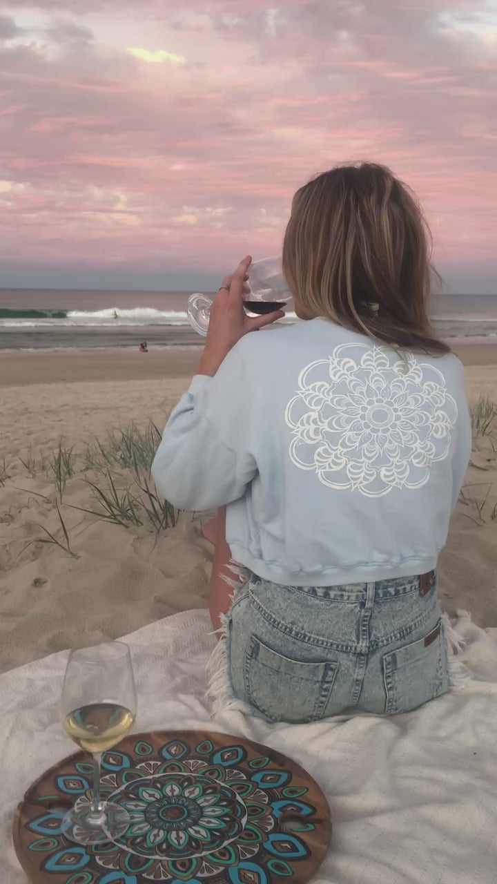 This cropped sweatshirt is a loose fitted jumper made from a cosy lightweight French Terry cotton. The sweater is ethically dyed in a pastel icy blue hue and has a hand drawn white mandala screen print on the back.