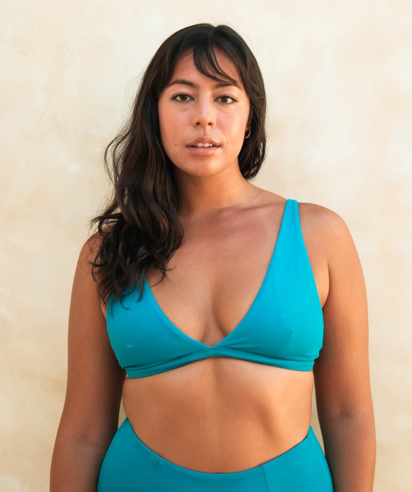 Enjoy comfort and support without the underwire! Our Signature Teal Green Triangle Bikini Top caters to all sizes—from A to G cups—featuring adjustable, thick shoulder straps and an adjustable back tie for the perfect fit on both narrow and wider backs.