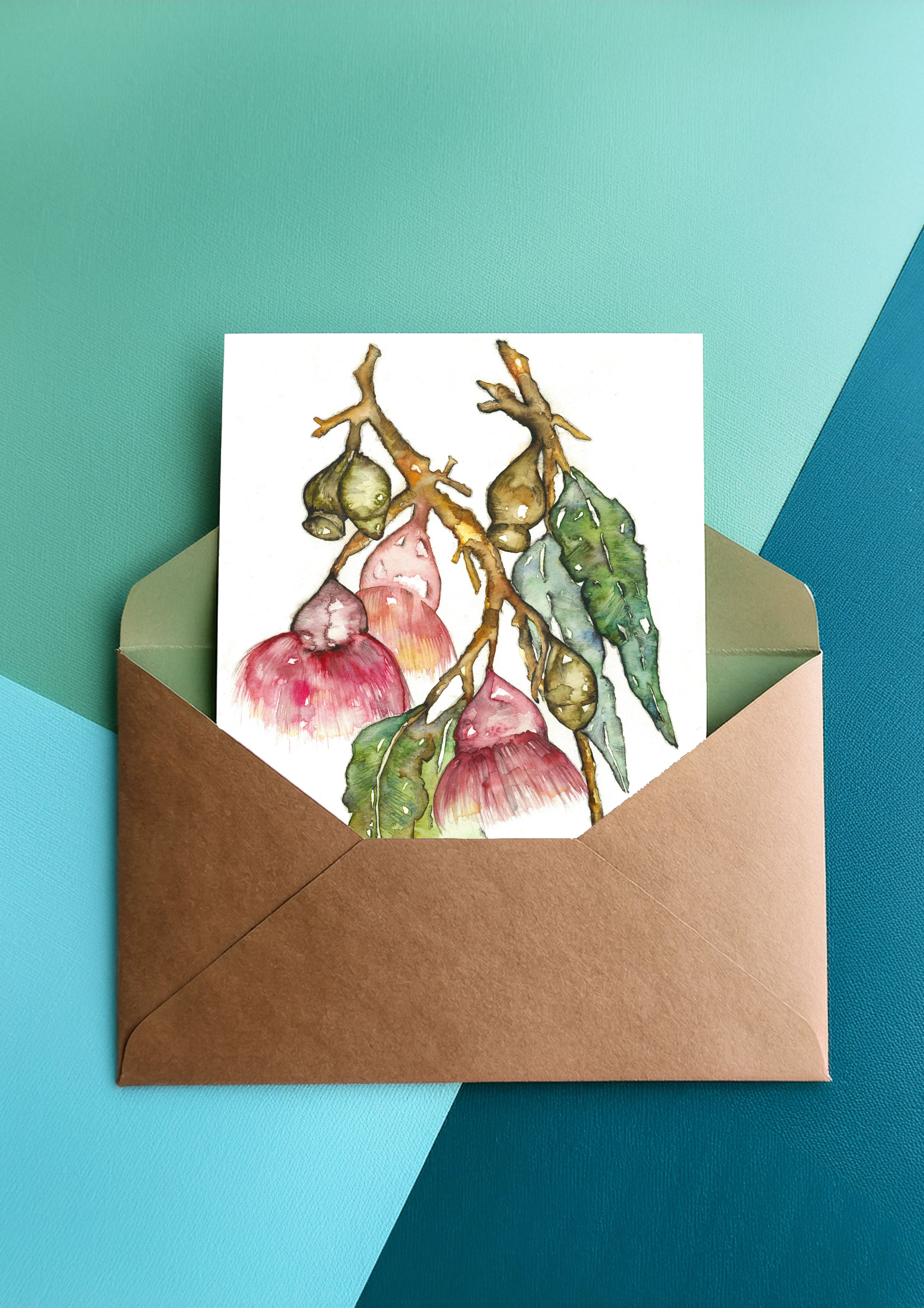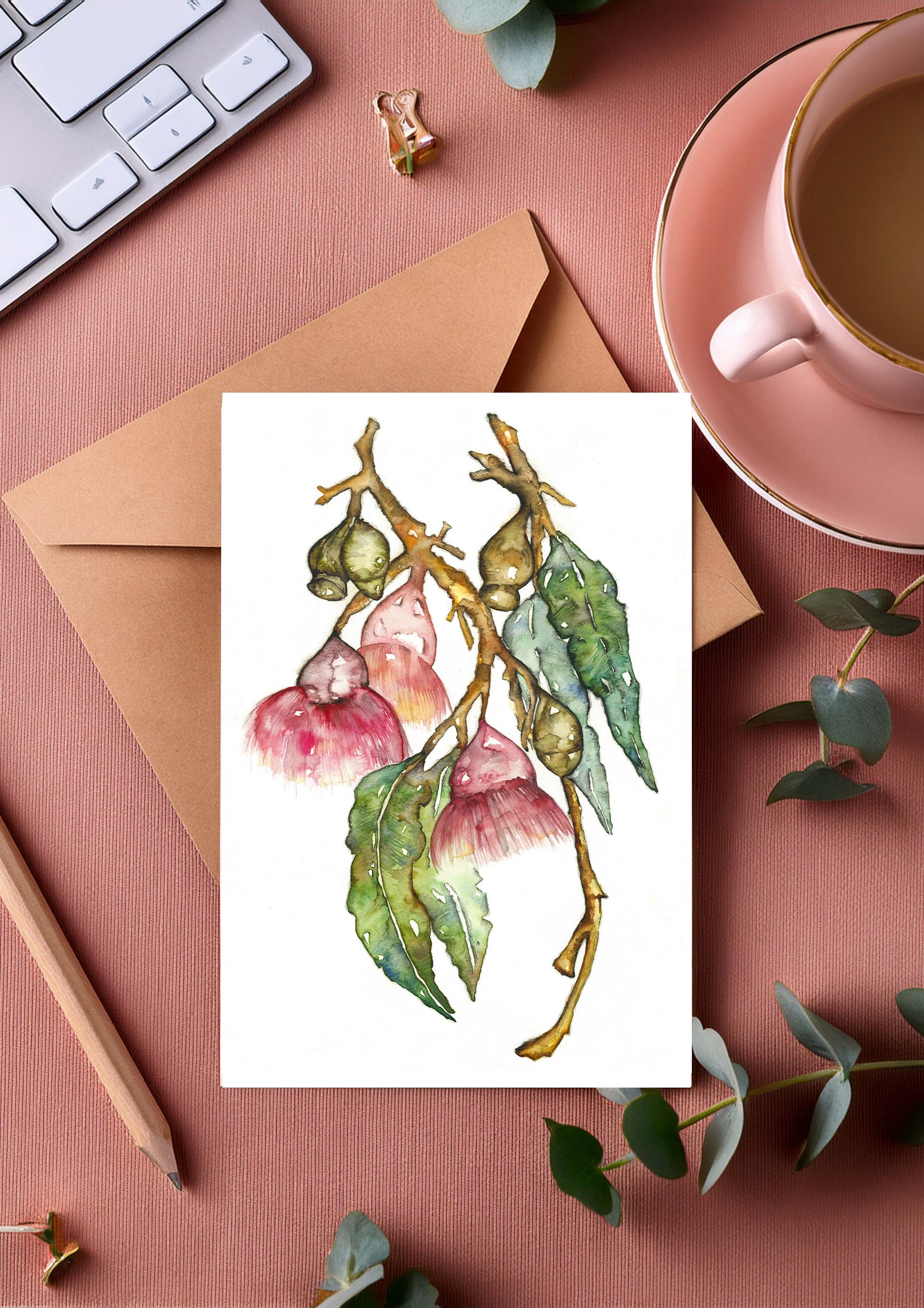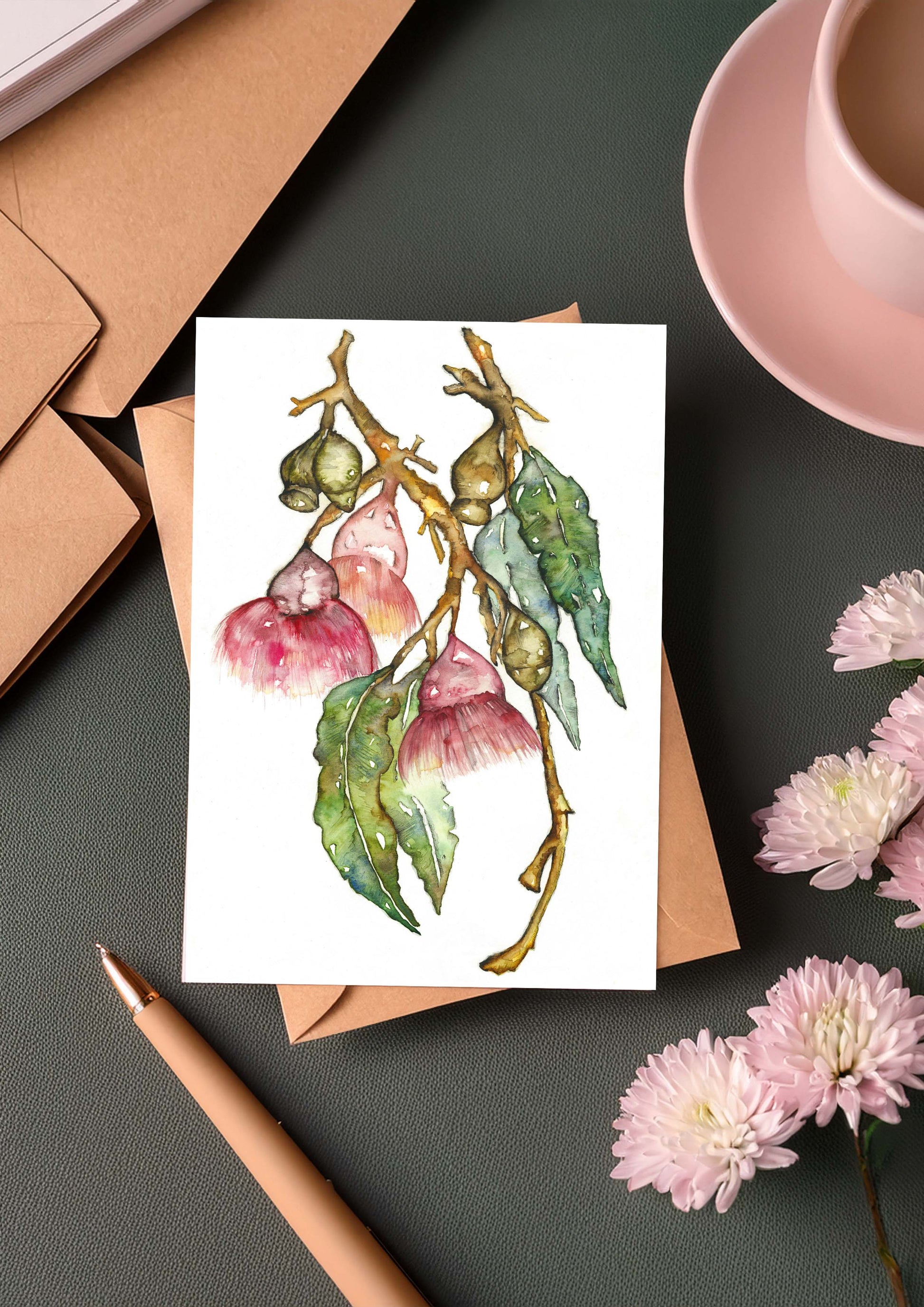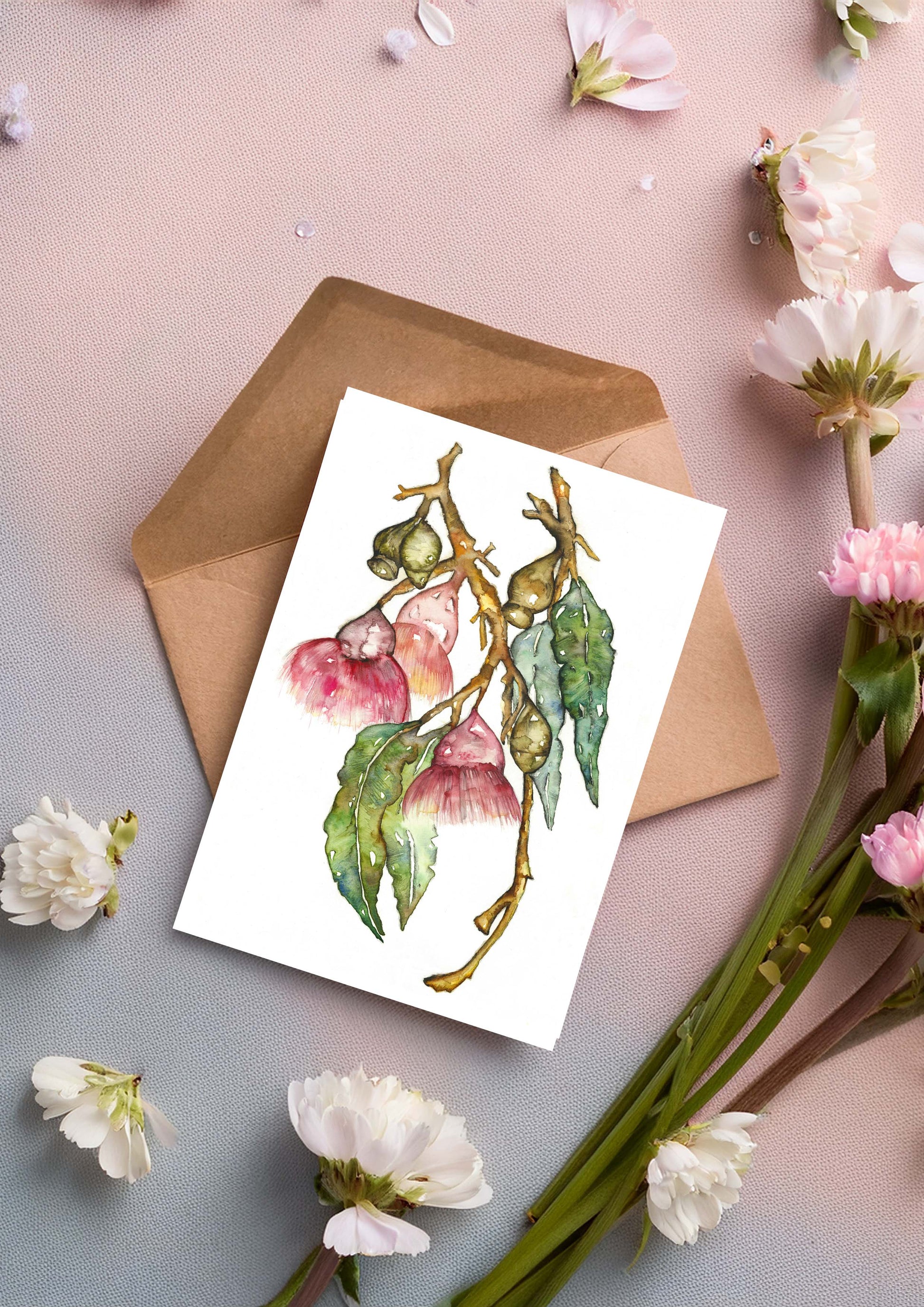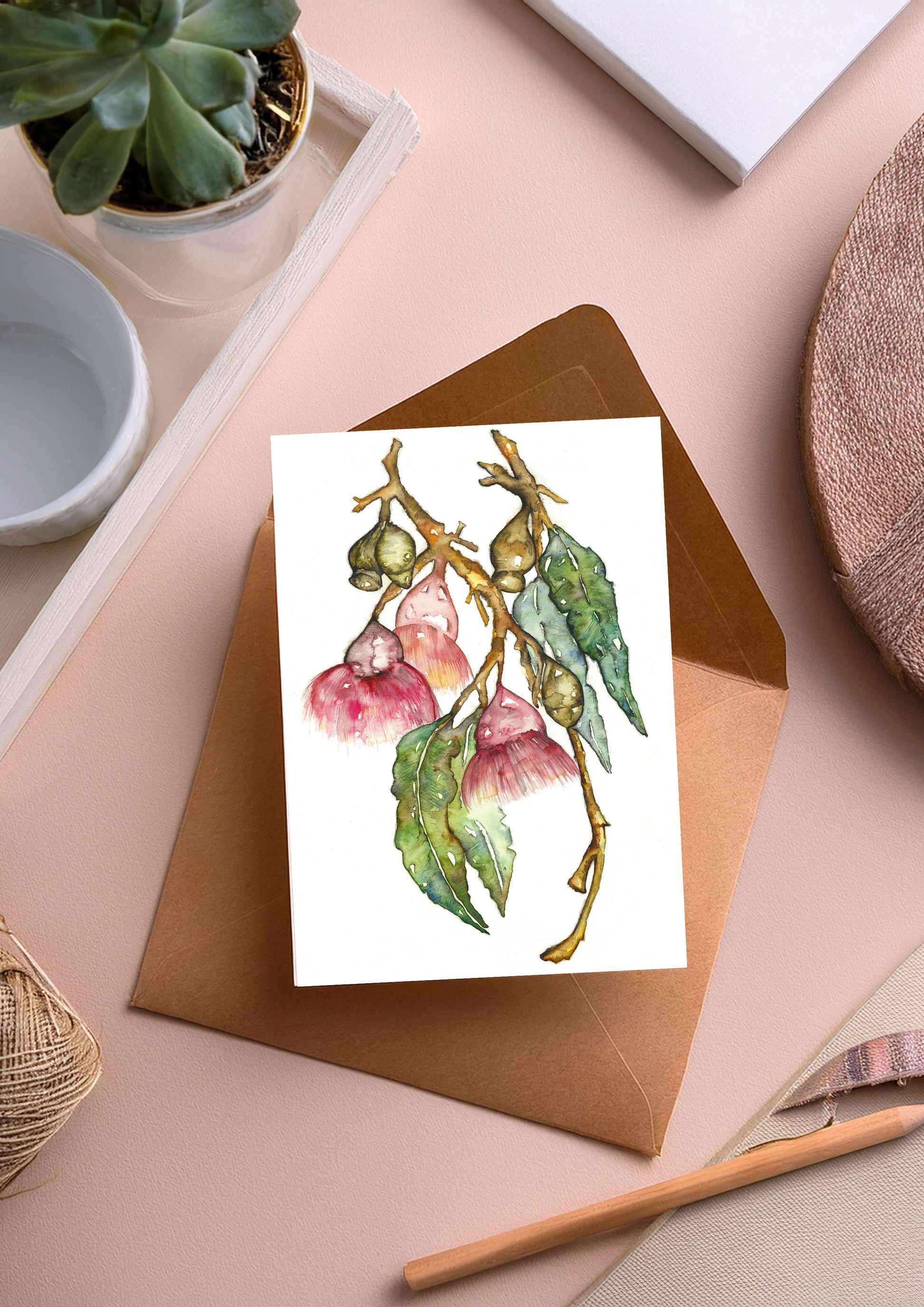 This greeting card features the raw beauty of the Australian bush. This watercolour art card showcases delicate gum leaves and native wildflowers, hand-painted in vibrant, earthy tones. Each brushstroke captures the organic flow and unique textures of our native flora.