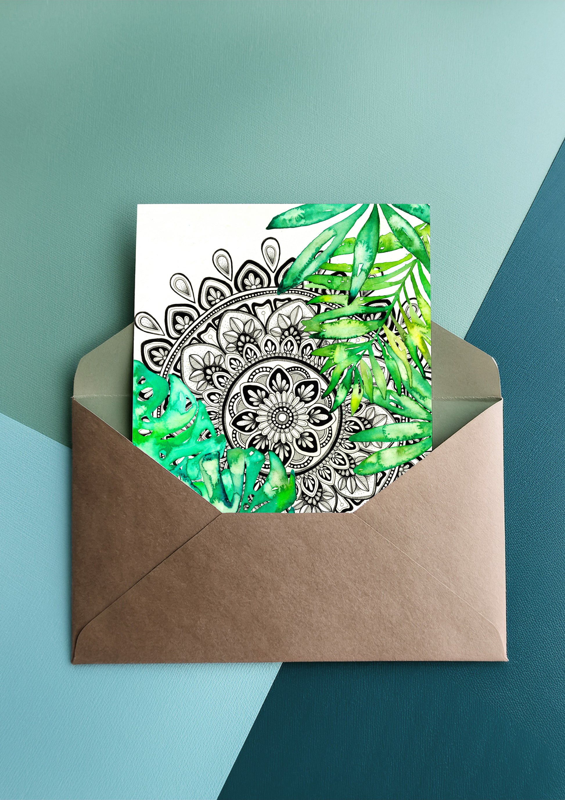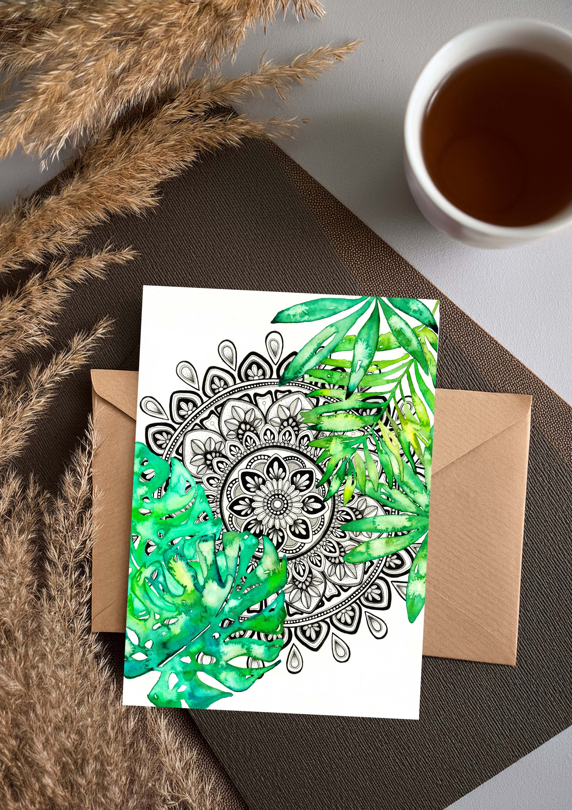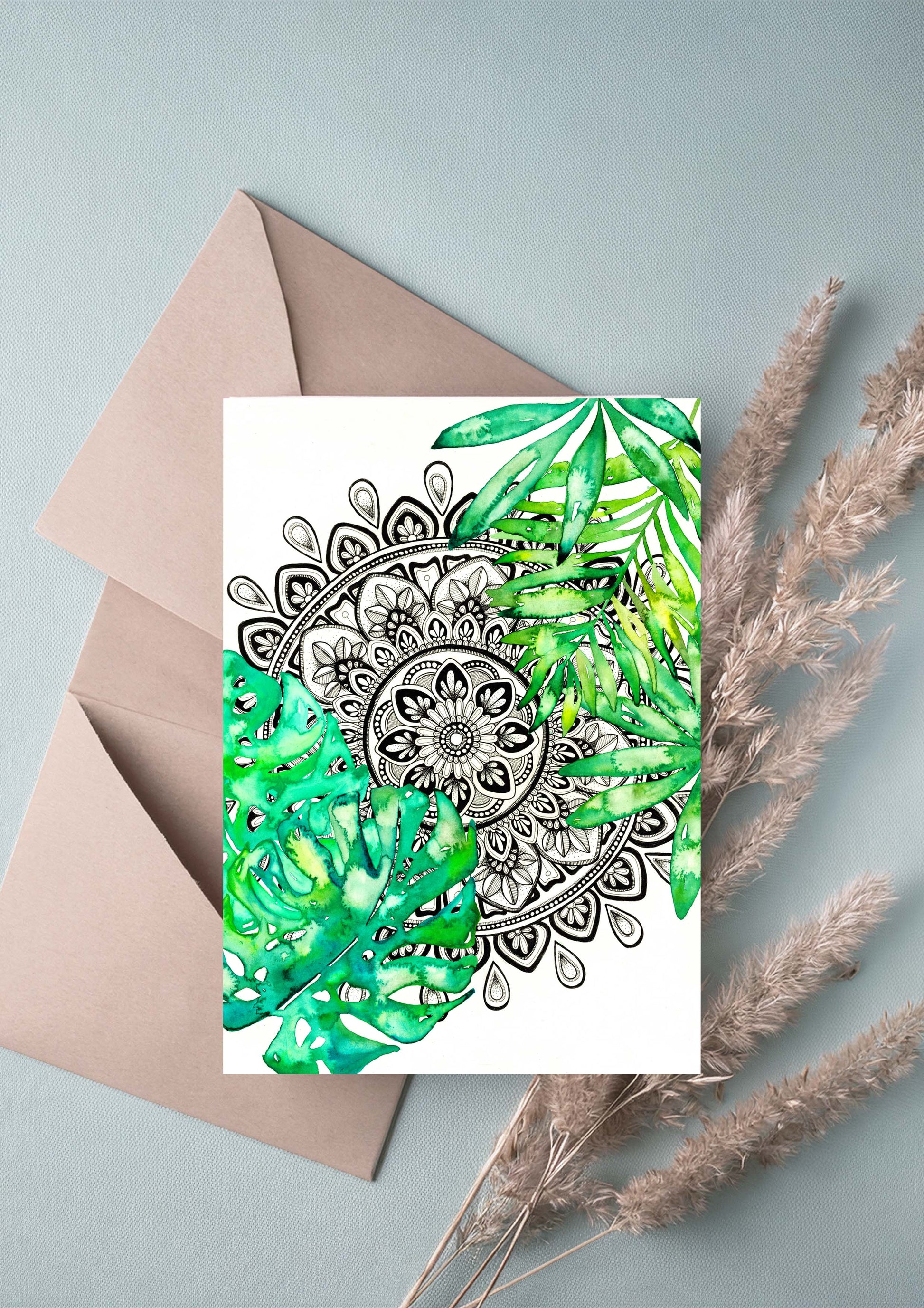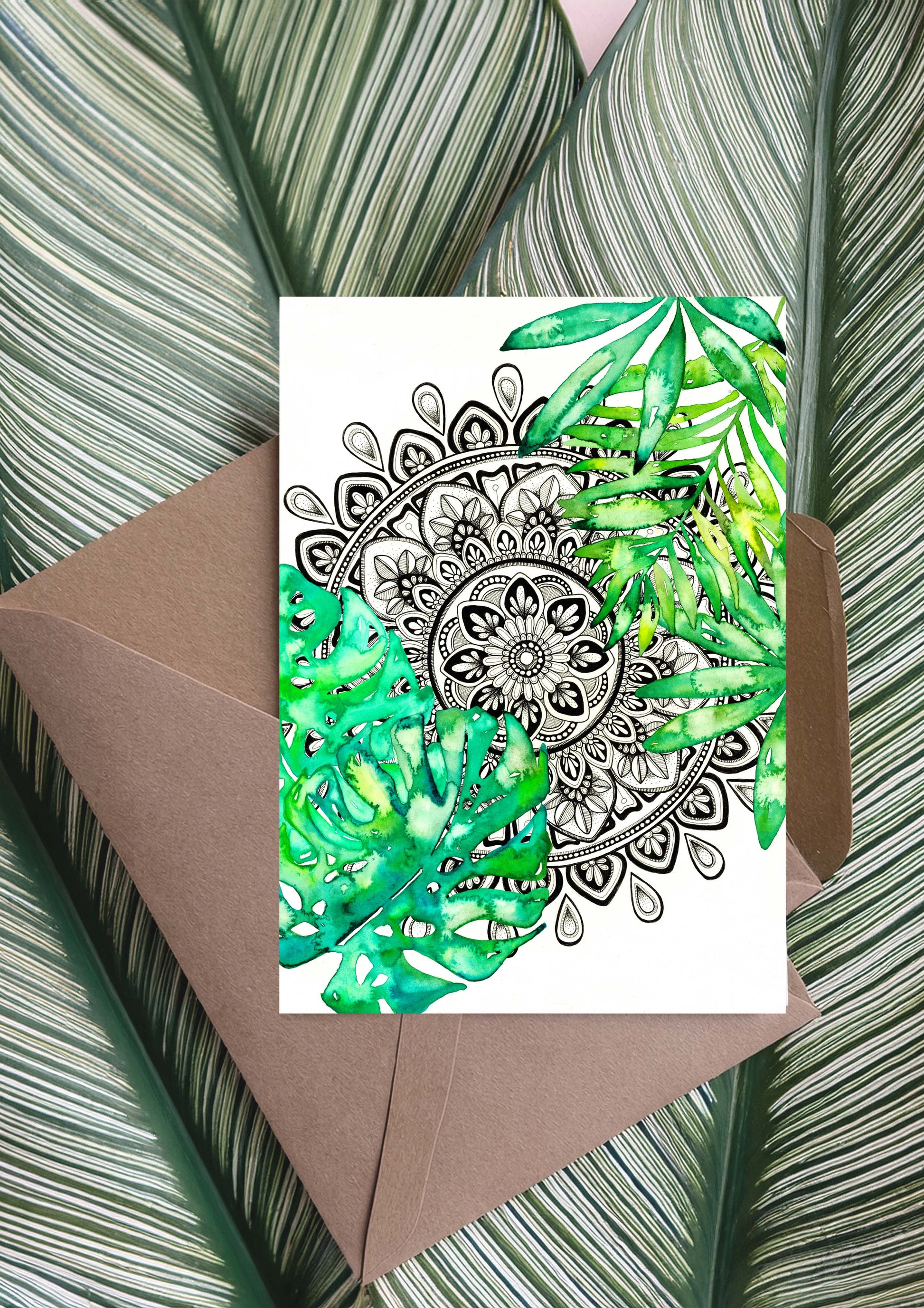This greeting card features the calming fusion of detail and nature, this hand-drawn black and white mandala is surrounded by soft watercolour Monstera leaves and tropical foliage. The intricate penwork invites stillness, while gentle green hues create an organic, fresh feel.