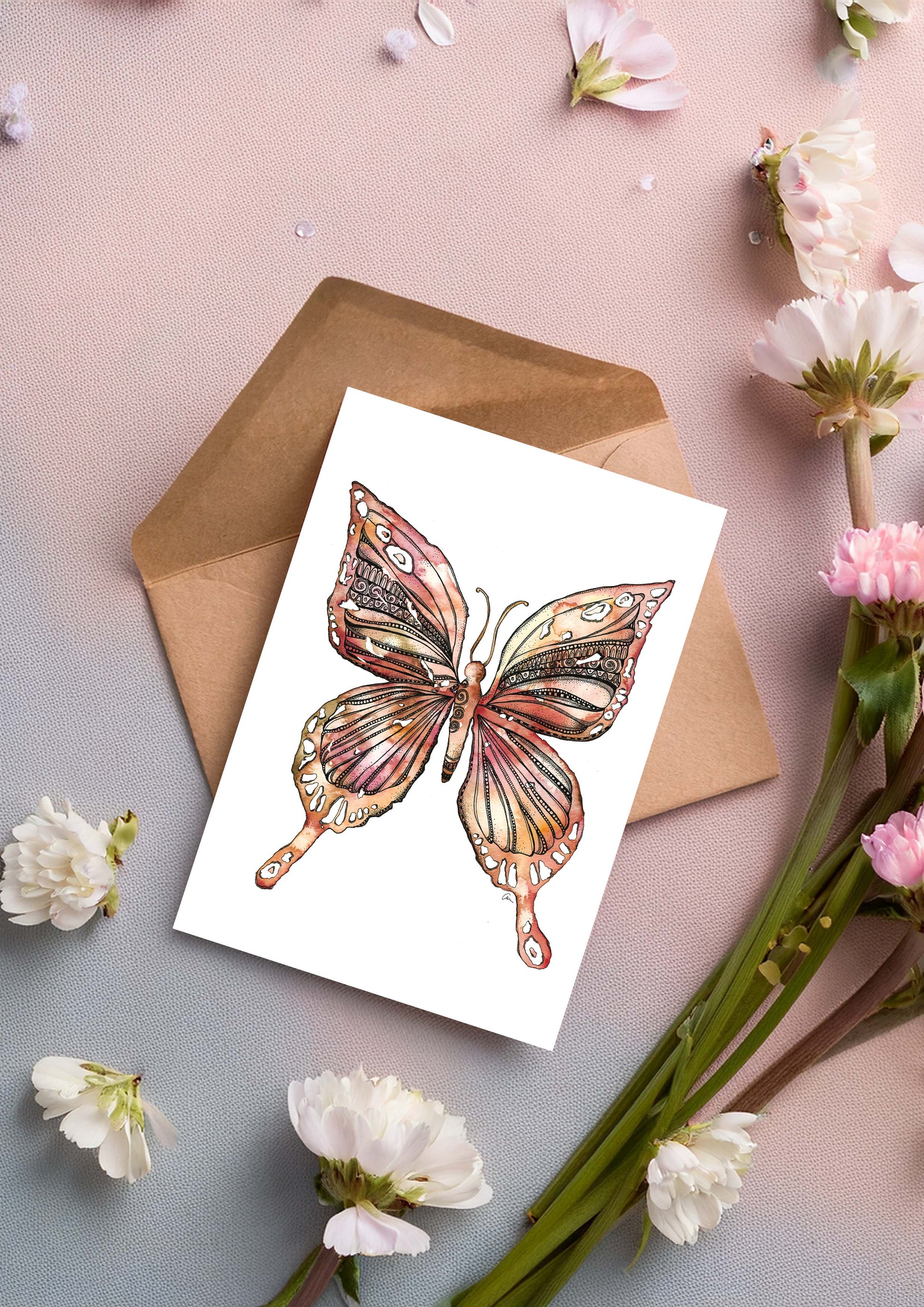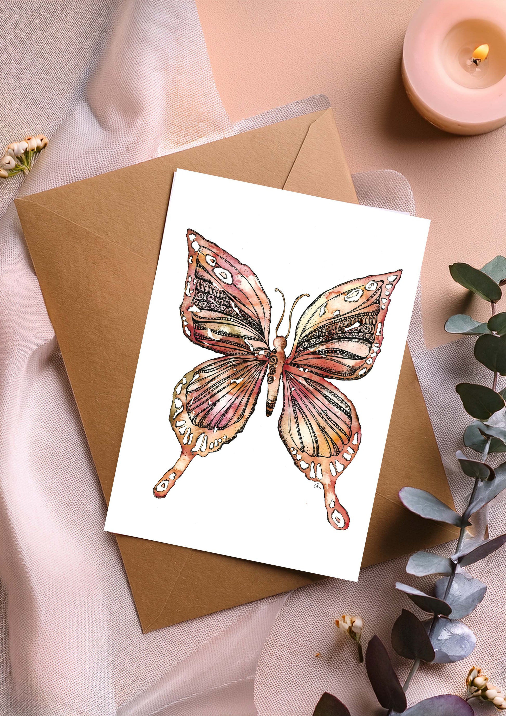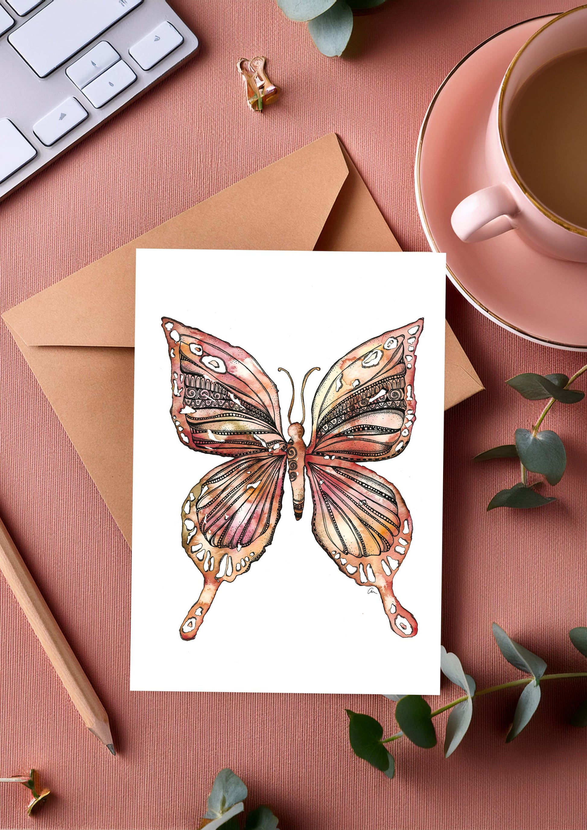 This greeting card features a butterfly, hand-painted in watercolour with shades of earthy pink and soft brown, and finished with fine black mandala details.