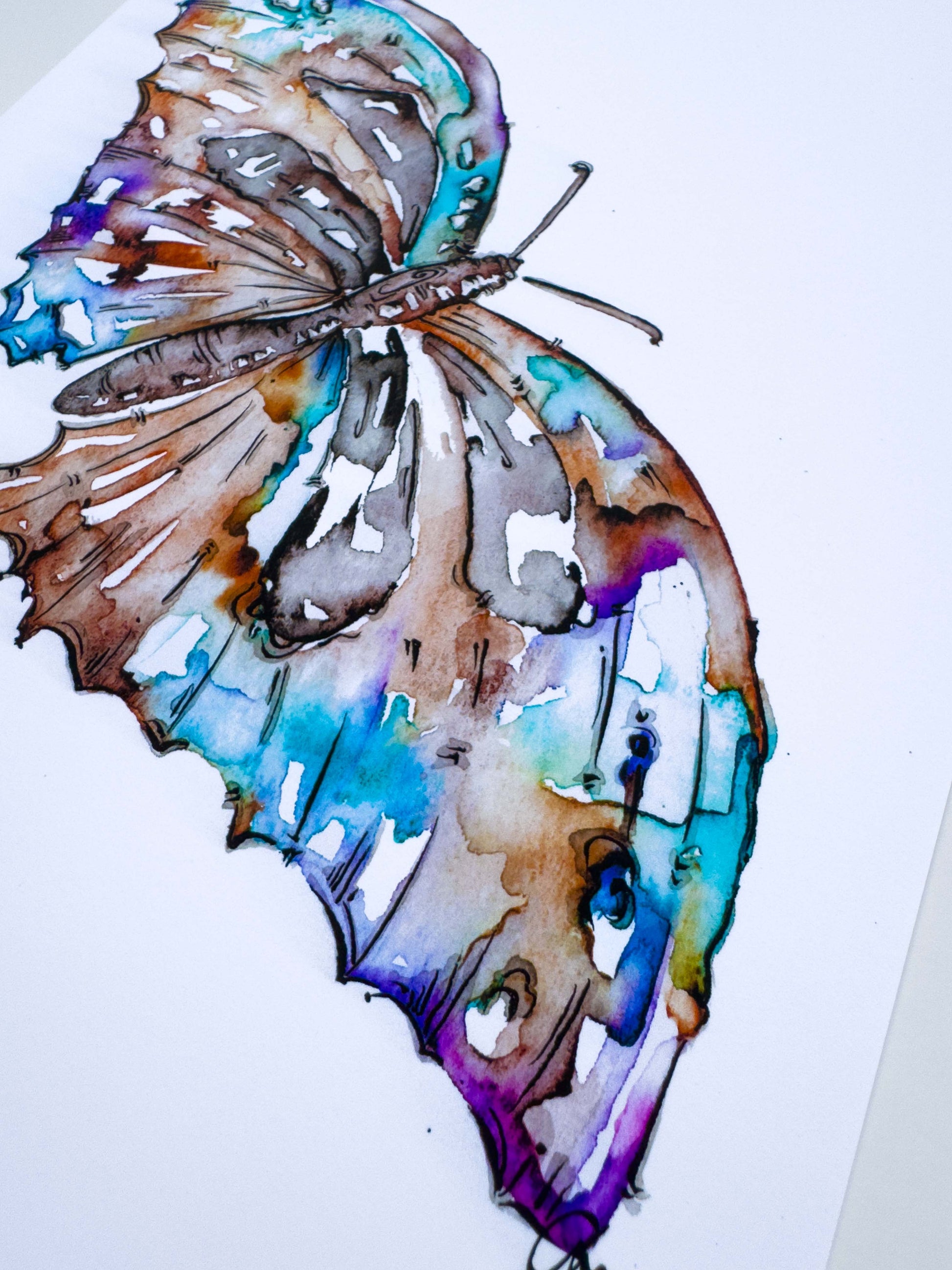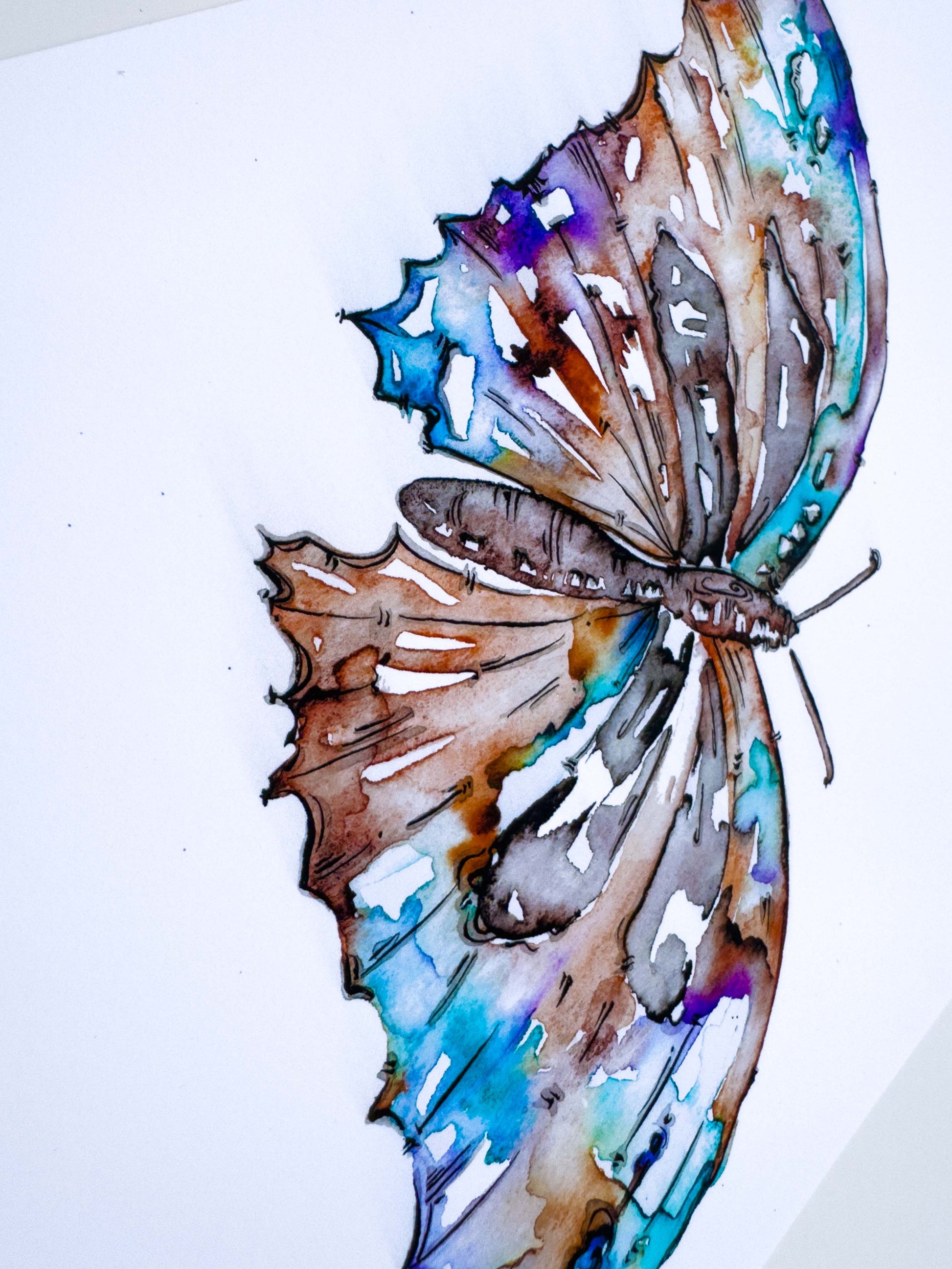 This butterfly watercolour features a delicate blend of purple, blue, and soft brown hues, brought to life with intricate black ink detailing. The combination of flowing colour and fine linework captures the graceful movement and quiet strength of the butterfly, making it a striking yet gentle addition to any space.