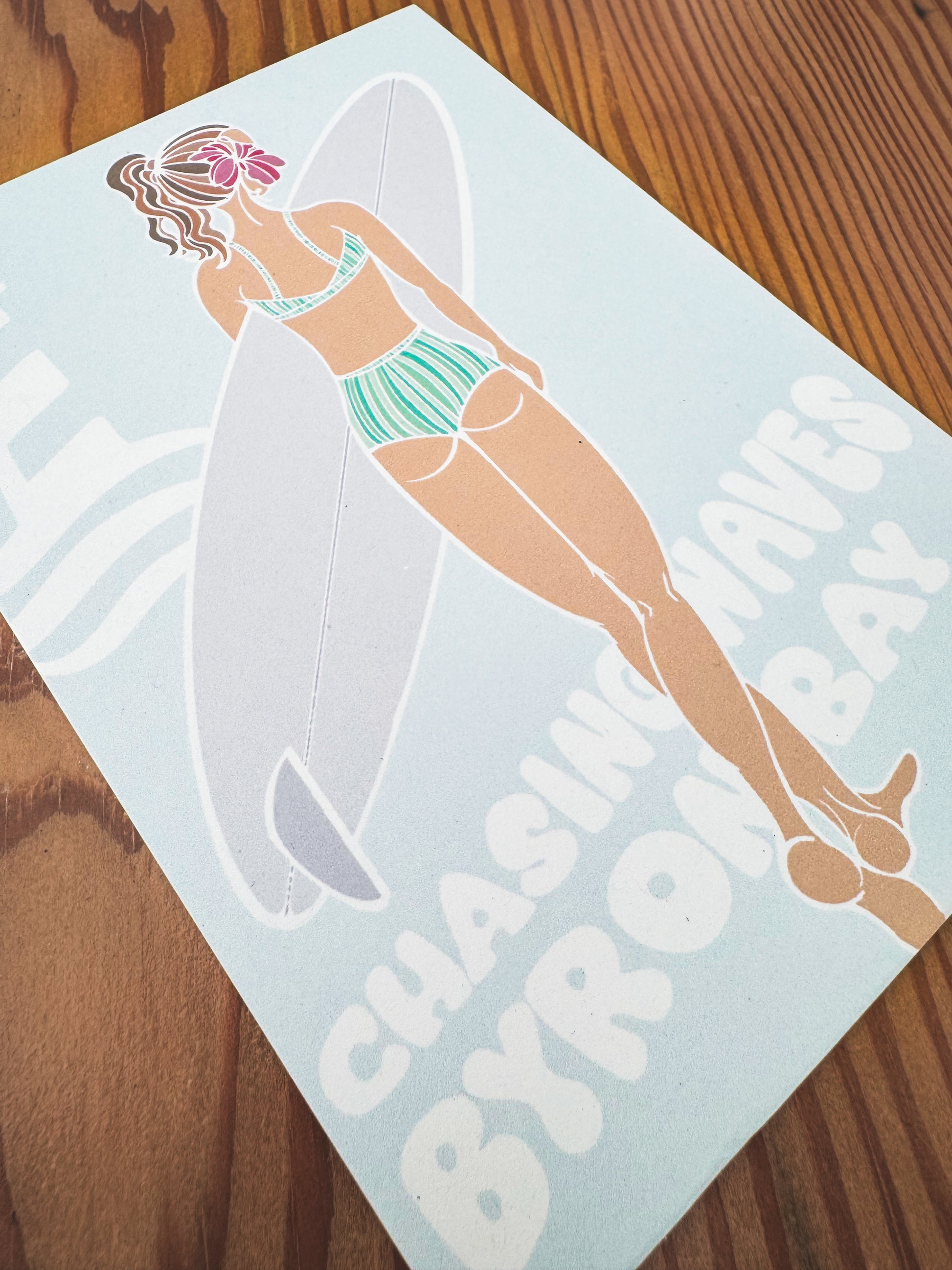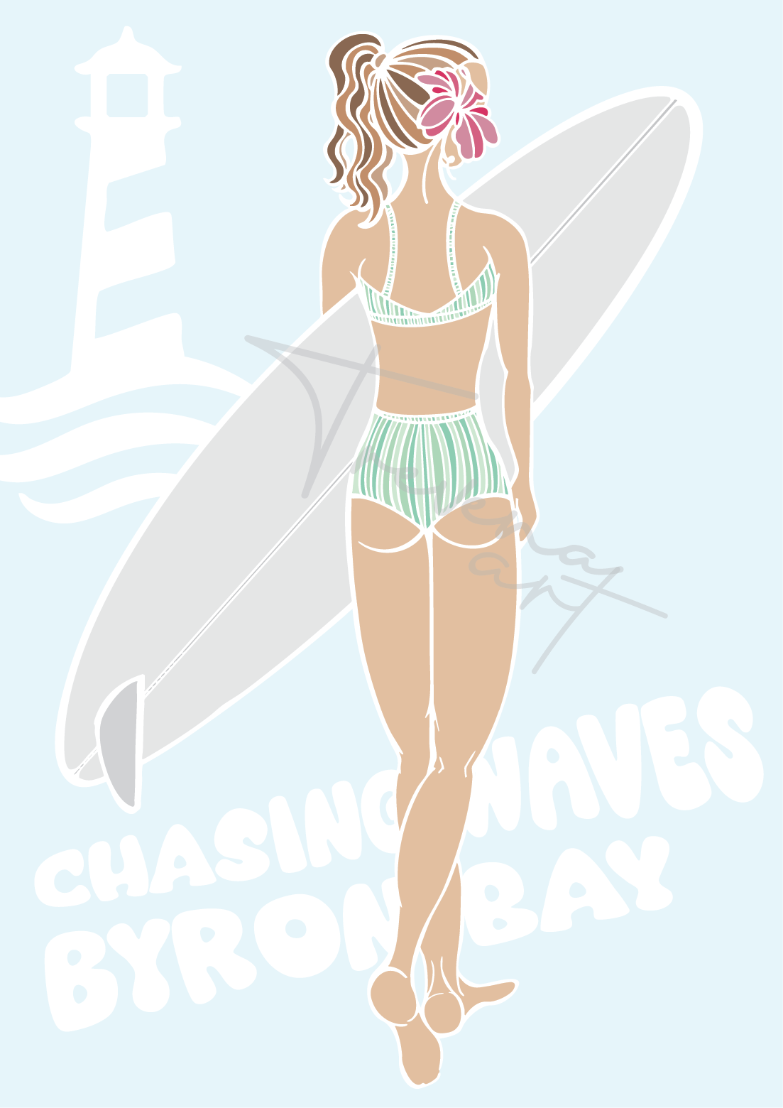 Inspired by the magic of chasing waves in Byron Bay — where Byron's oceans energy meets the spirit of girls who surf. With pastel tones and soft textures, this digitally hand drawn piece captures the balance between fierce determination and feminine softness.