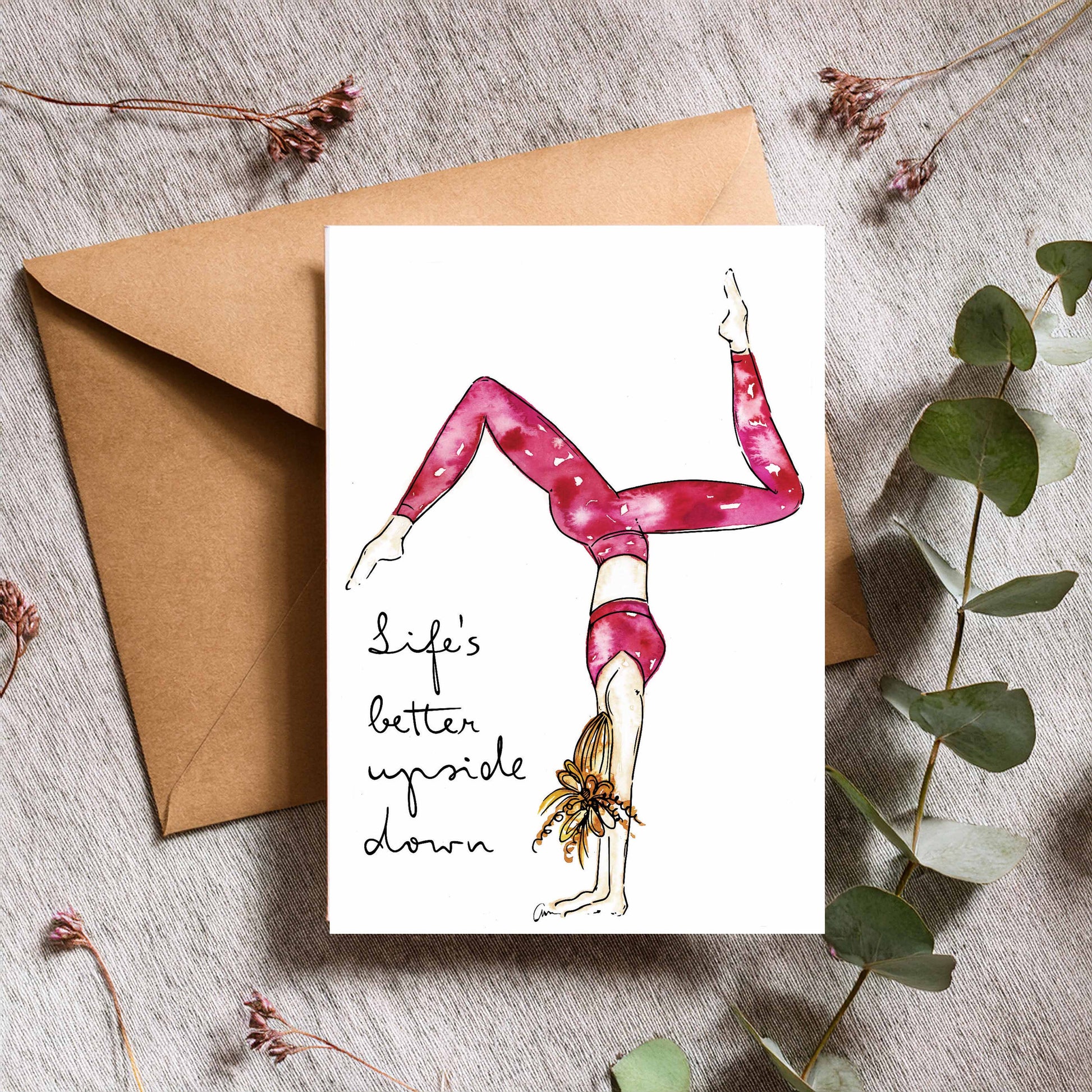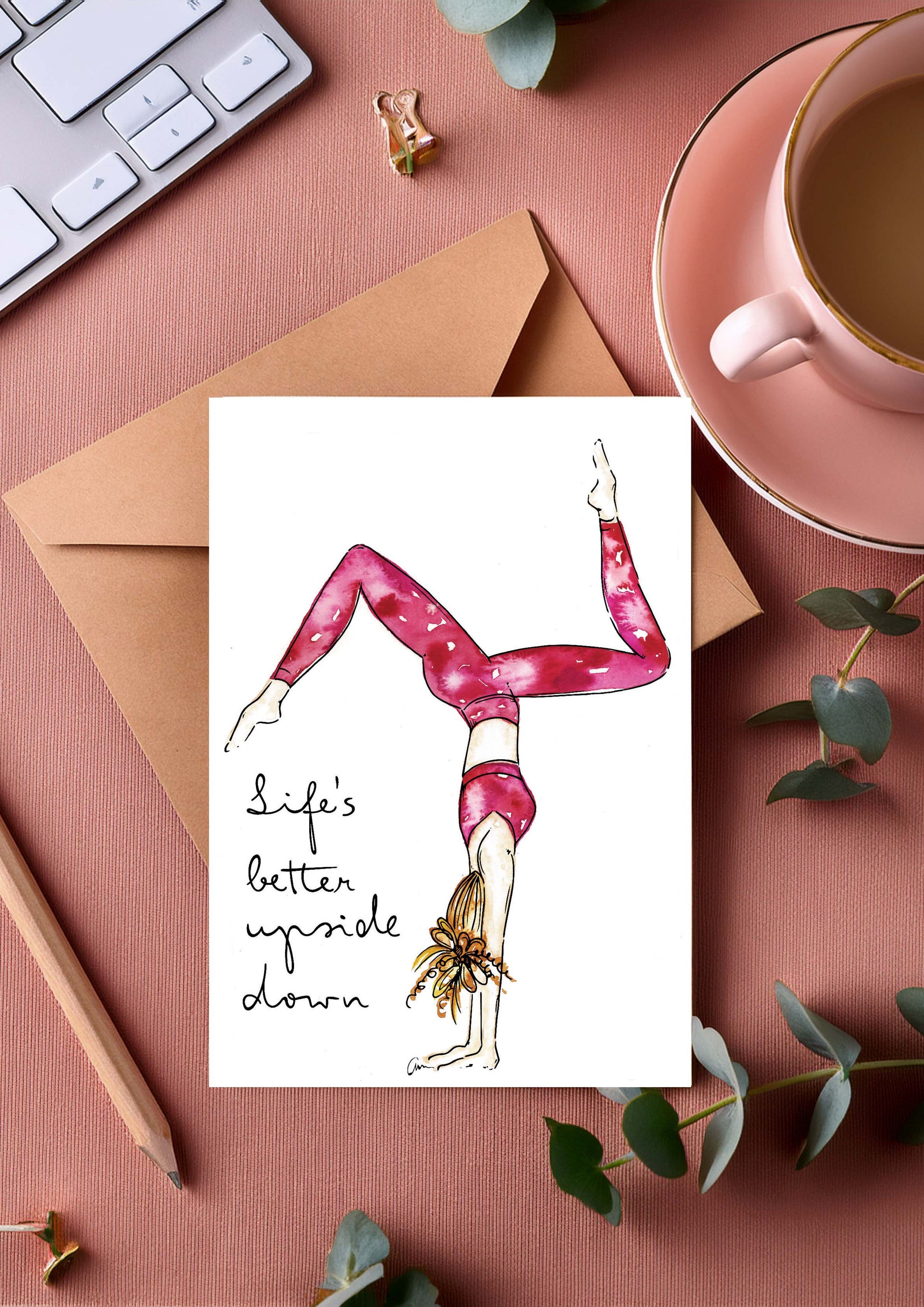 This inspiring greeting card showcases a graceful handstand yoga pose illustrated in vibrant watercolour, capturing strength, balance, and focus. Accompanied by the uplifting quote “Life’s better upside down,” it’s a beautiful reminder to embrace new perspectives and find joy in the unexpected.