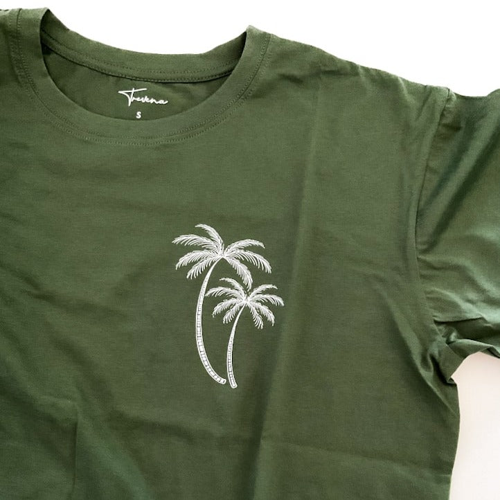 This tee is a regular men’s cut t-shirt with a hand drawn palm tree logo front print. The soft feel deep army green fabric is wearable in all occasions.