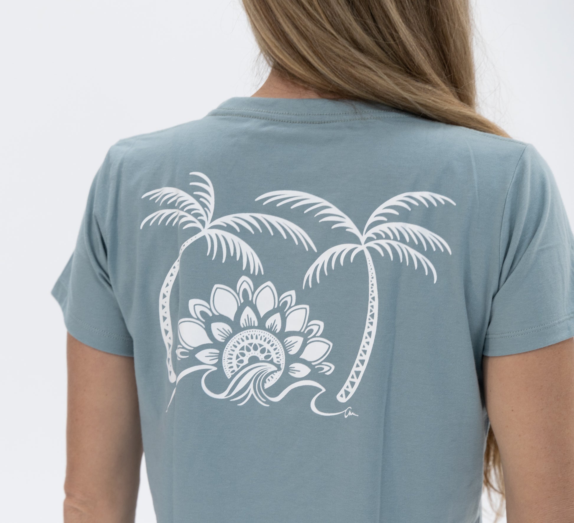 These cropped, comfy 100% cotton go-with-anything tee has a hand drawn palm tree, mandala sun and waves back print pattern. Wearable from workouts to weekend errands the soft green hue is a perfect wardrobe staple.