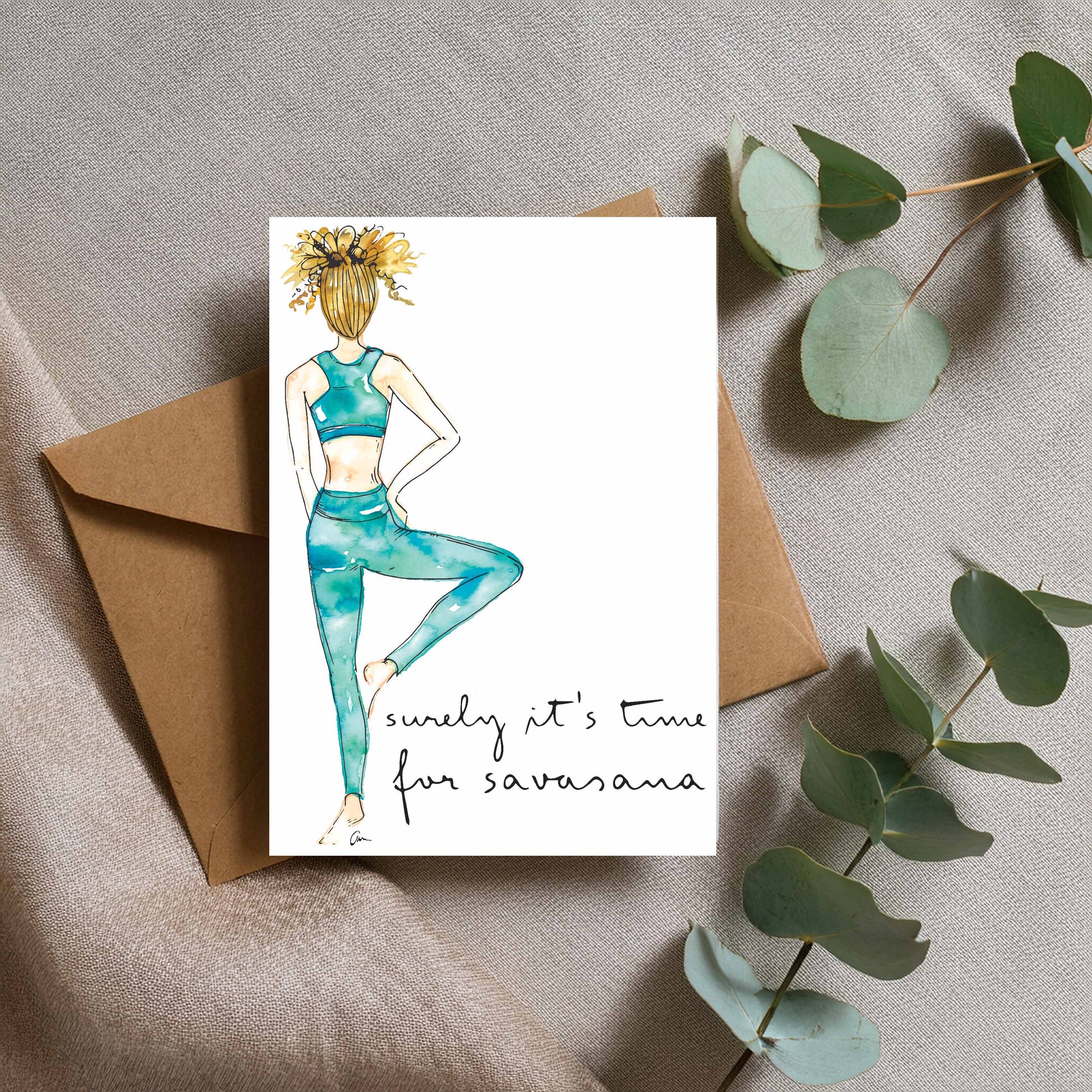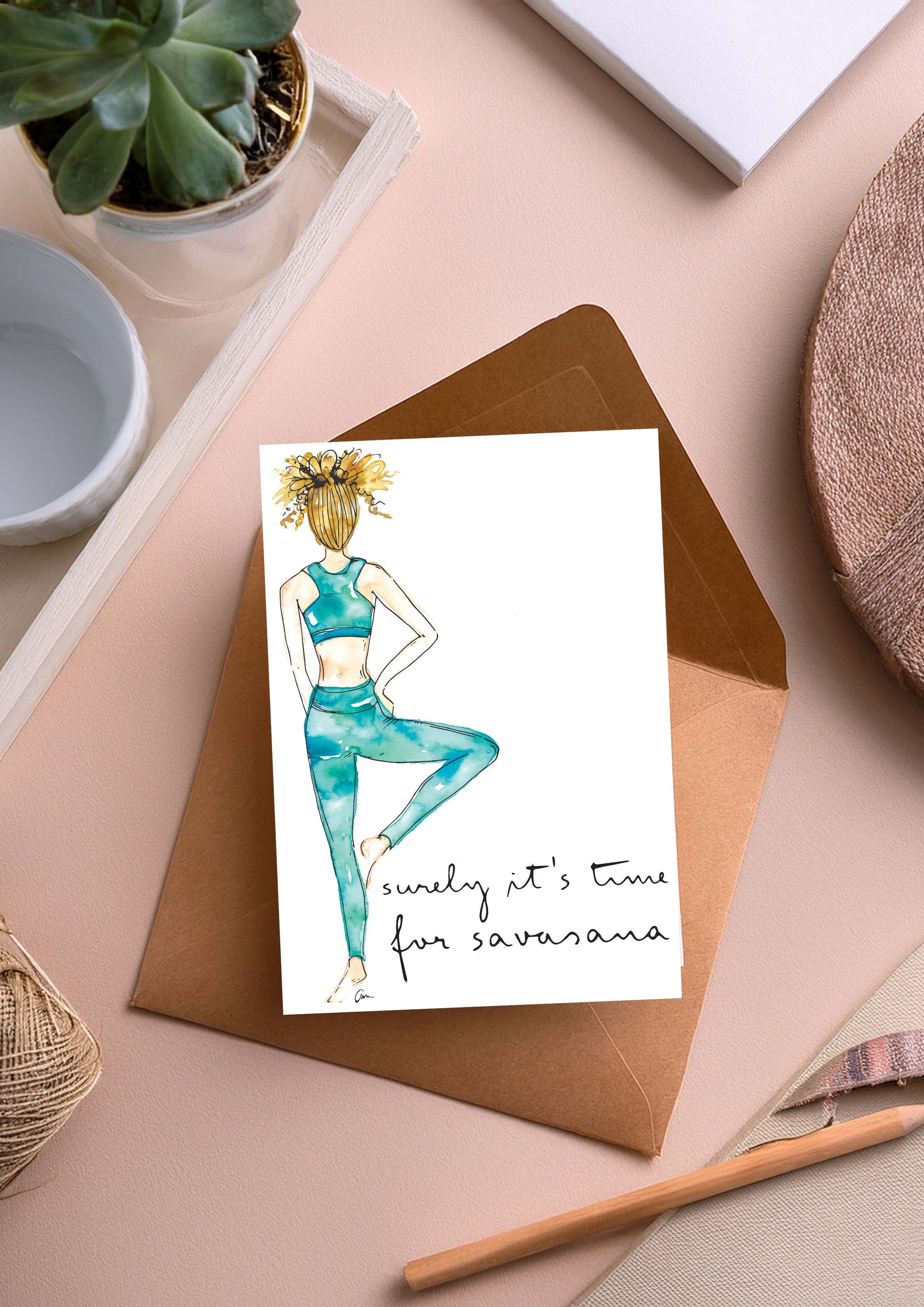 This playful greeting card features a delicate watercolour illustration of the Tree Pose (Vrikshasana), symbolizing balance, strength, and grounded calm. Paired with the humorous quote, “Surely it’s time for Savasana,” it reminds us how often we wish to skip straight to the end rather than embracing the journey. A thoughtful reflection on life’s balance between rest and action, growth and ease.