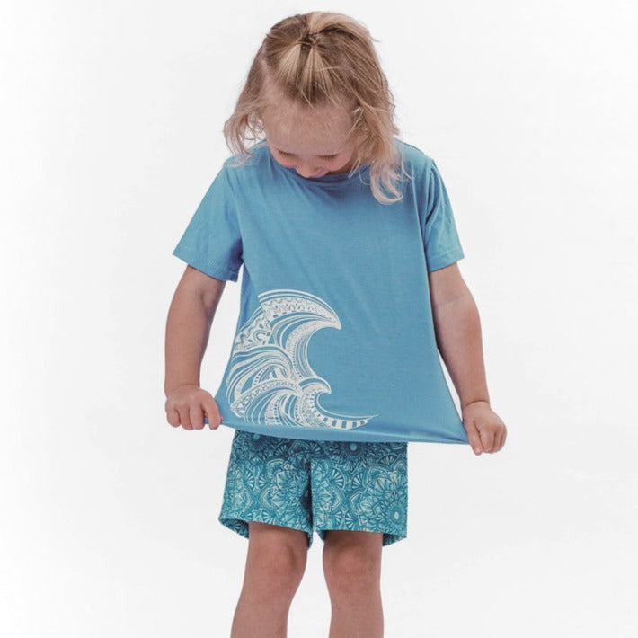This children tee is a regular cut with a hand drawn mandala wave front screen print in a vibrant blue hue.