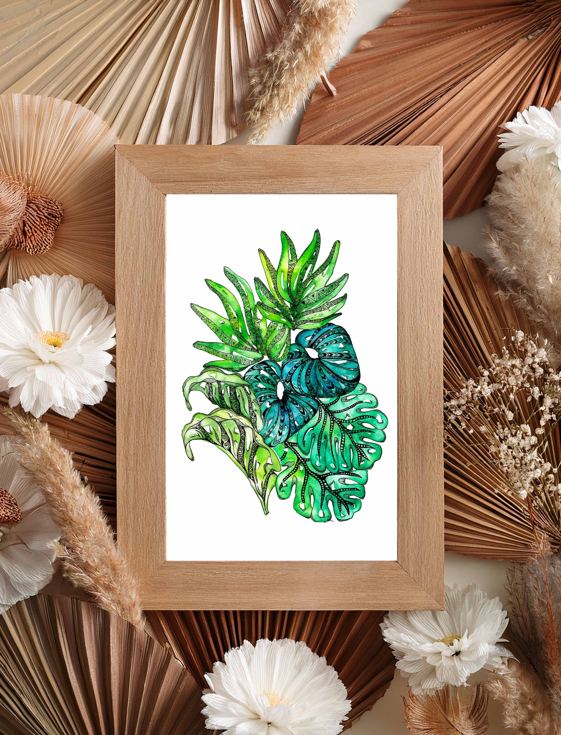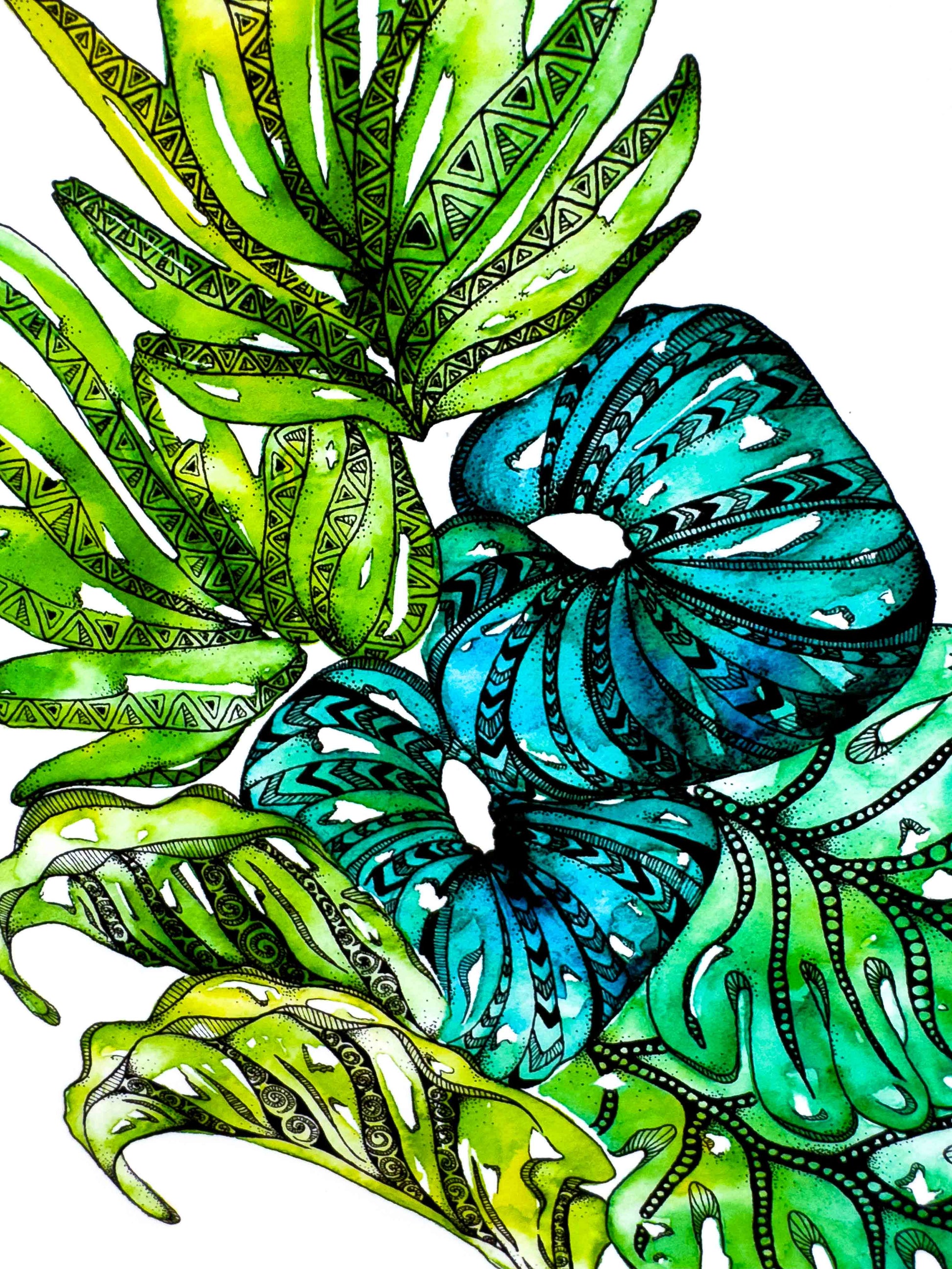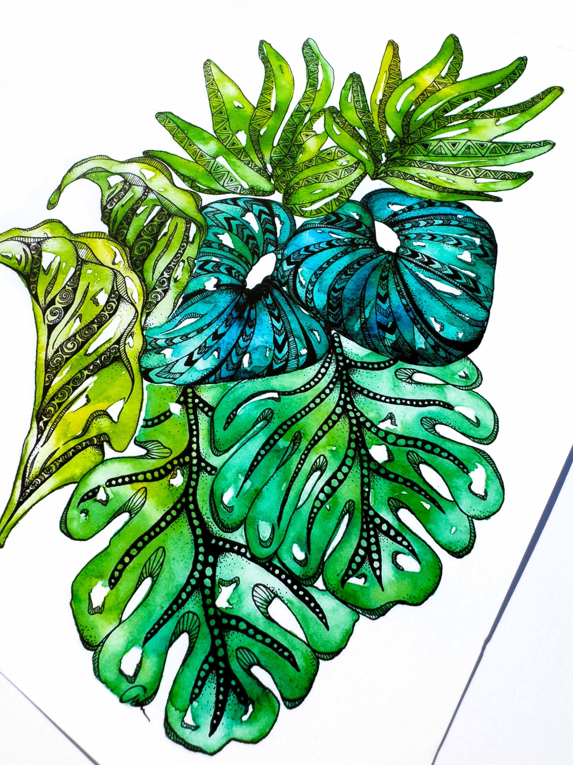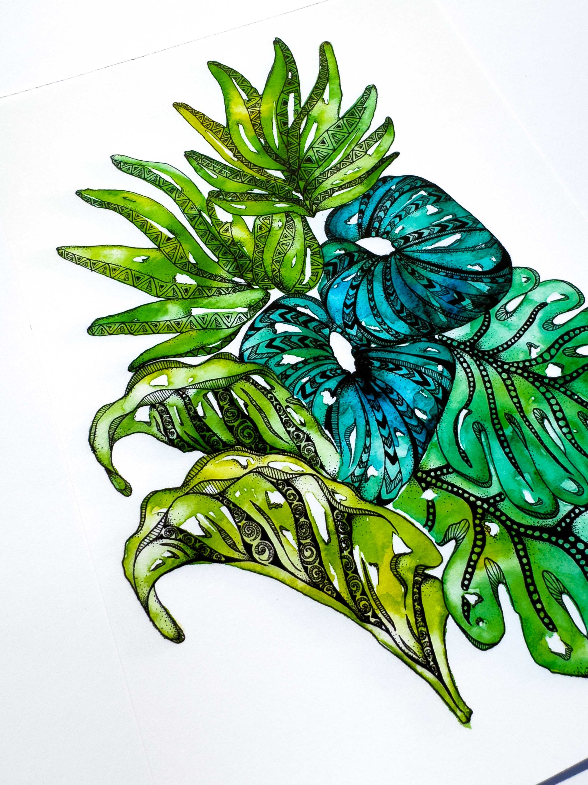 This tropical collage features a vibrant arrangement of hand-painted watercolour leaves, overlaid with delicate mandala-inspired geometric ink drawings. The blend of lush greenery and intricate linework brings a sense of harmony between nature and structure, creating a piece that feels both grounding and energising.