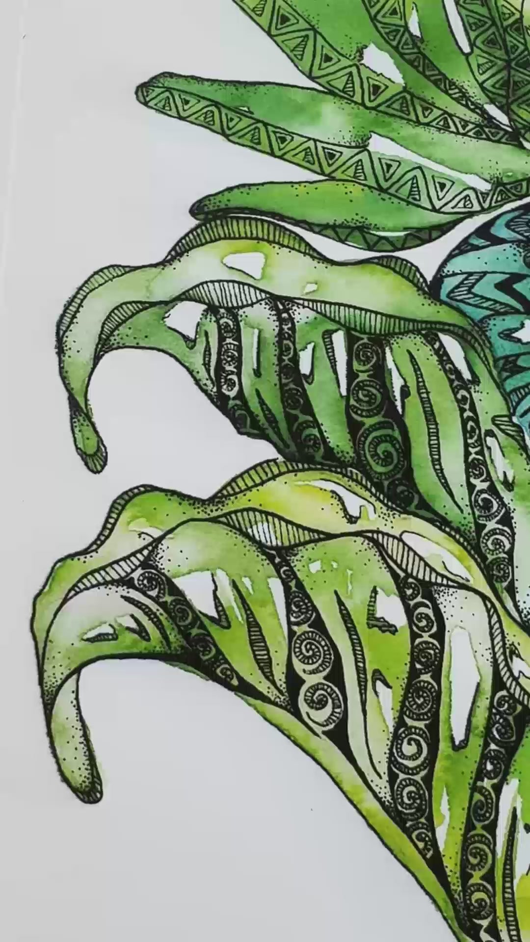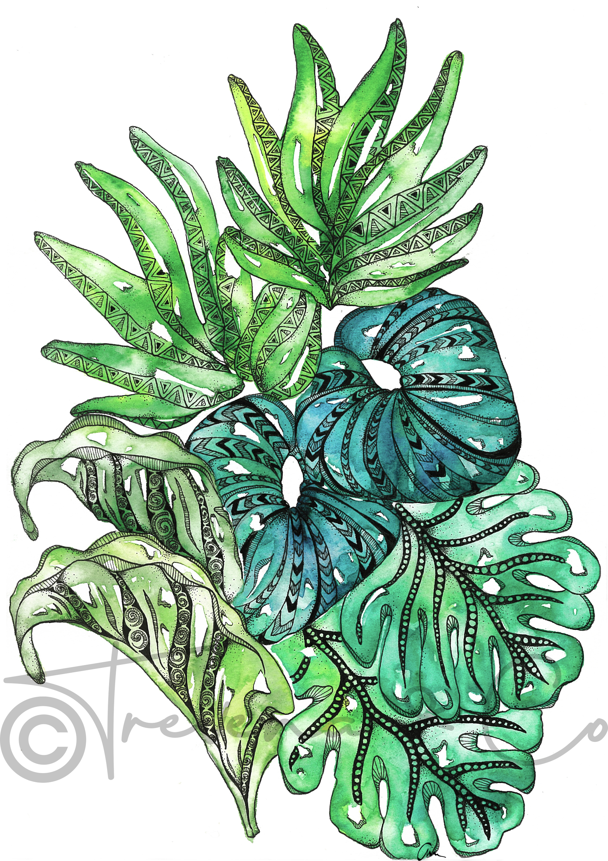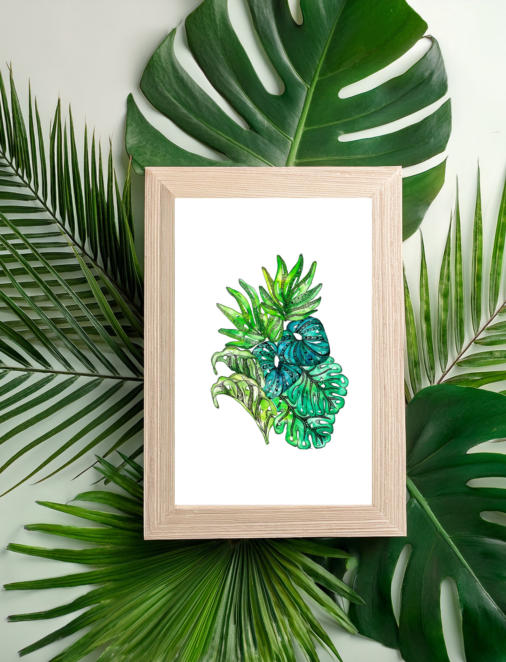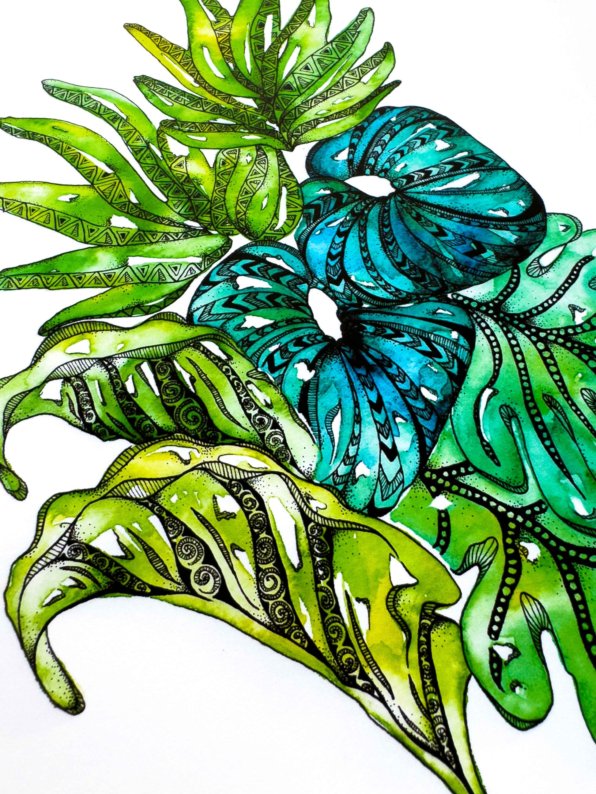 This tropical collage features a vibrant arrangement of hand-painted watercolour leaves, overlaid with delicate mandala-inspired geometric ink drawings. The blend of lush greenery and intricate linework brings a sense of harmony between nature and structure, creating a piece that feels both grounding and energising.