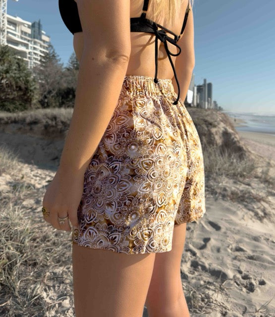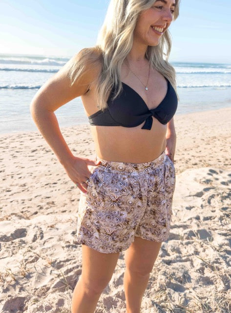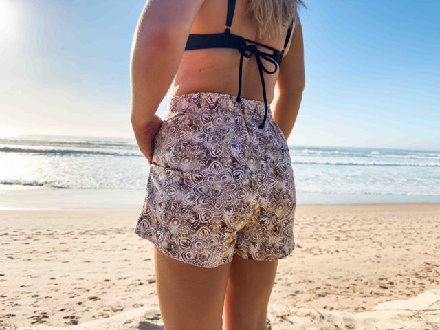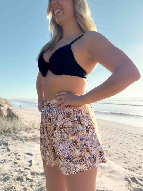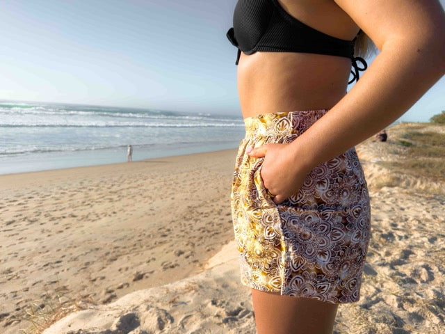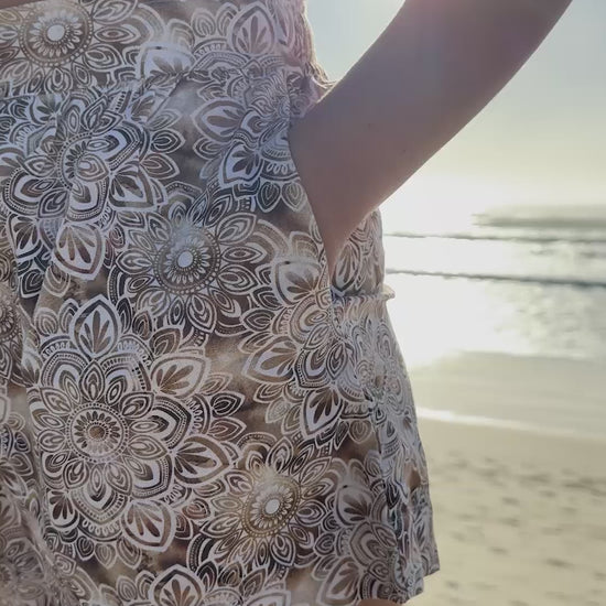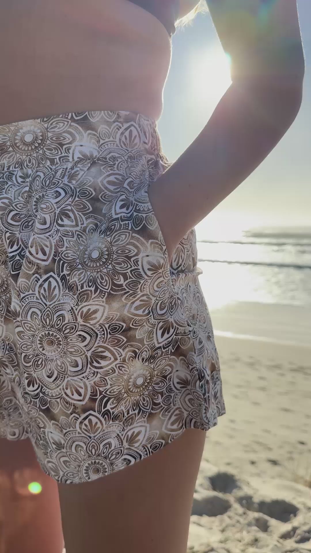 Linen Shorts - High Waisted Relaxed Pocket Shorts - Brown Watercolour Patterned Mandala Print