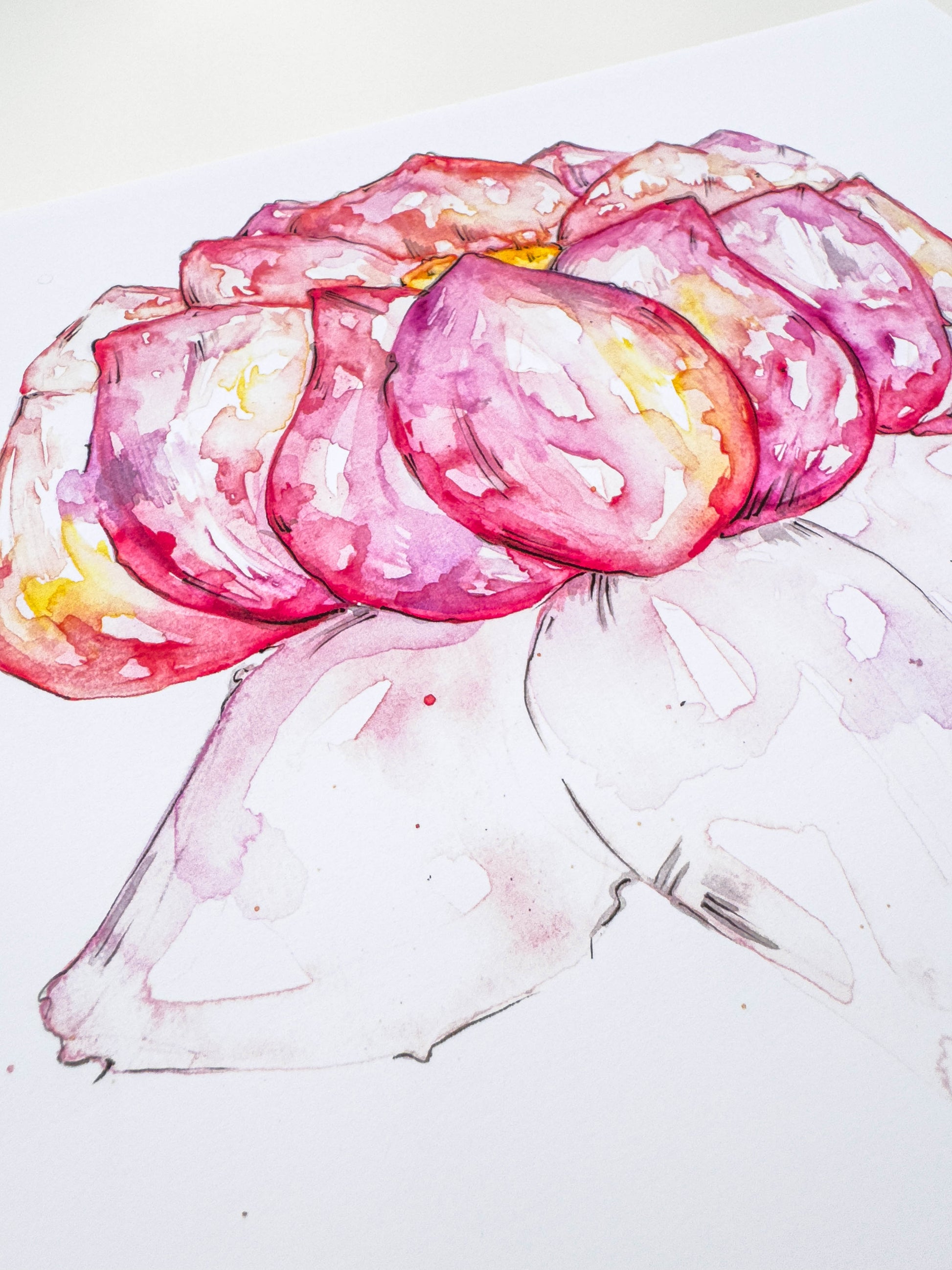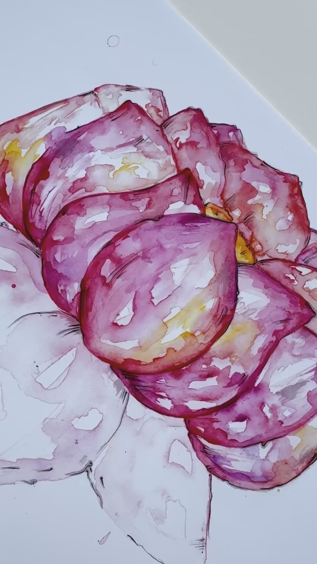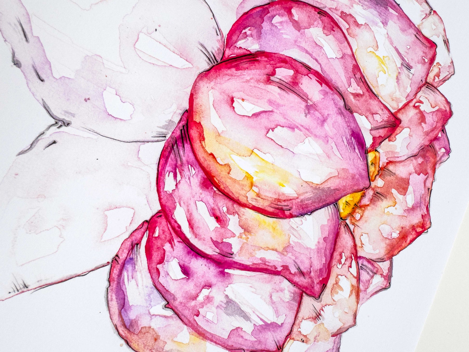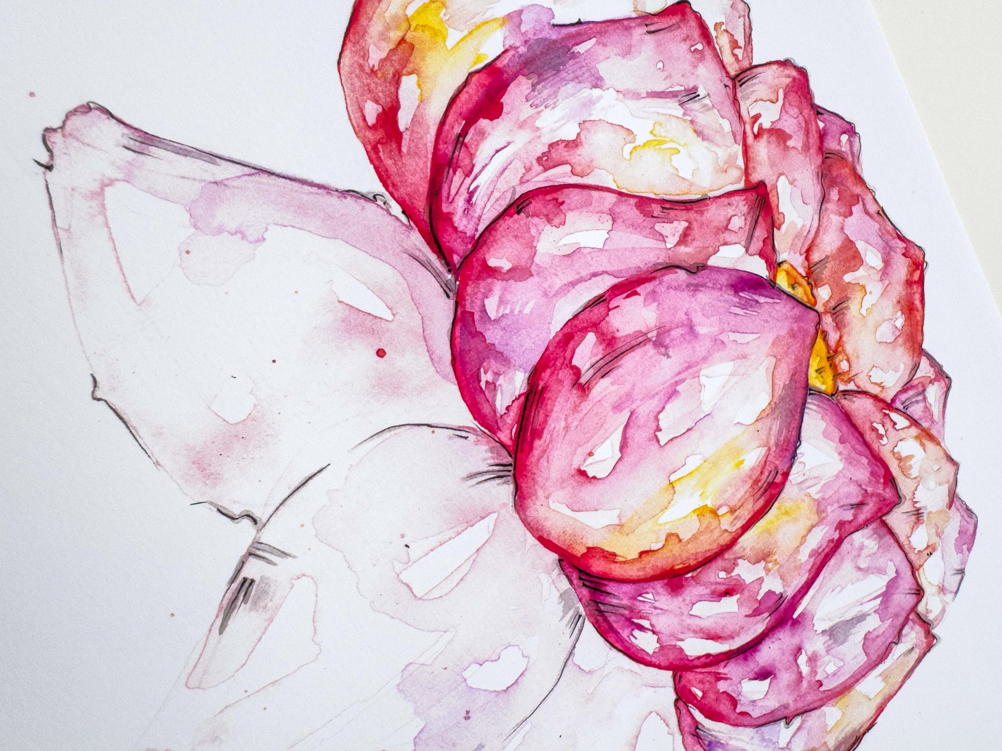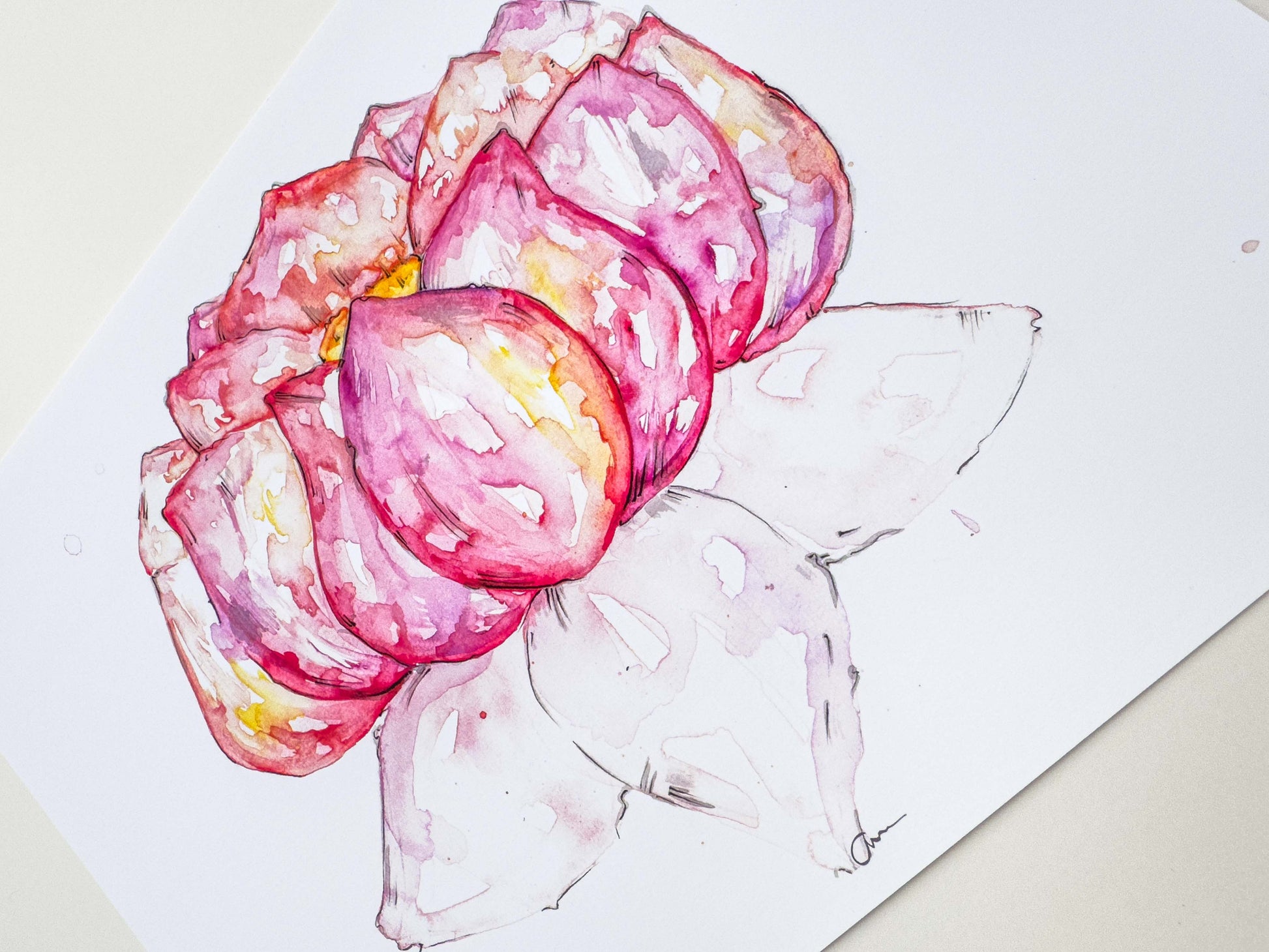 Delicate yet bold, this lotus-inspired artwork features flowing watercolour in shades of pink, red, and purple with hints of yellow, brought to life through intricate black ink linework — a symbol of growth, resilience, and beauty emerging from stillness.