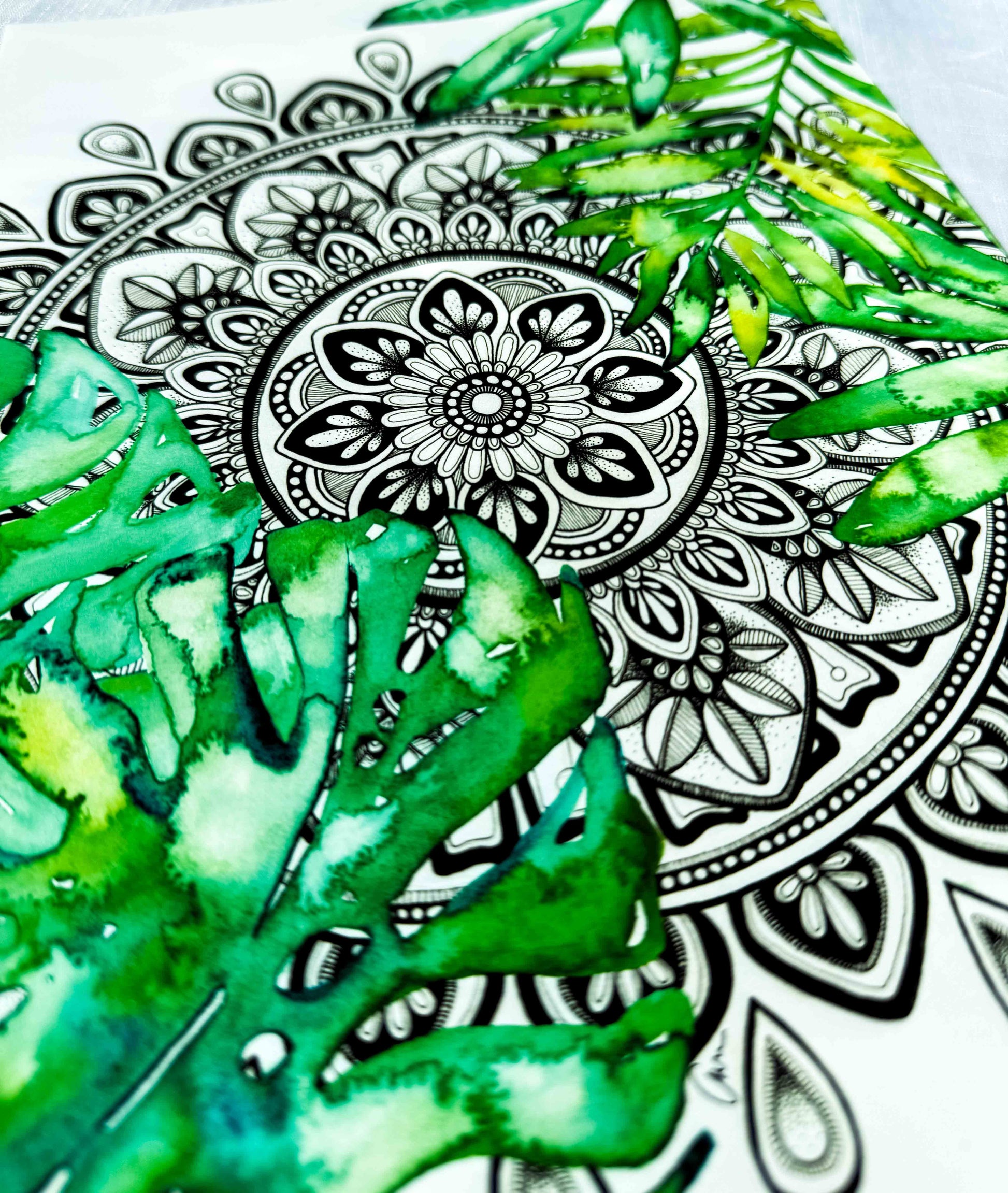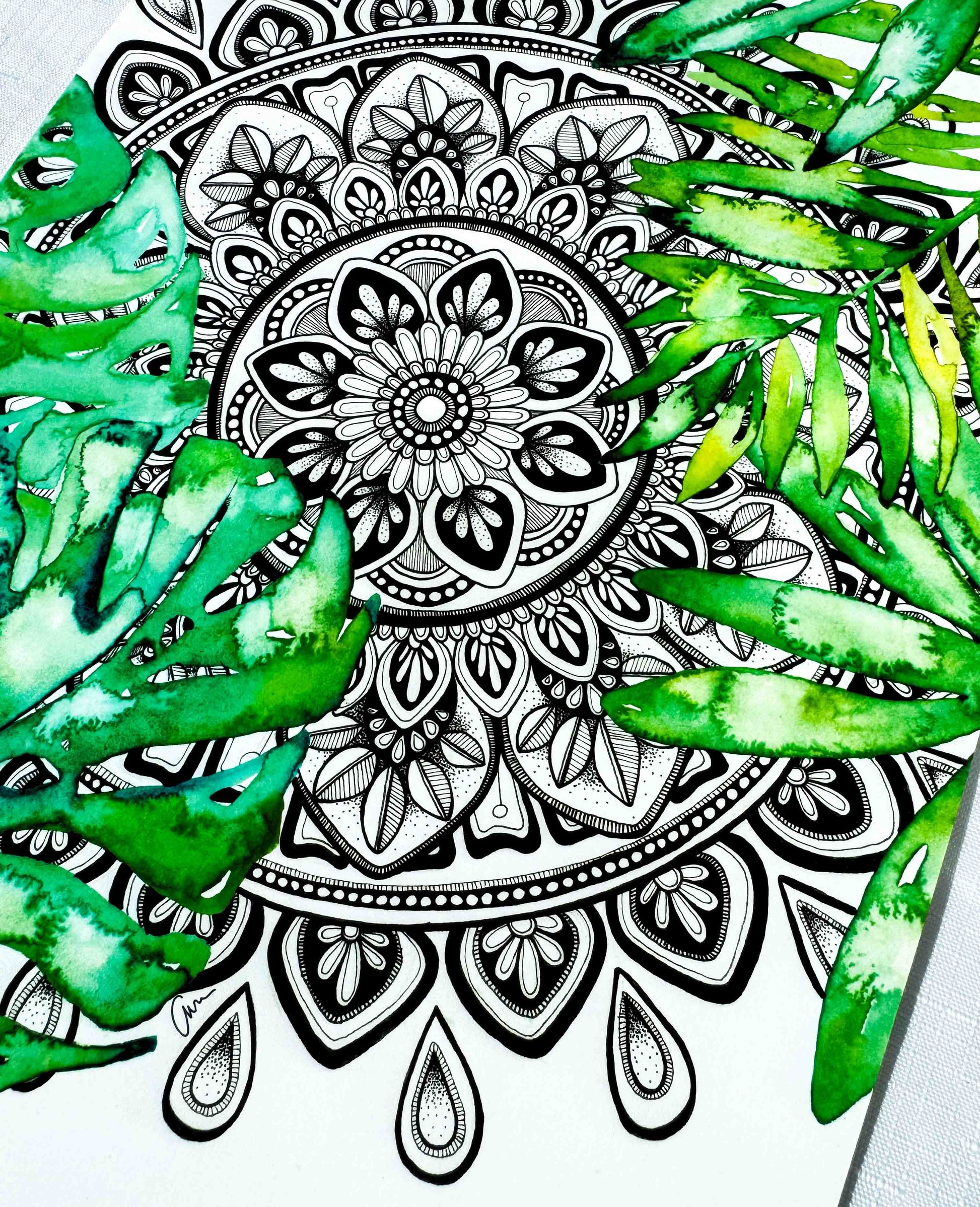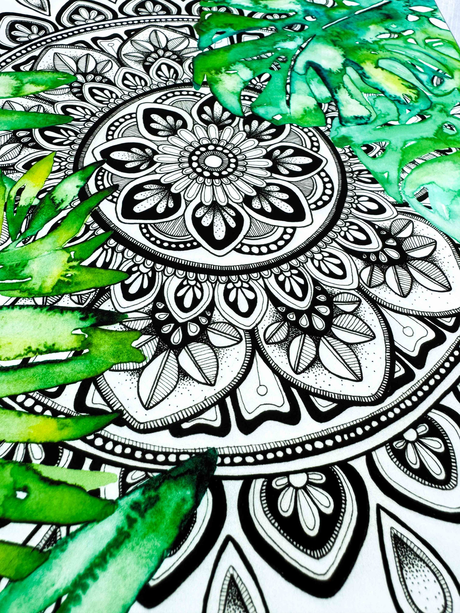 A calming fusion of detail and nature, this hand-drawn black and white mandala is surrounded by soft watercolour Monstera leaves and tropical foliage. The intricate penwork invites stillness, while gentle green hues create an organic, fresh feel.