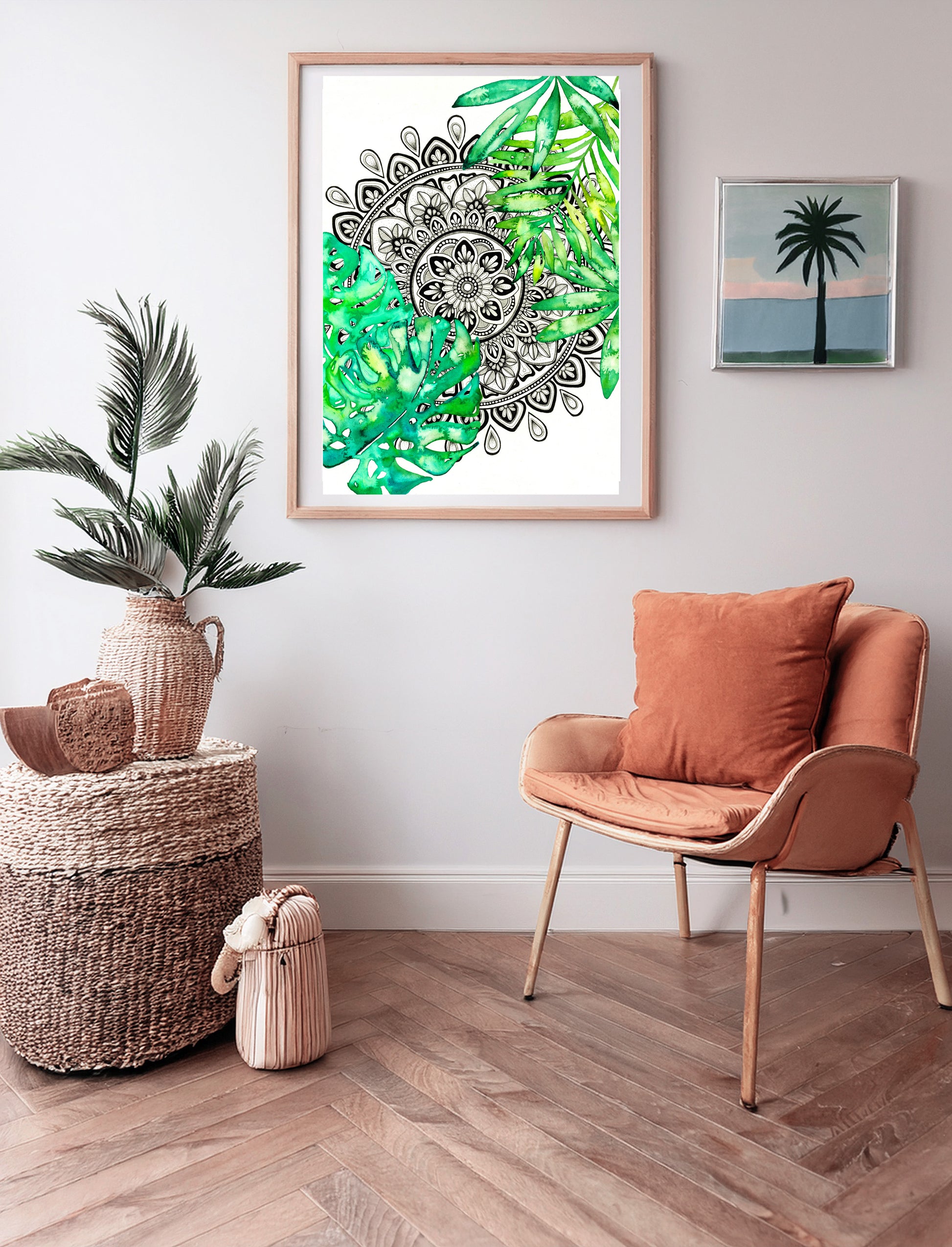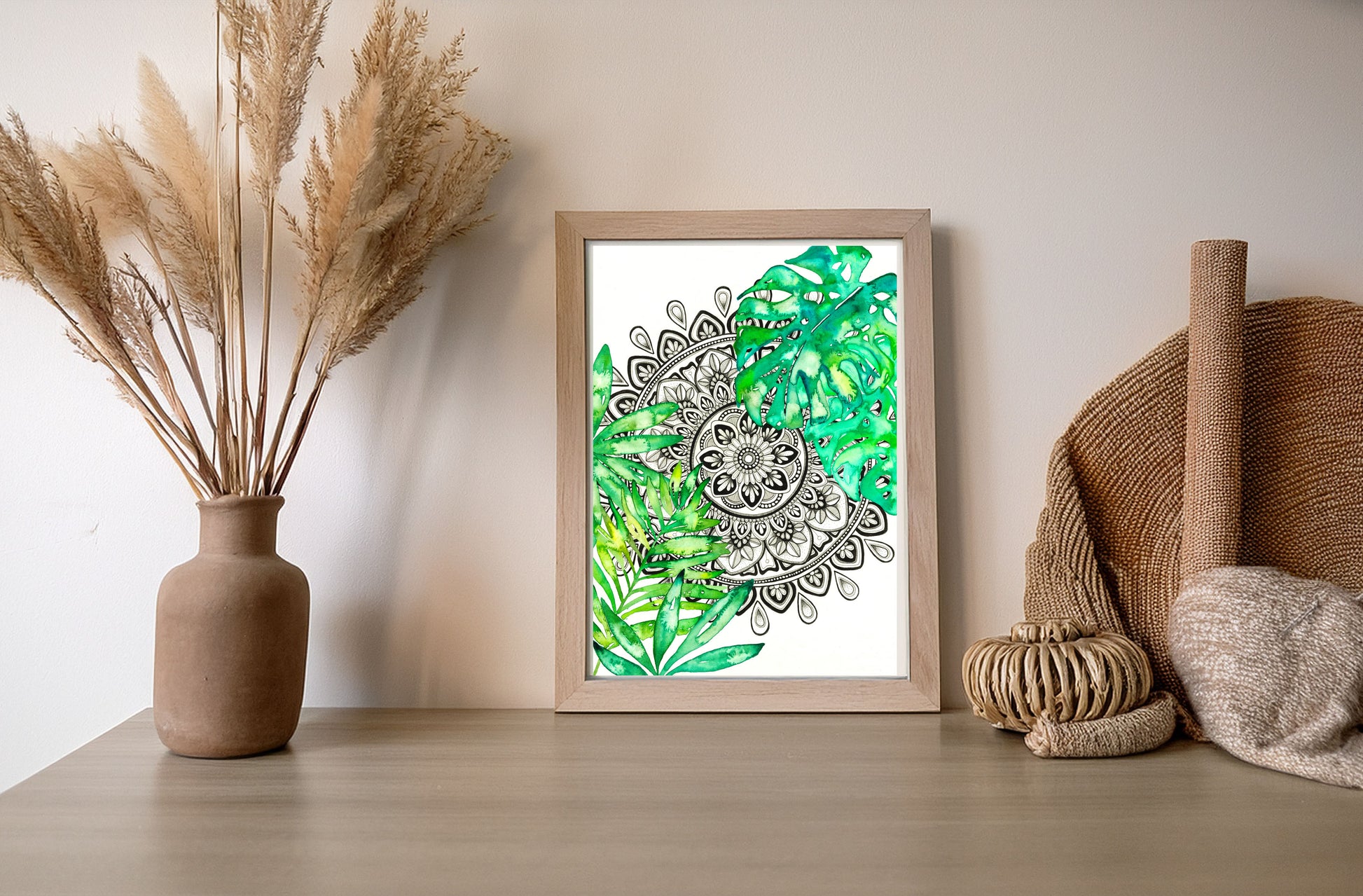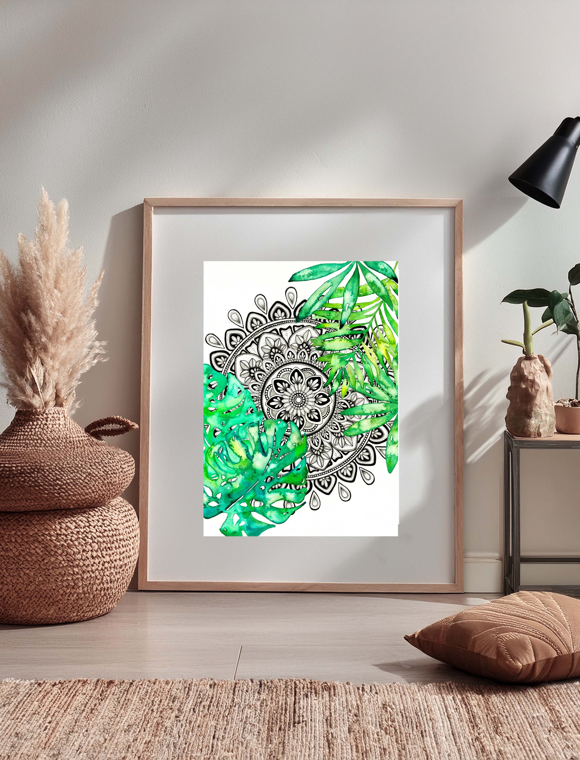 A calming fusion of detail and nature, this hand-drawn black and white mandala is surrounded by soft watercolour Monstera leaves and tropical foliage. The intricate penwork invites stillness, while gentle green hues create an organic, fresh feel.