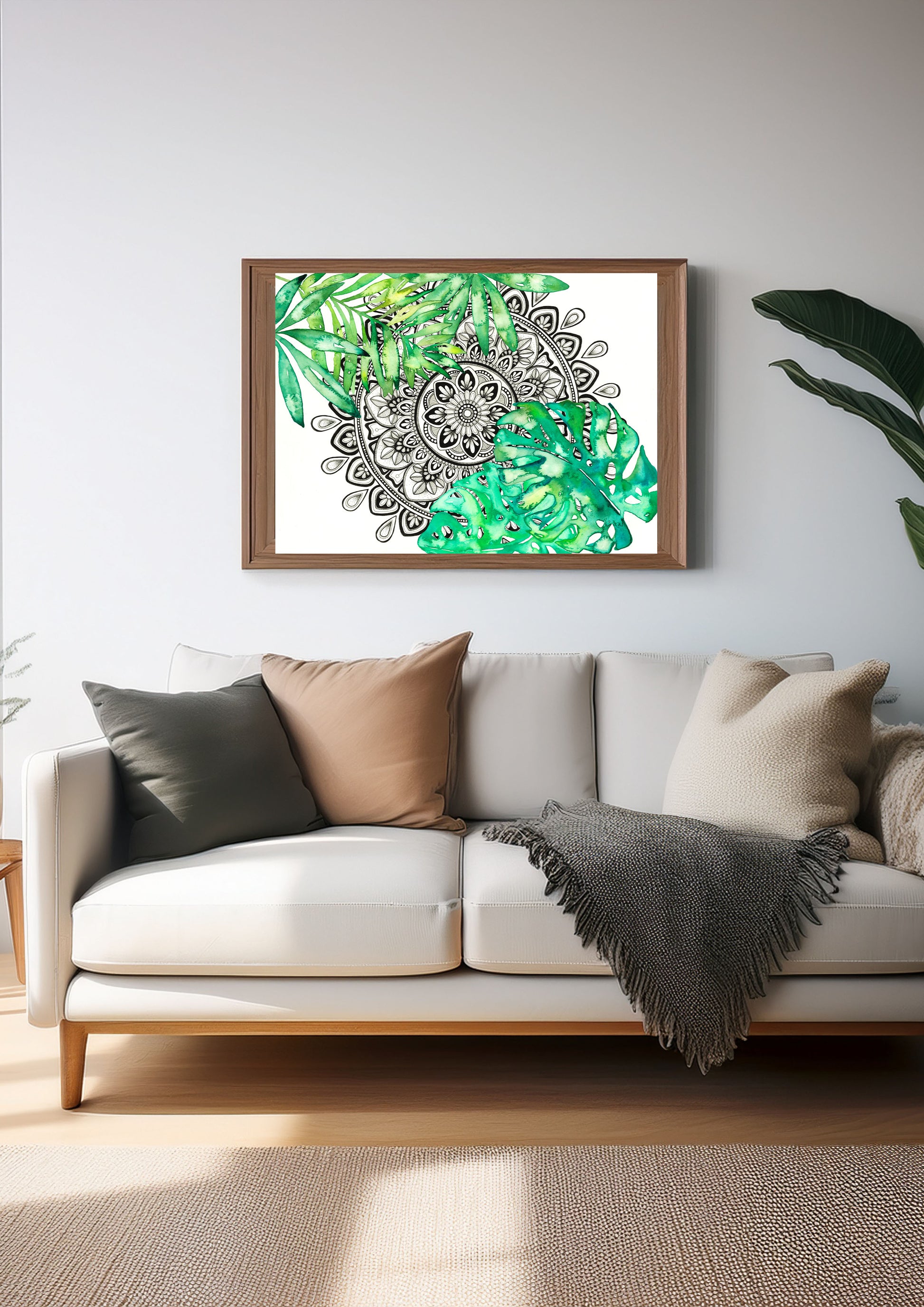 Mandala Art Print – Black and White Mandala with Monsterra Botanical Watercolour