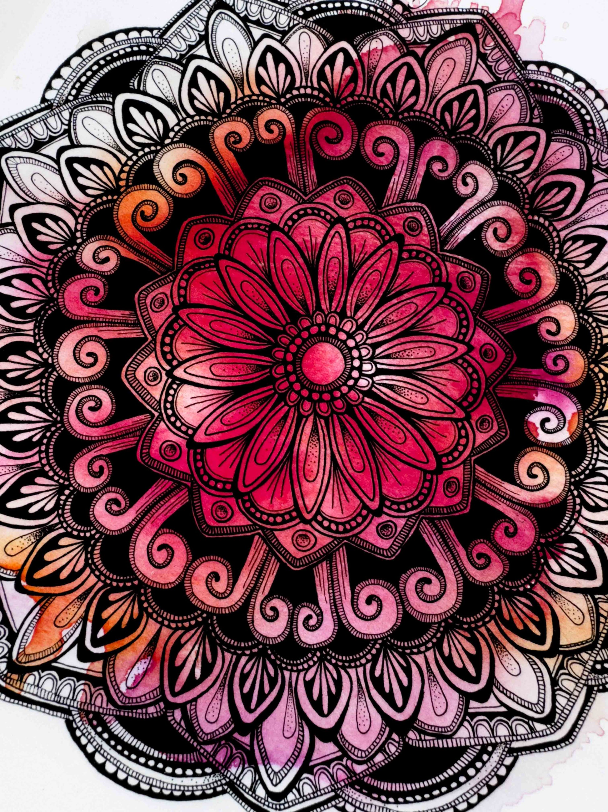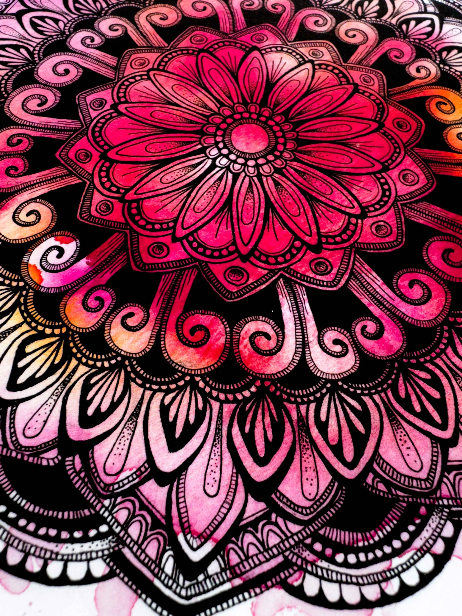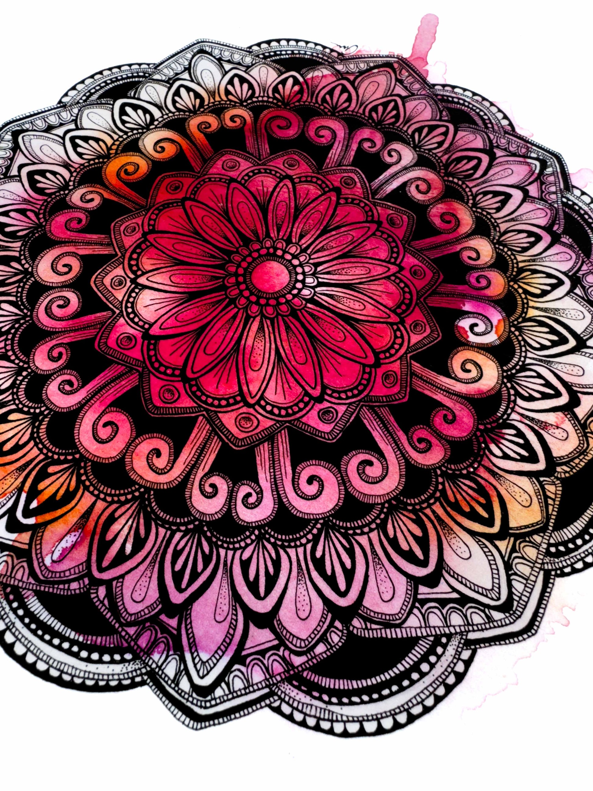 Mandala Art Print – Ink Drawing with Pink Watercolour Background