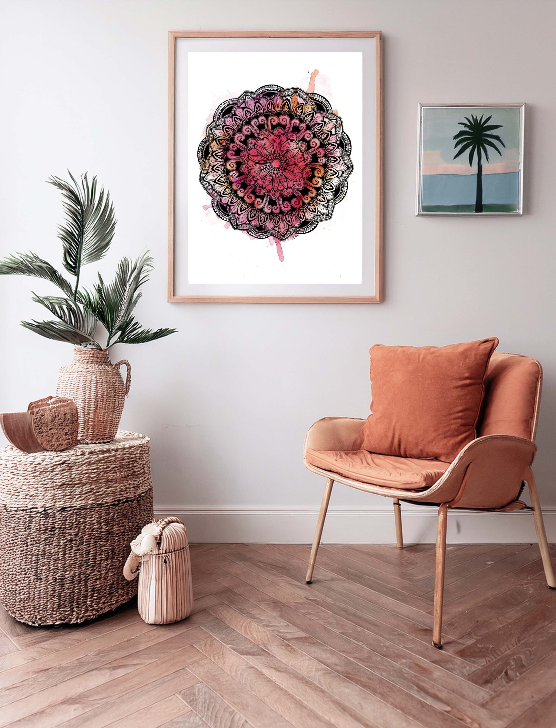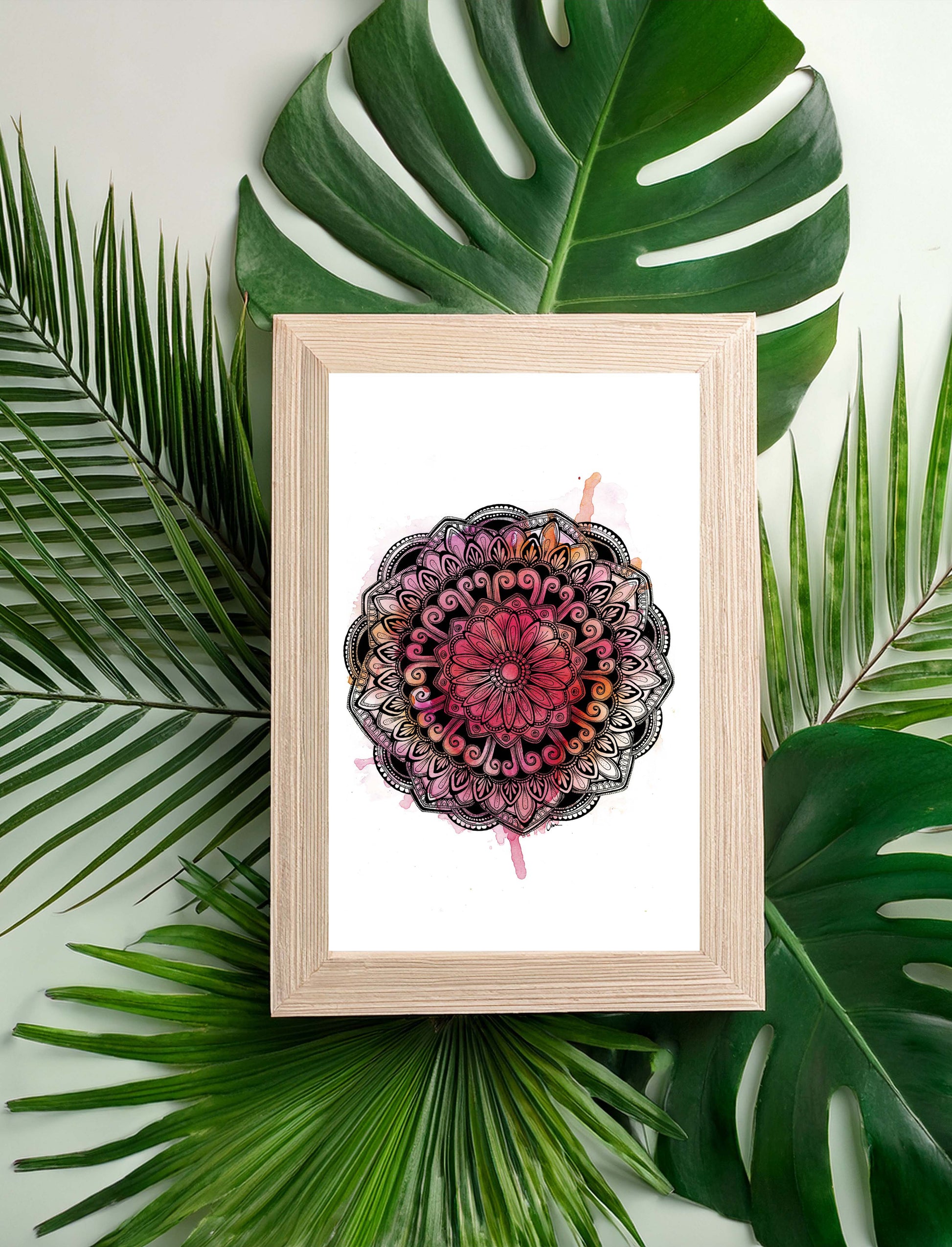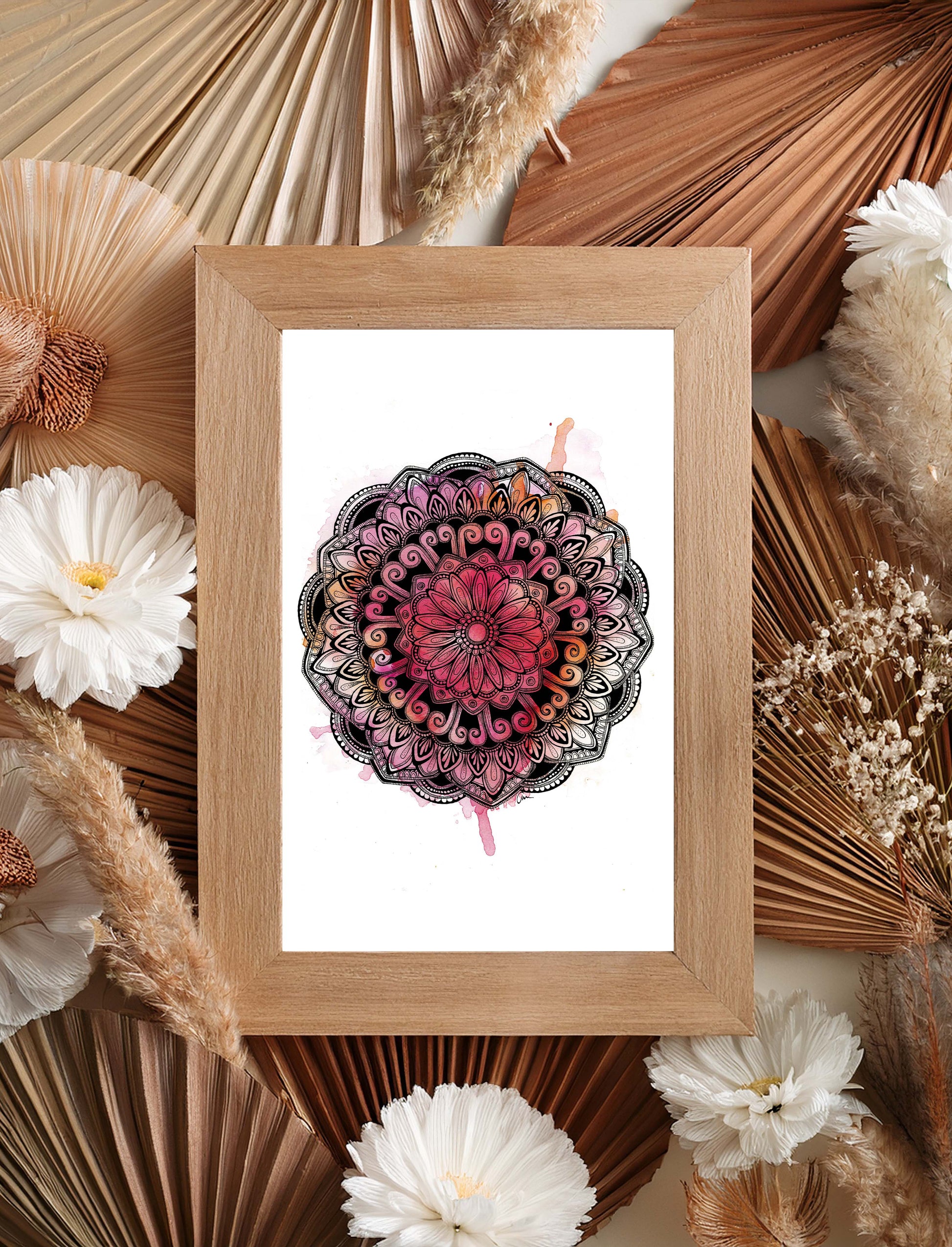 Inspired by traditional geometric mandalas, artist Aimee uses this art as a meditation practice. This vibrant yet warming piece features watercolour wash backgrounds in rich pink hues, creating a harmonious blend of colour and mindful detail.