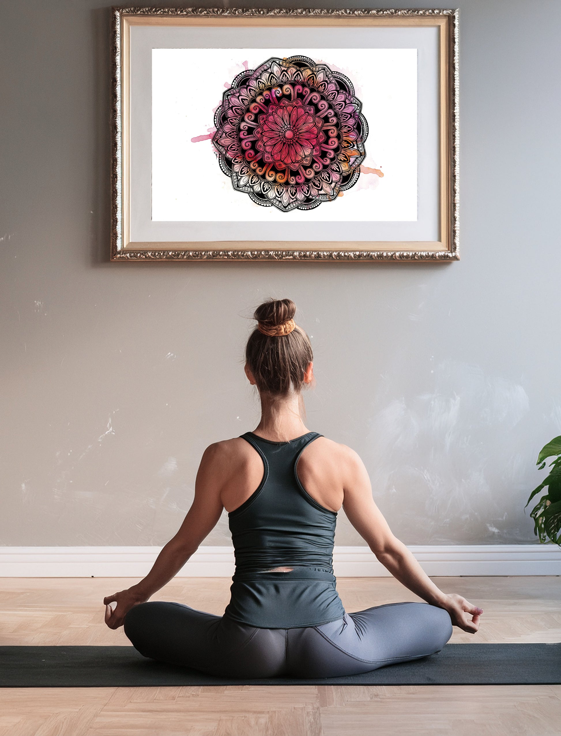 This artwork features a geometric mandala drawn in fine black ink, layered over a vibrant watercolour wash of earthy pink and orage hues. The contrast between the structured mandala and the flowing colours creates a calming visual harmony.