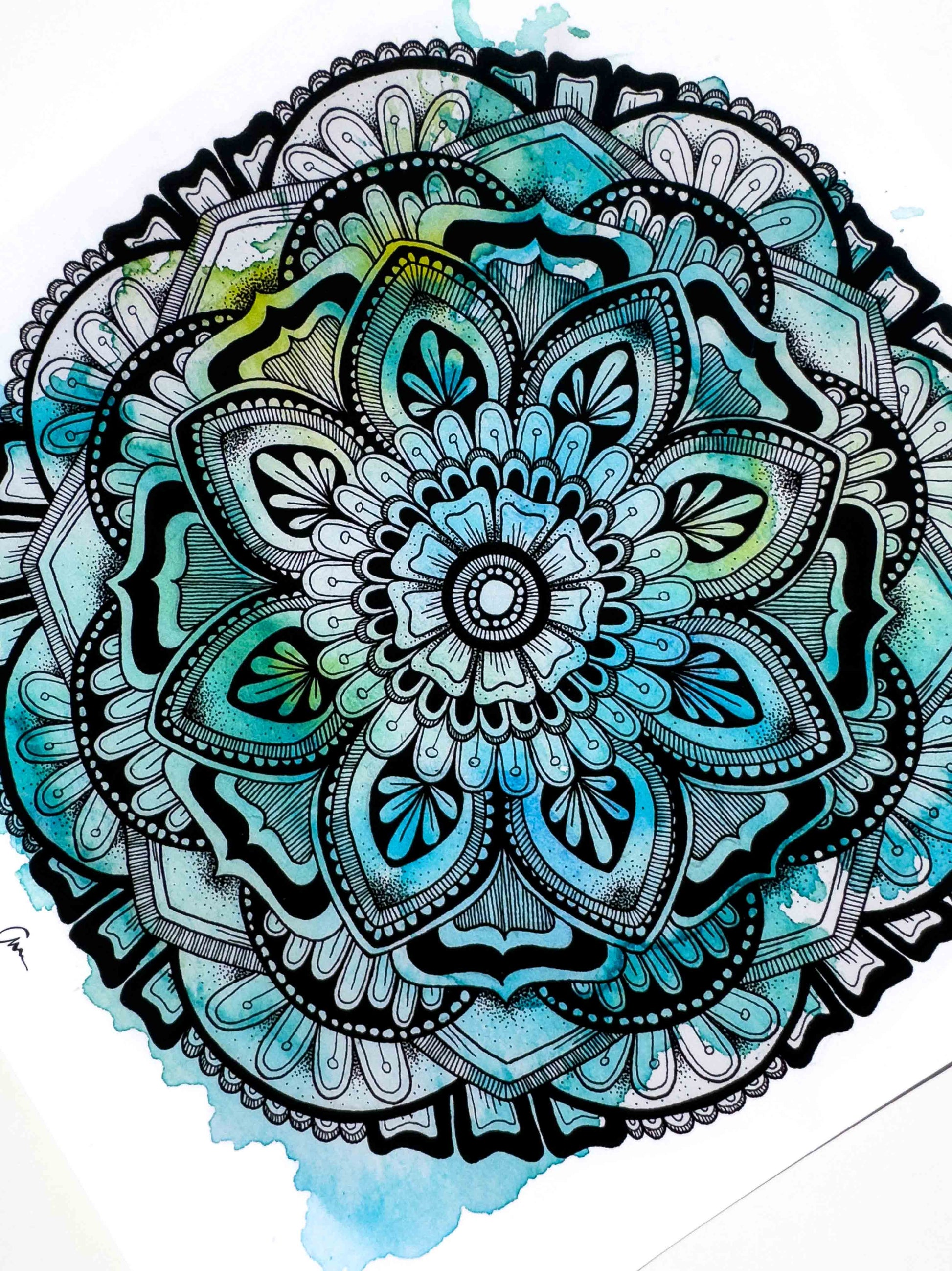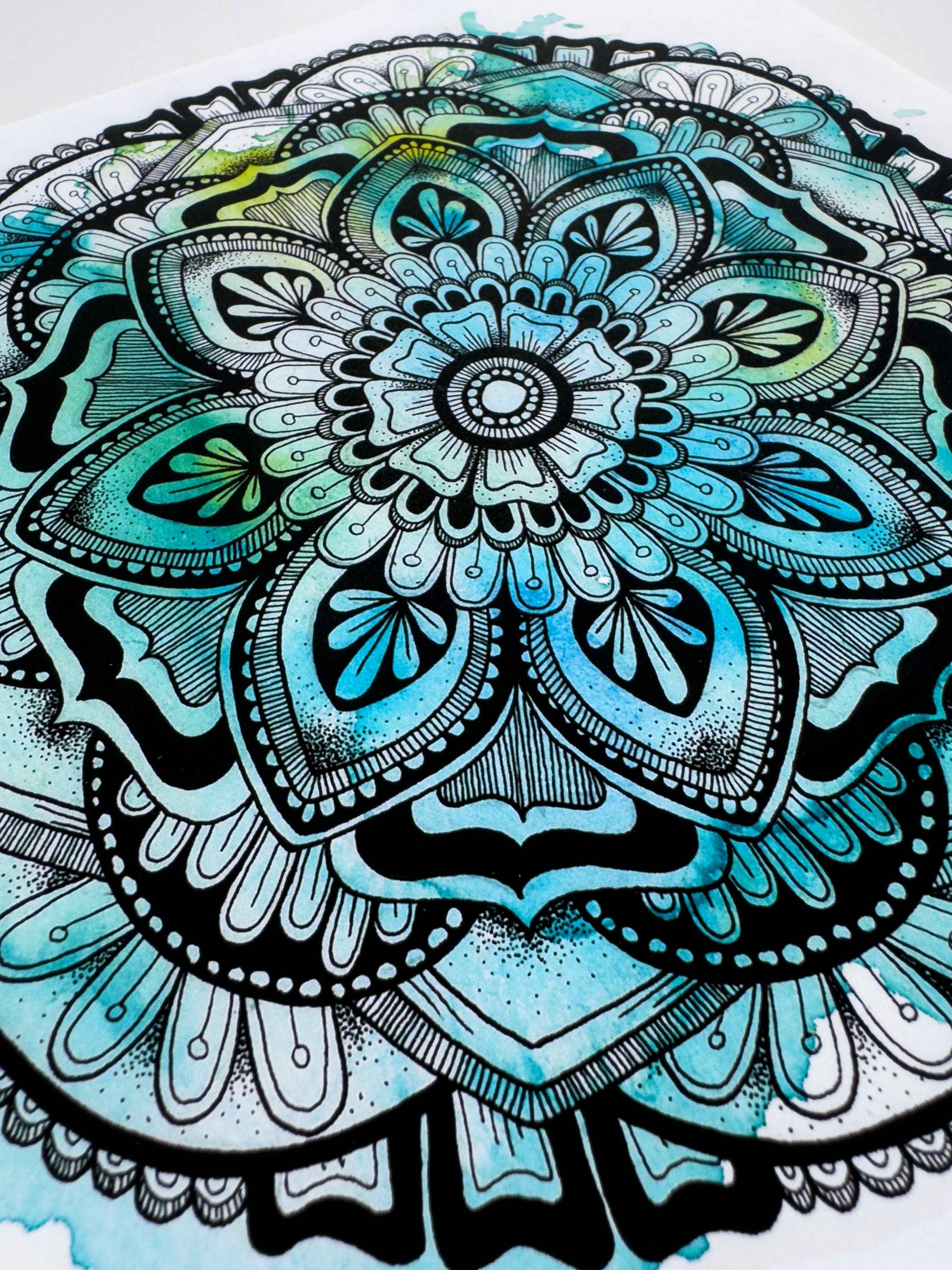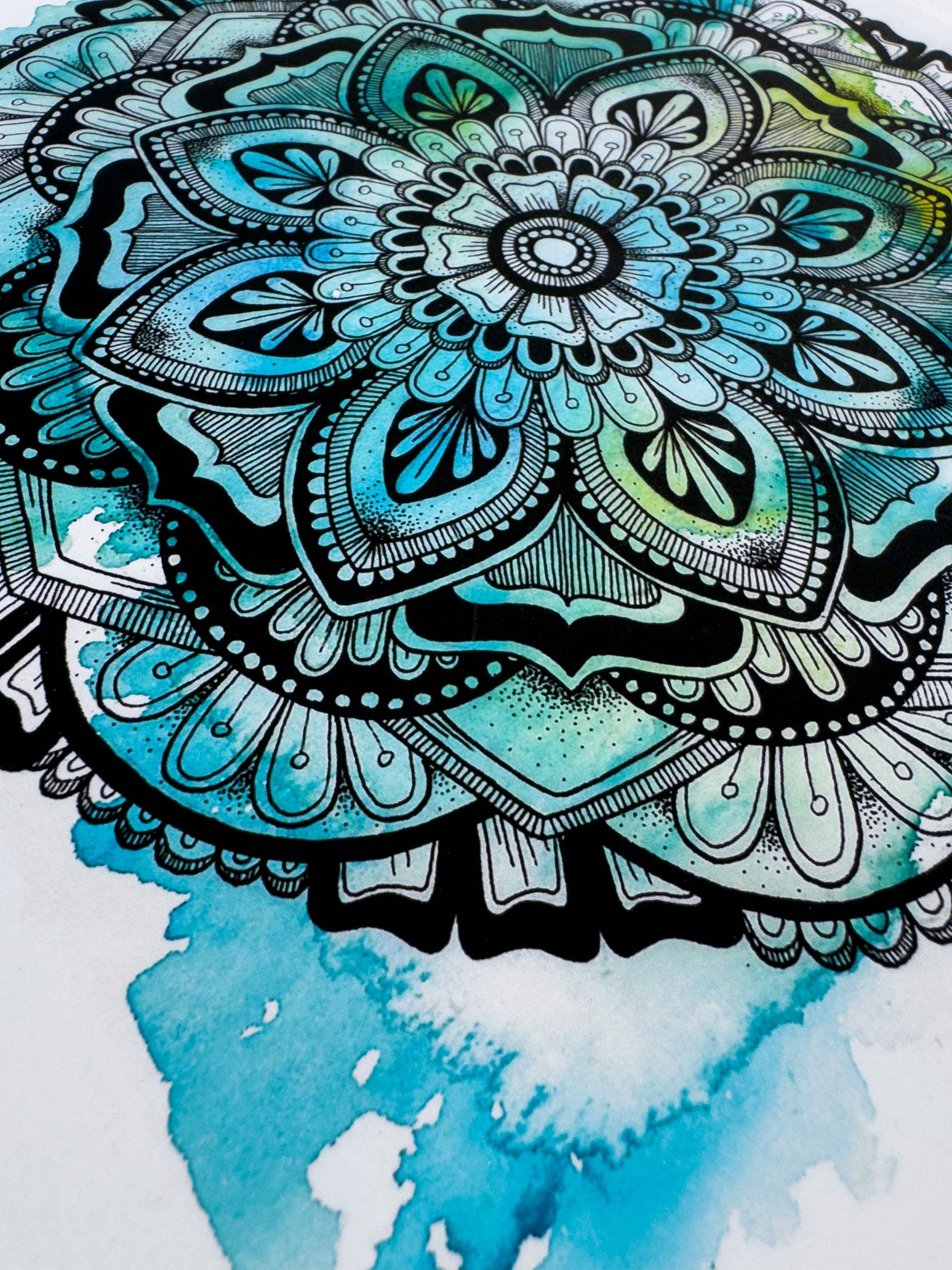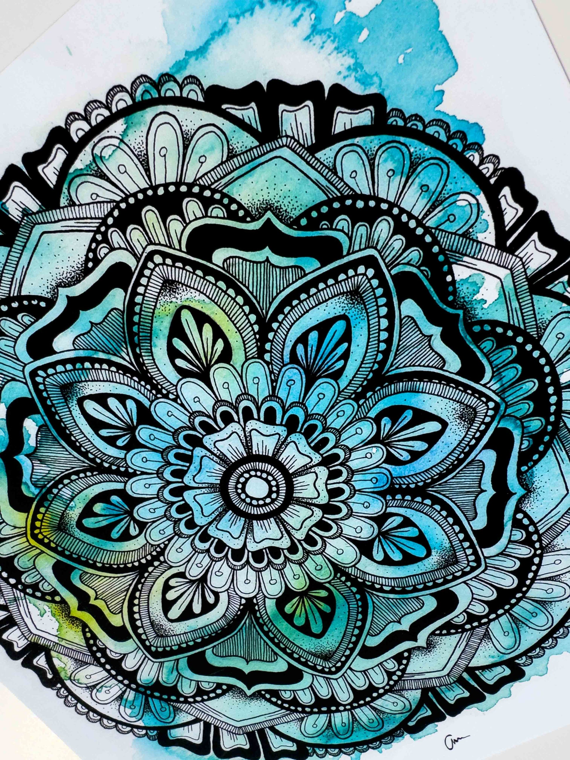 This mandala-inspired artwork features a harmonious blend of blue and green watercolour hues, overlaid with a detailed geometric ink drawing. Inspired by cool winter mornings and their refreshing colors, it brings a sense of calm and clarity.