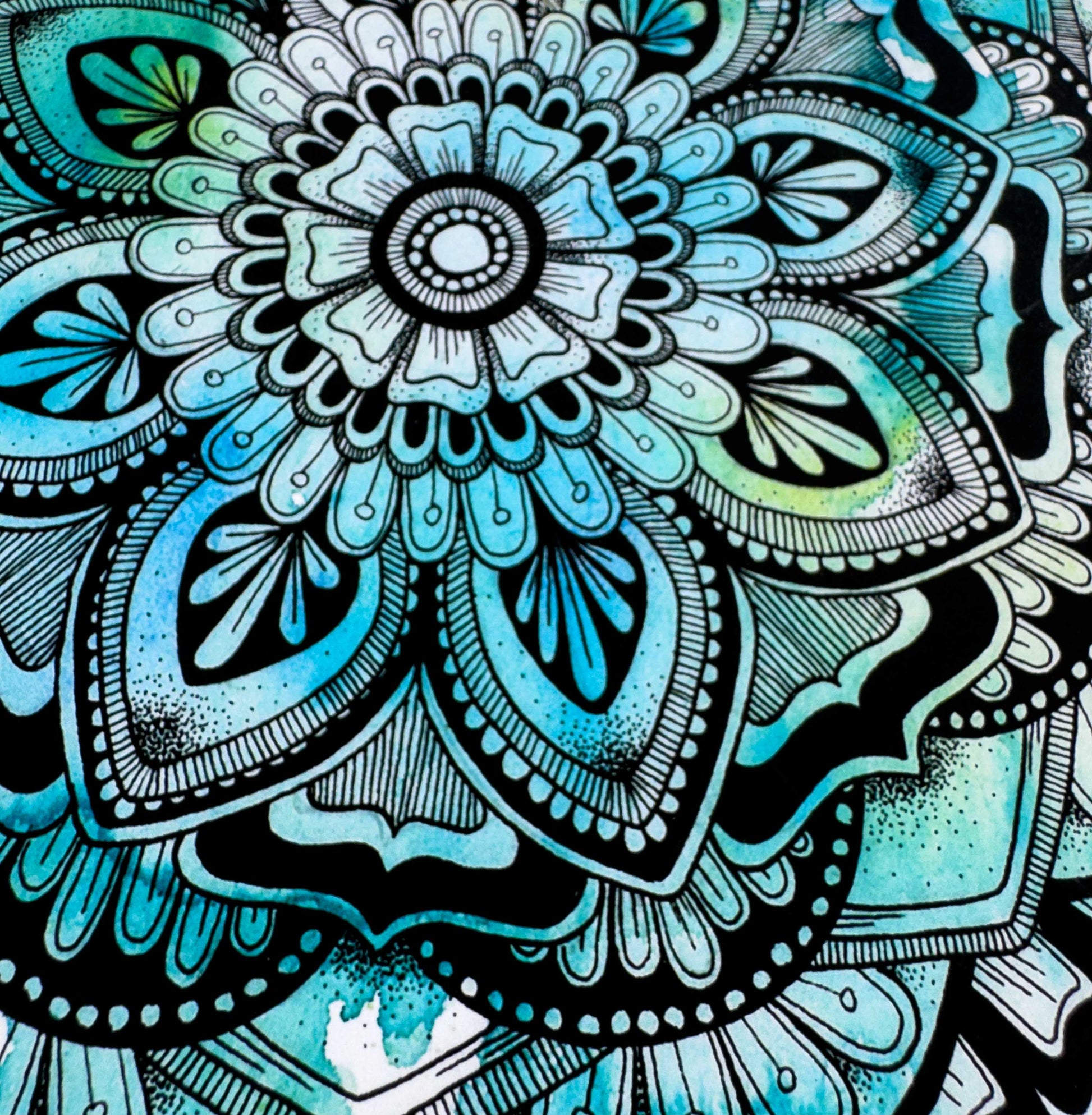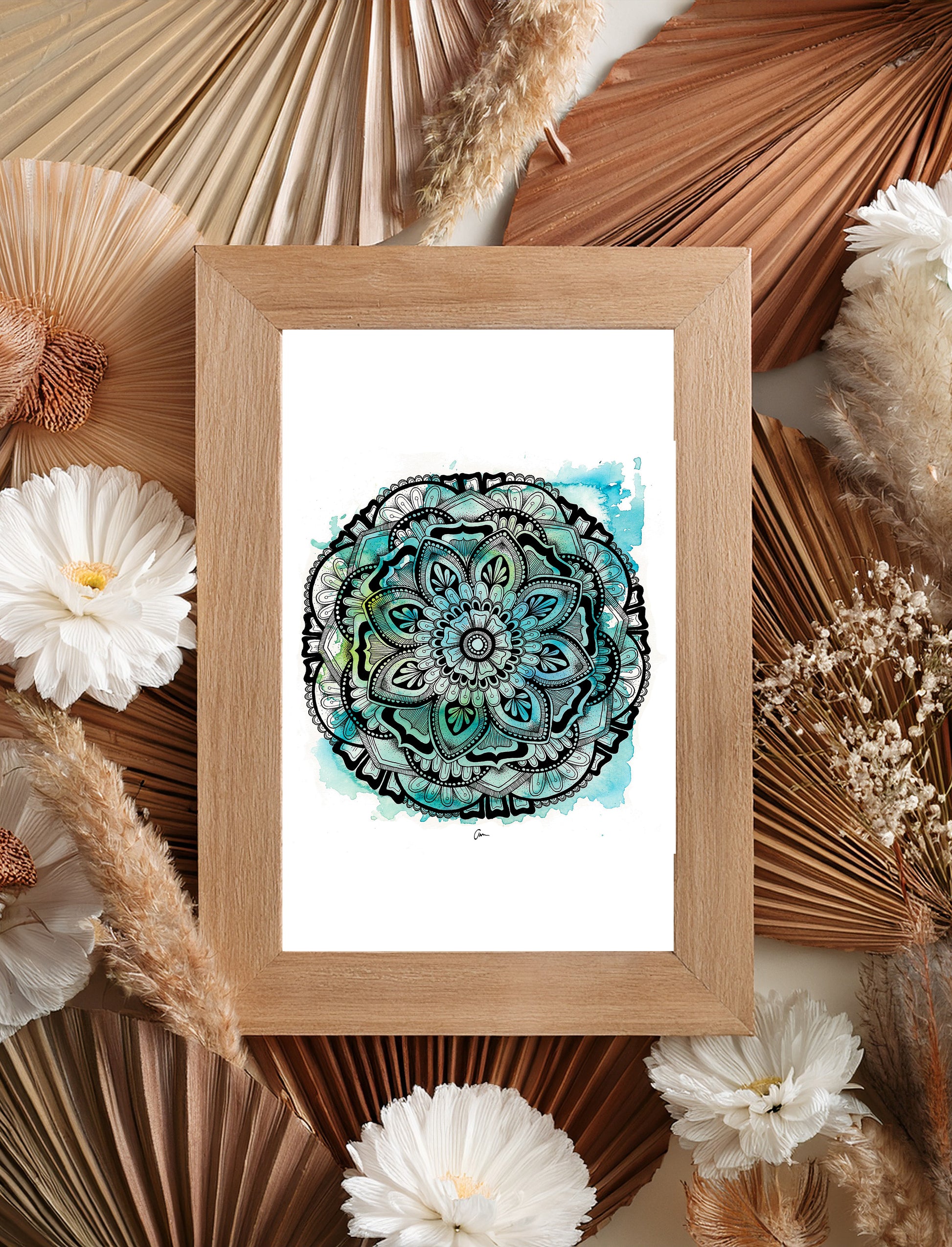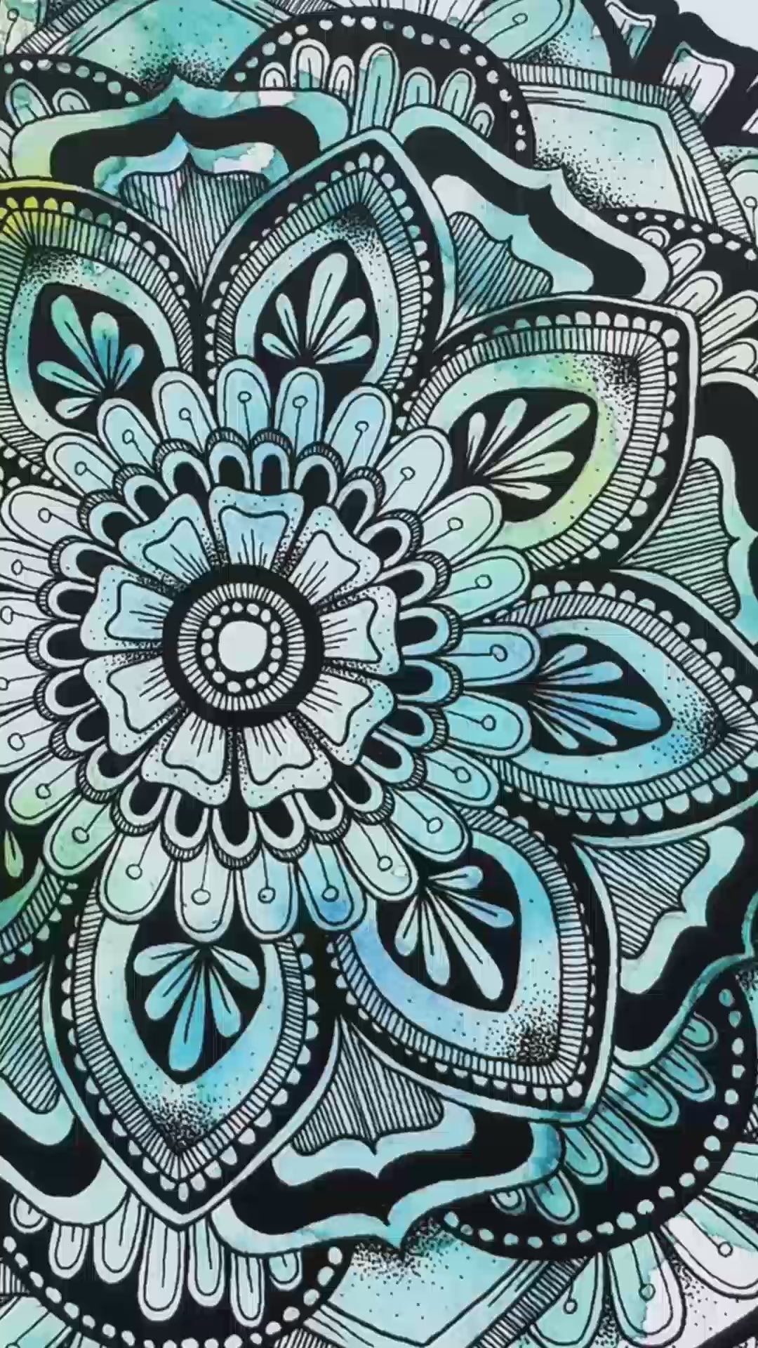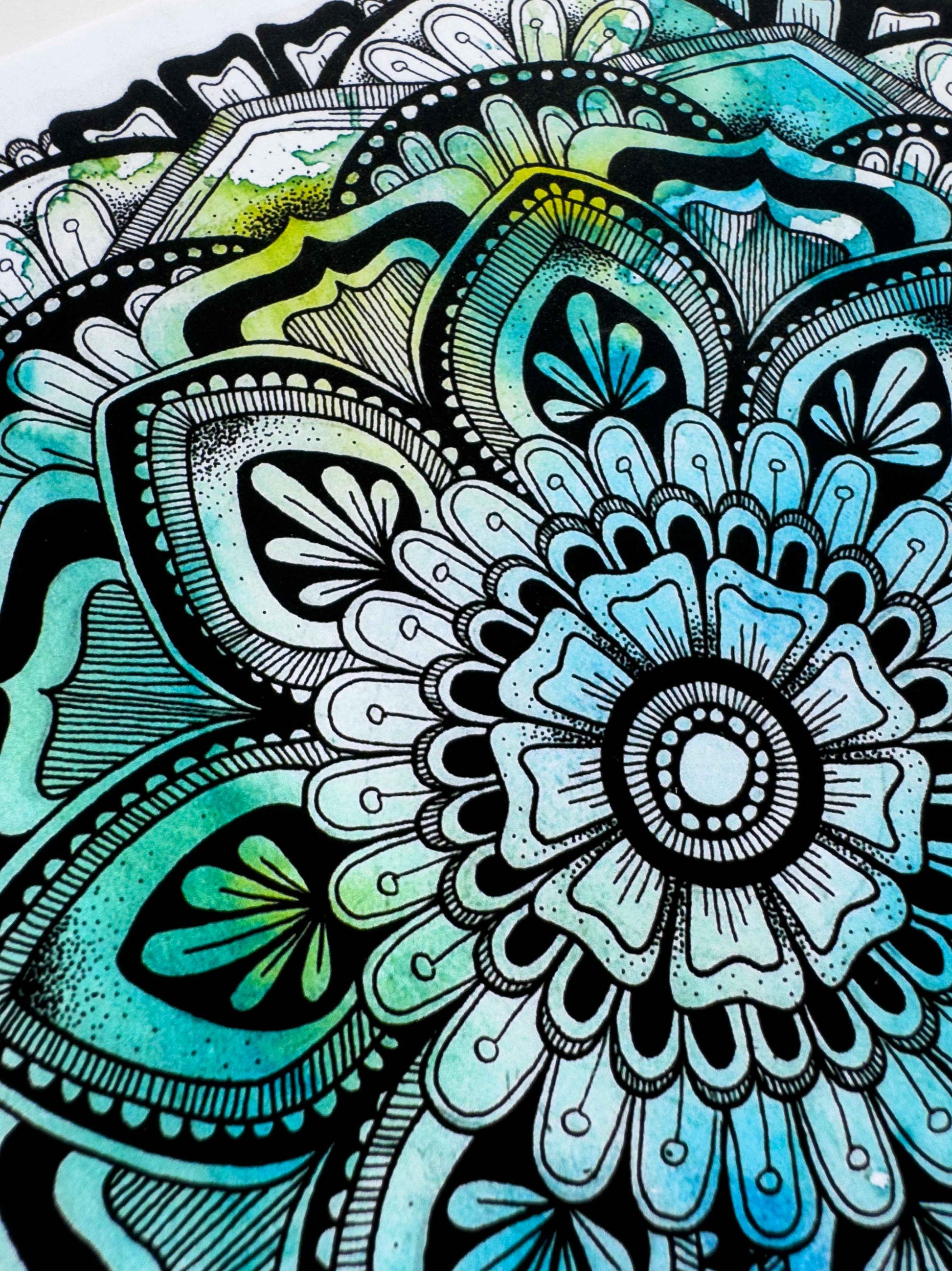 This mandala-inspired artwork features a harmonious blend of blue and green watercolour hues, overlaid with a detailed geometric ink drawing. Inspired by cool winter mornings and their refreshing colors, it brings a sense of calm and clarity.