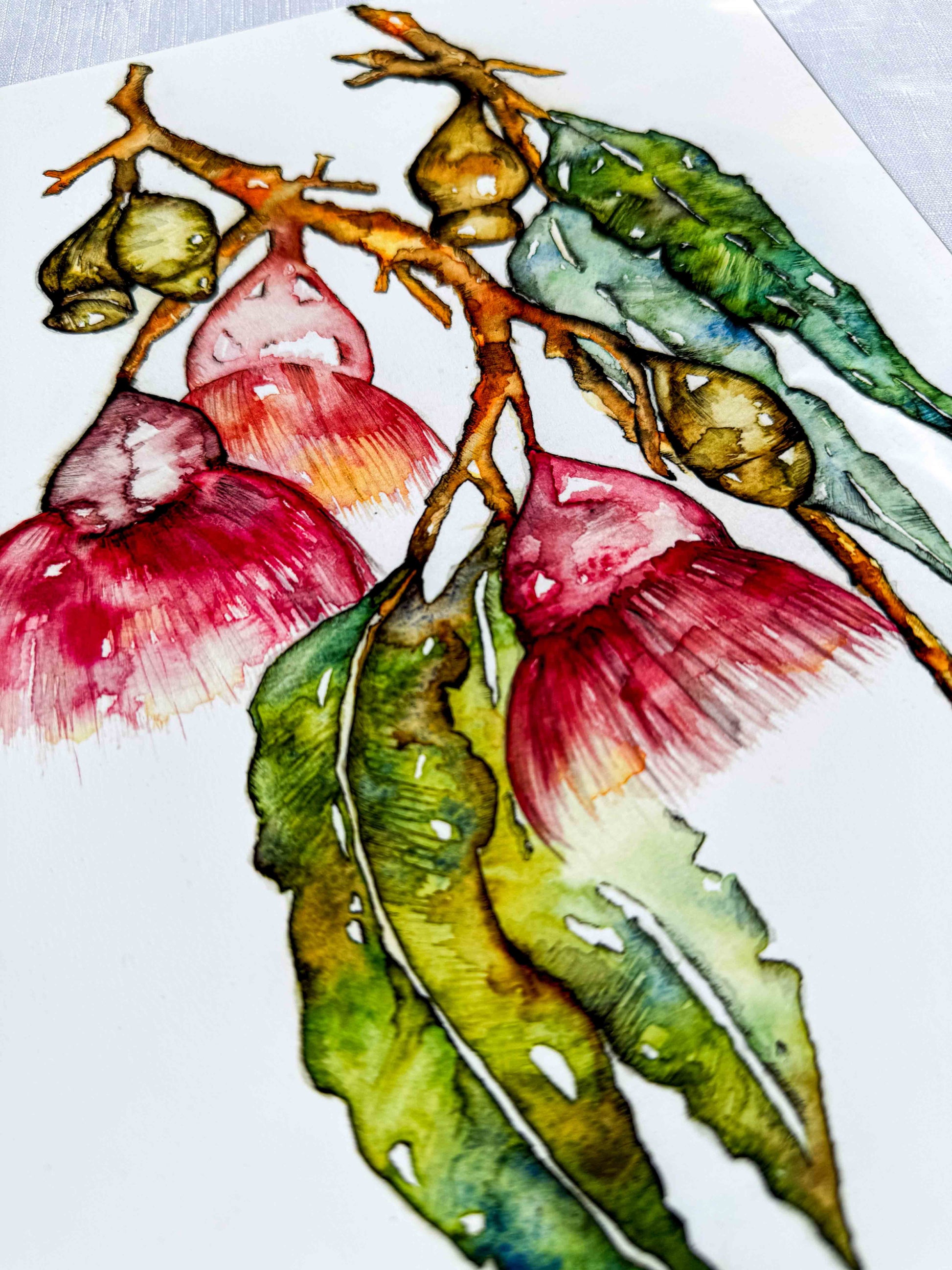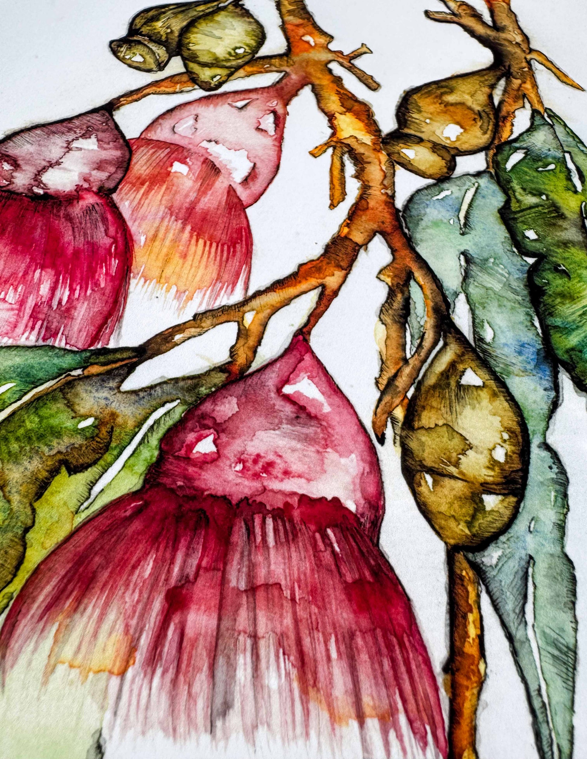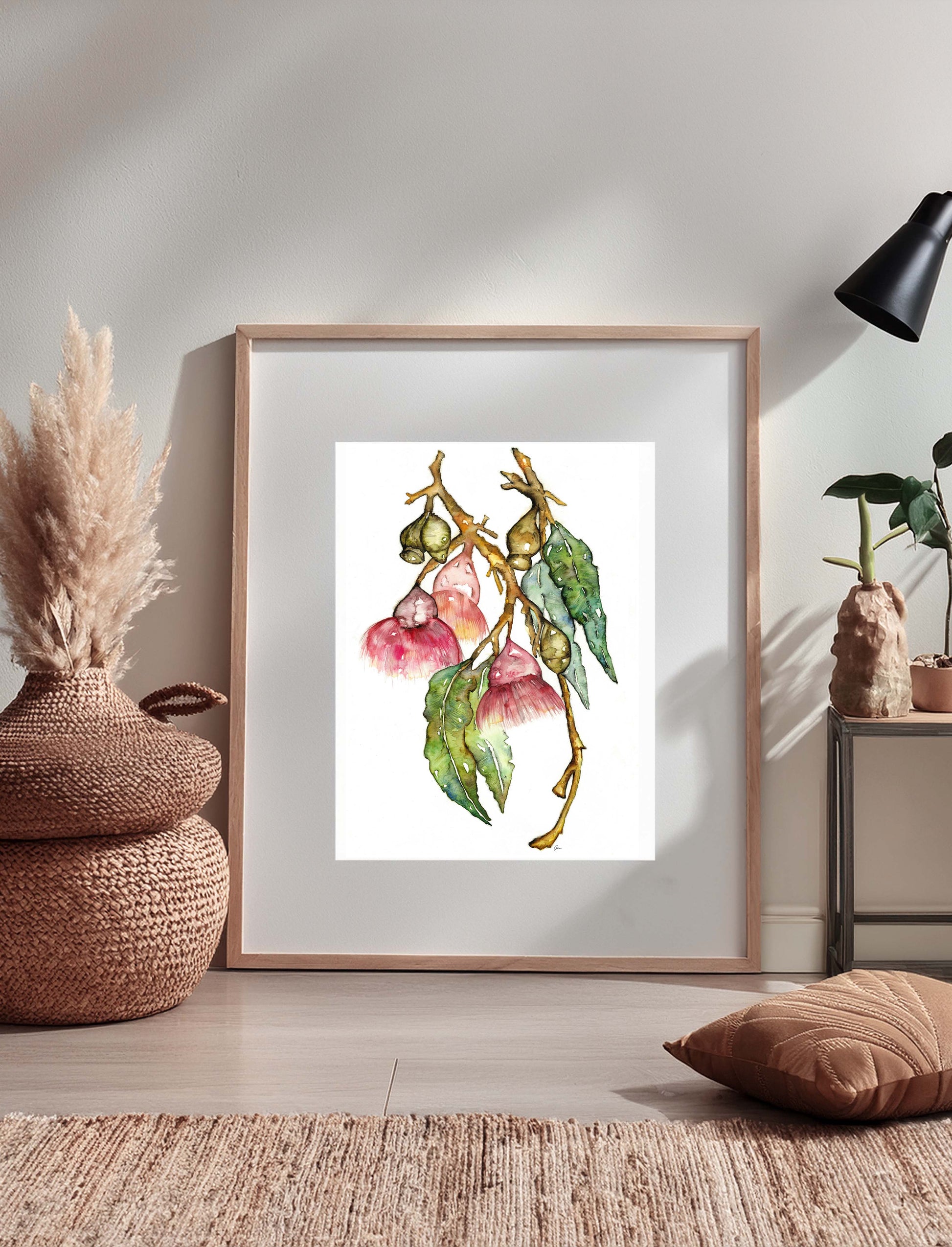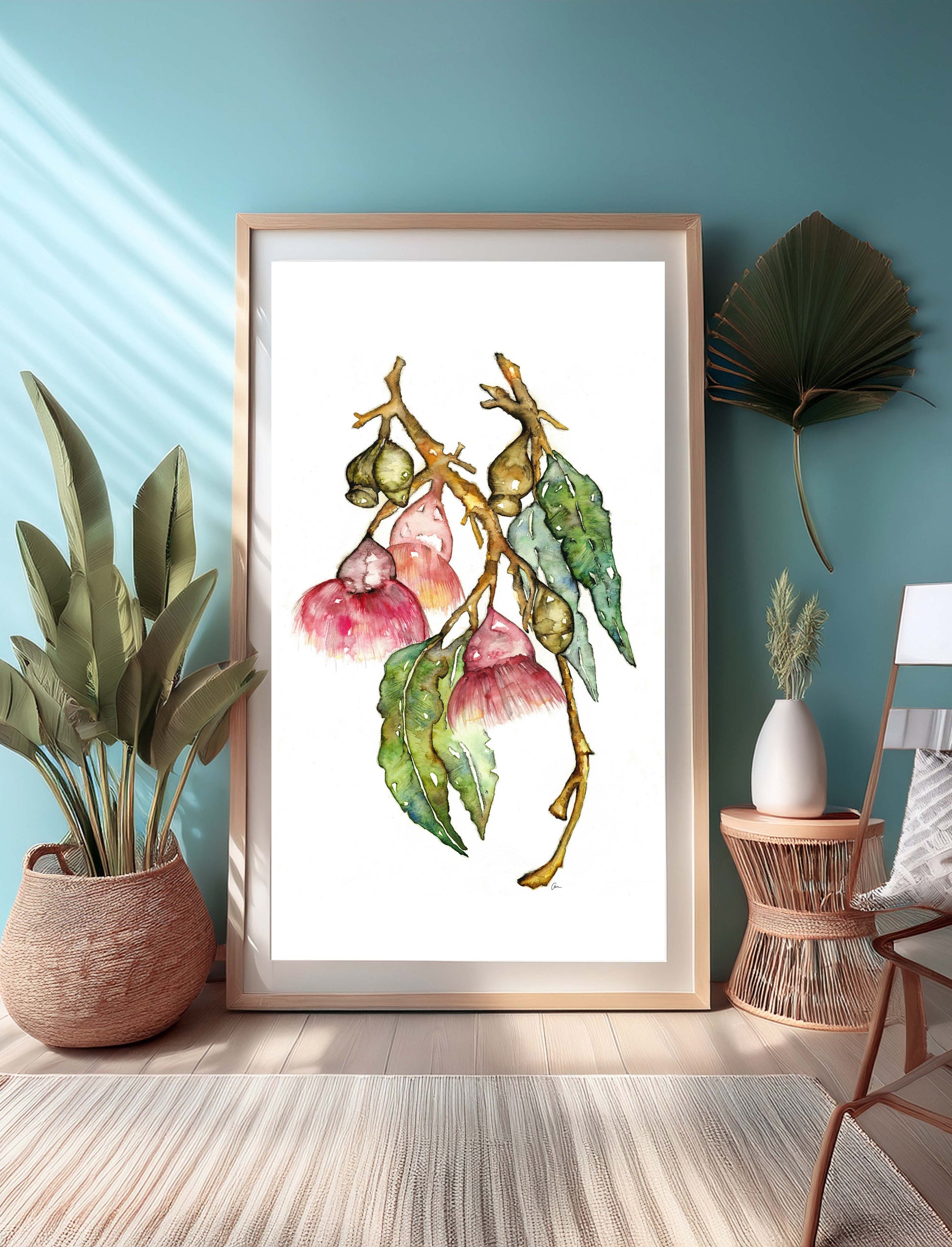 Native Australian Botanical Watercolour - Gum Leaf Bottle Brush and Flower Print