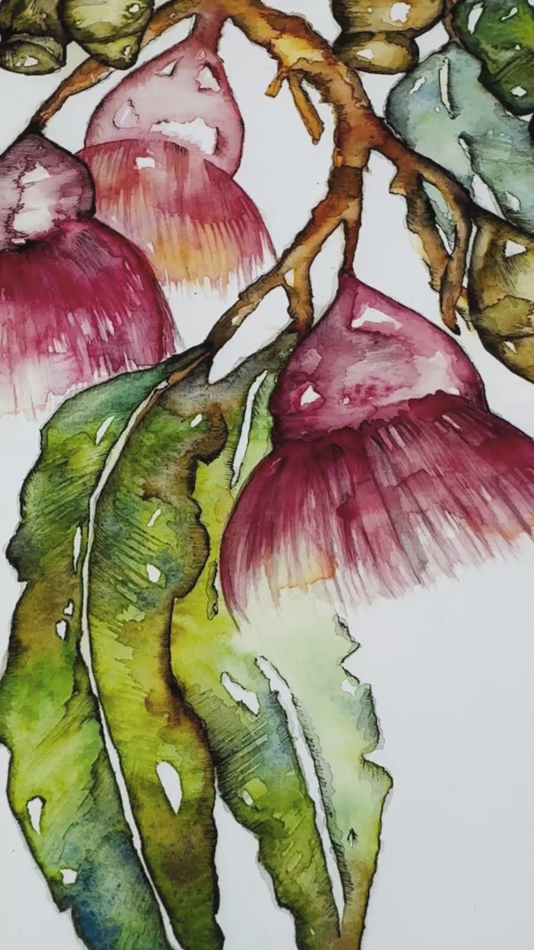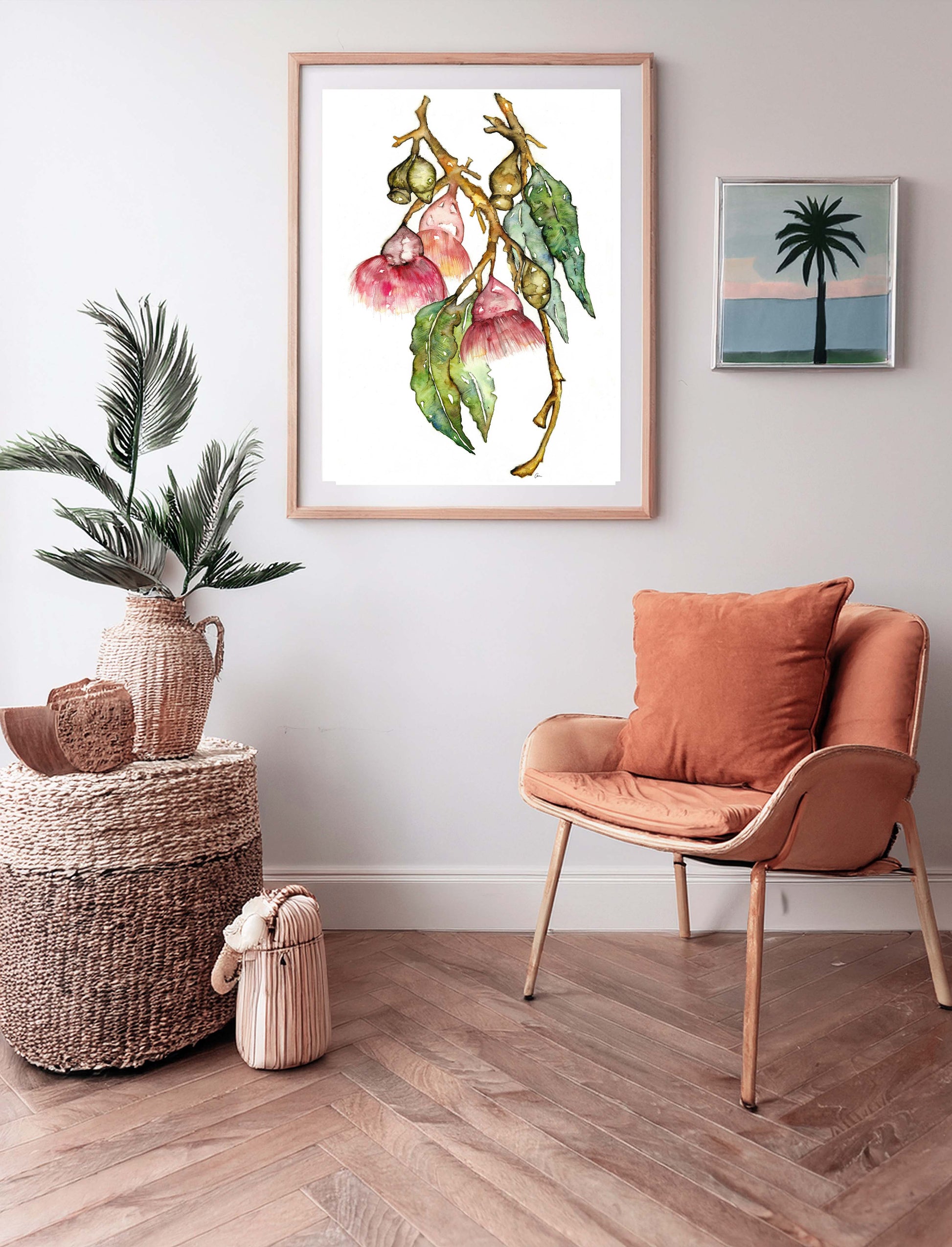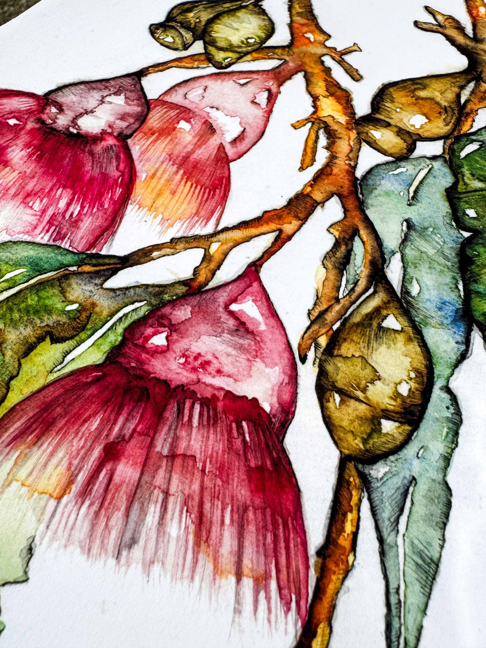 Inspired by the raw beauty of the Australian bush, this watercolour art print showcases delicate gum leaves and native wildflowers, hand-painted in vibrant, earthy tones. Each brushstroke captures the organic flow and unique textures of our native flora.