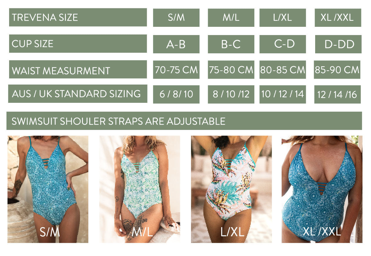 This Bird of Paradise Floral One-piece Swimsuits feature a fitted bodice that gently hugs and accentuates the natural contours of the female body, with modest bum coverage for comfort. The elegant V-front scoops the bust beautifully, while multiple back straps provide a secure and comfortable fit. Thin yet supportive over-the-shoulder straps are fully adjustable, allowing for a customizable fit.