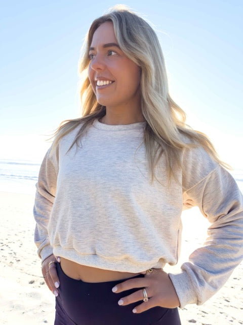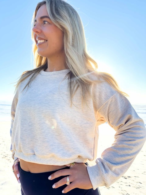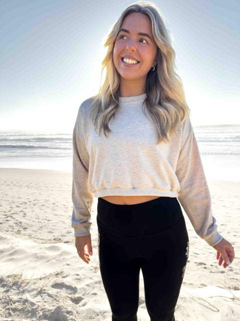 The soft neutral "mist" tone goes with everything—black leggings, denim, or your favourite basics. Whether you're heading to yoga or out for coffee, this jumper offers comfort, creativity, and conscious living.