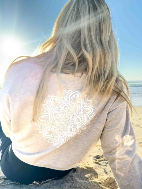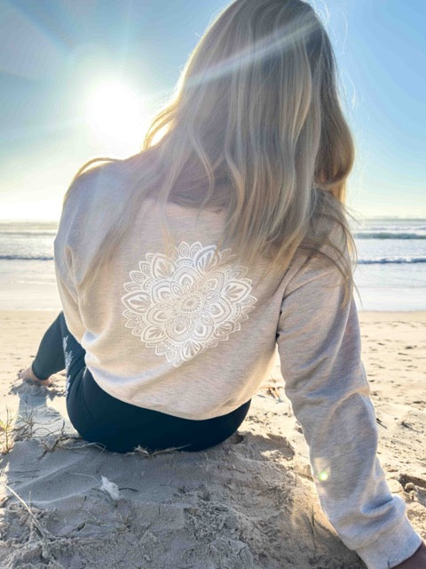This beige cropped sweatshirt is crafted from soft, breathable organic cotton and features a hand-drawn mandala print in white across the back. The relaxed fit, drop shoulder, and cosy fabric make it perfect for layering, while the cropped length pairs effortlessly with high-waisted leggings, shorts, jeans, or a skirt.