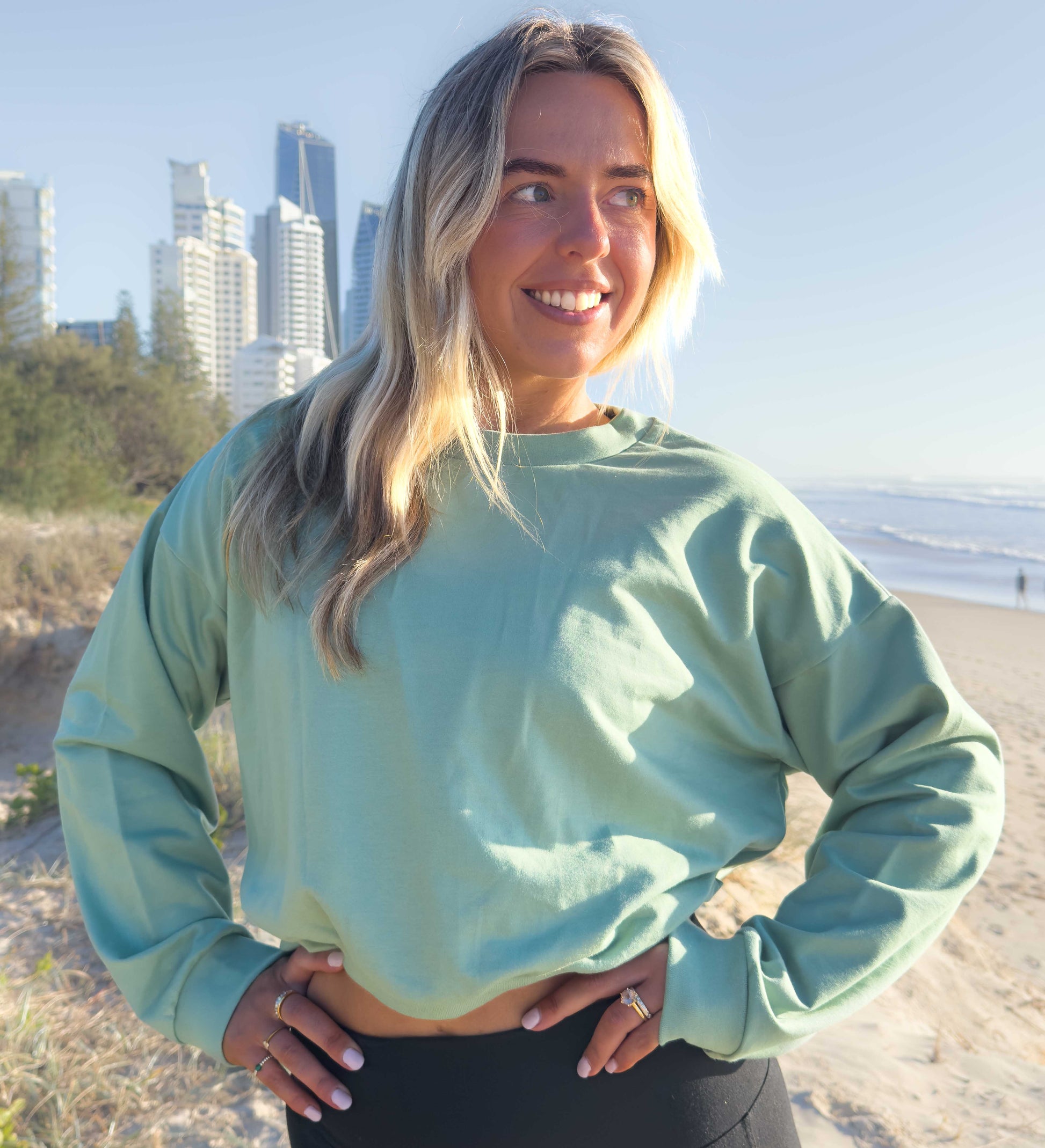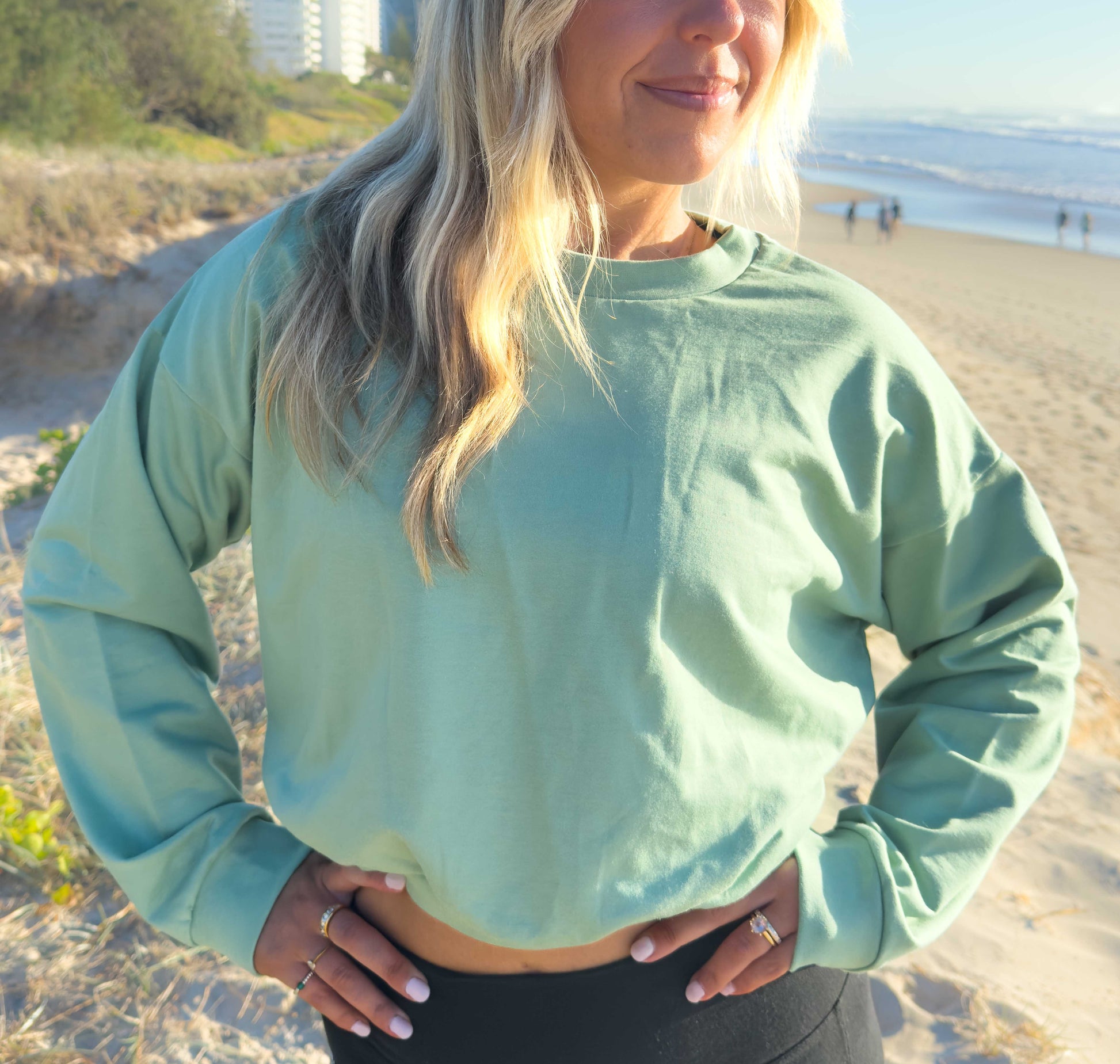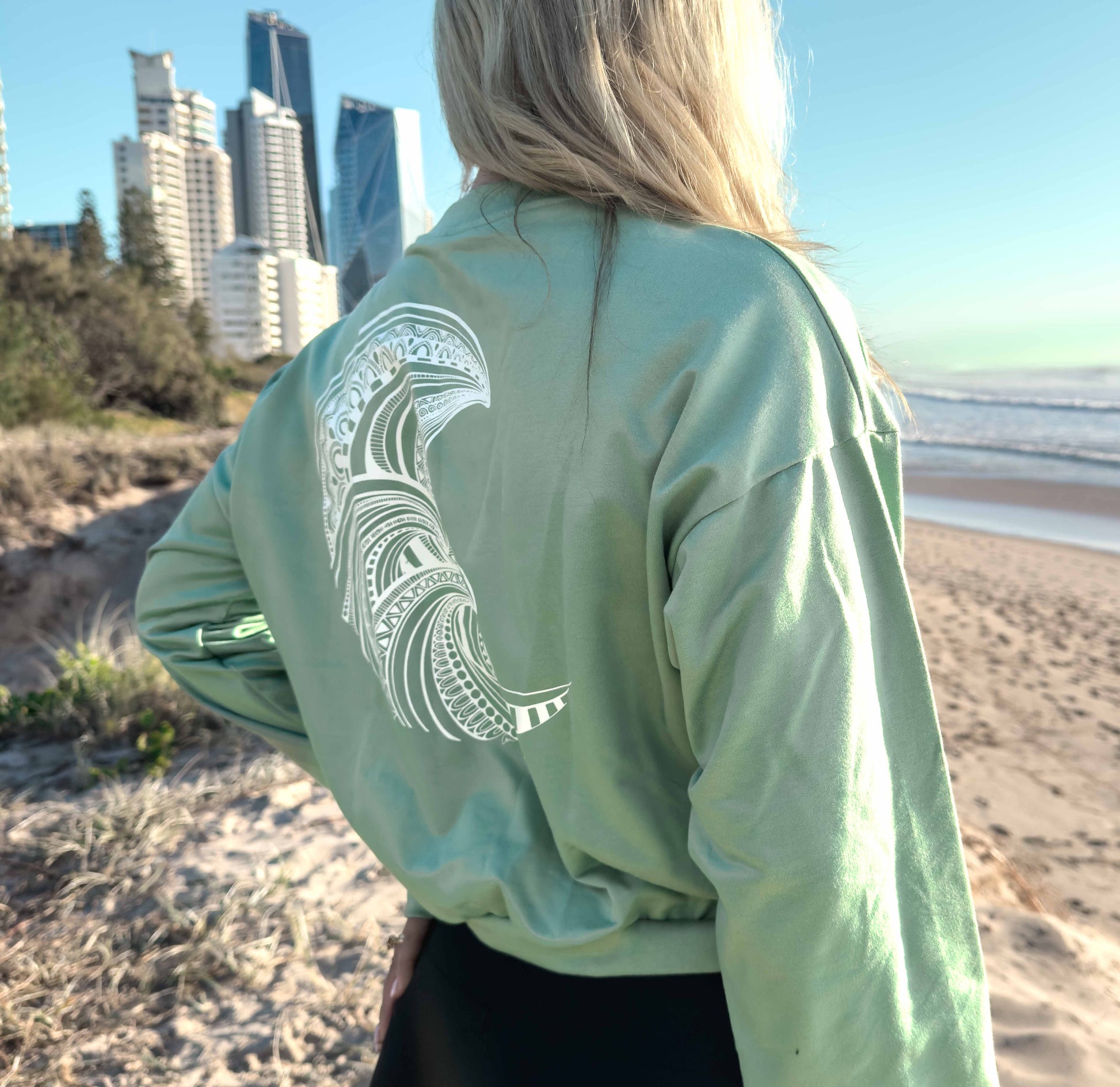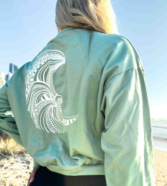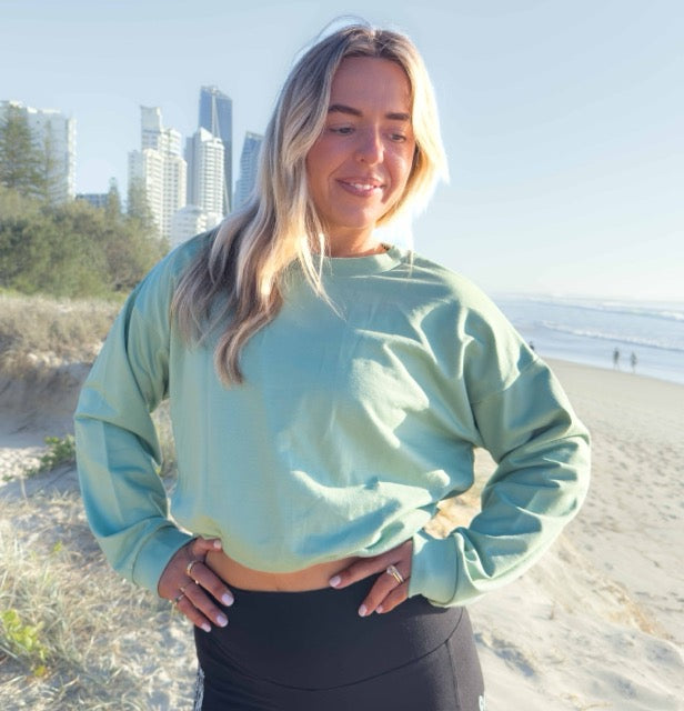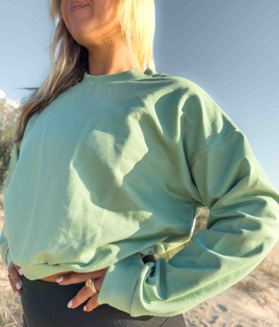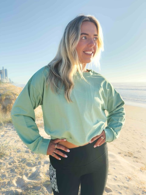 The soft sage green tone goes with everything—black leggings, denim, or your favourite basics. Whether you're heading to yoga or out for coffee, this jumper offers comfort, creativity, and conscious living.