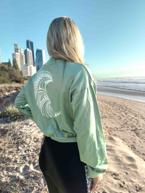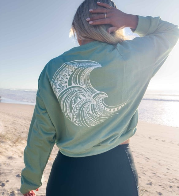 This Green cropped sweatshirt is crafted from soft, breathable organic cotton and features an ocean inspired hand-drawn mandala wave print in white across the back. The relaxed fit, drop shoulder, and cosy fabric make it perfect for layering, while the cropped length pairs effortlessly with high-waisted leggings, shorts, jeans, or a skirt.