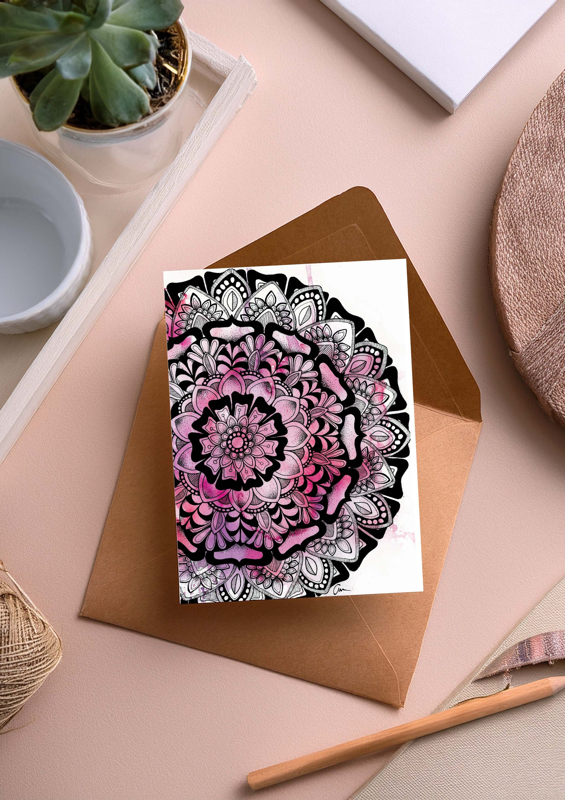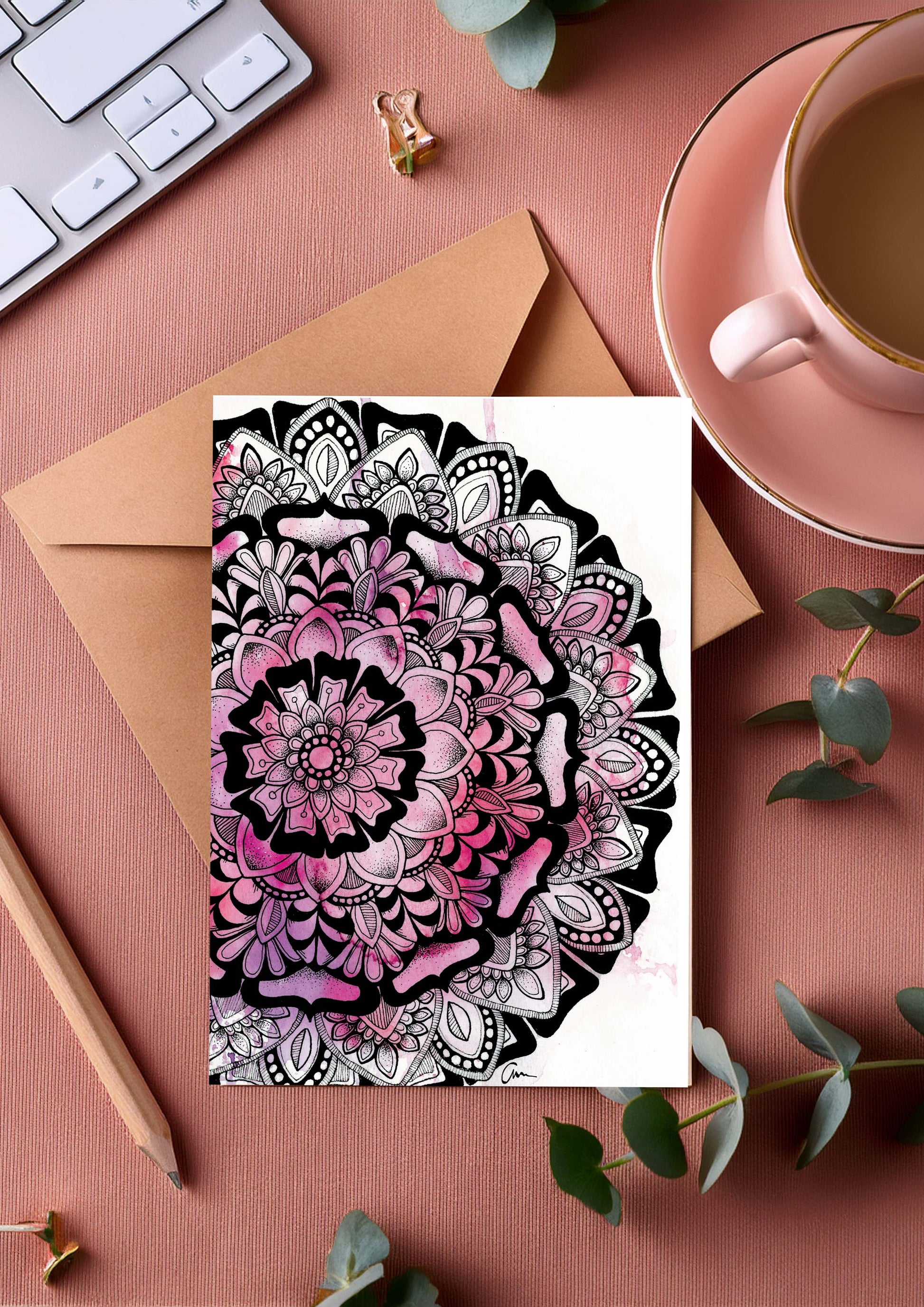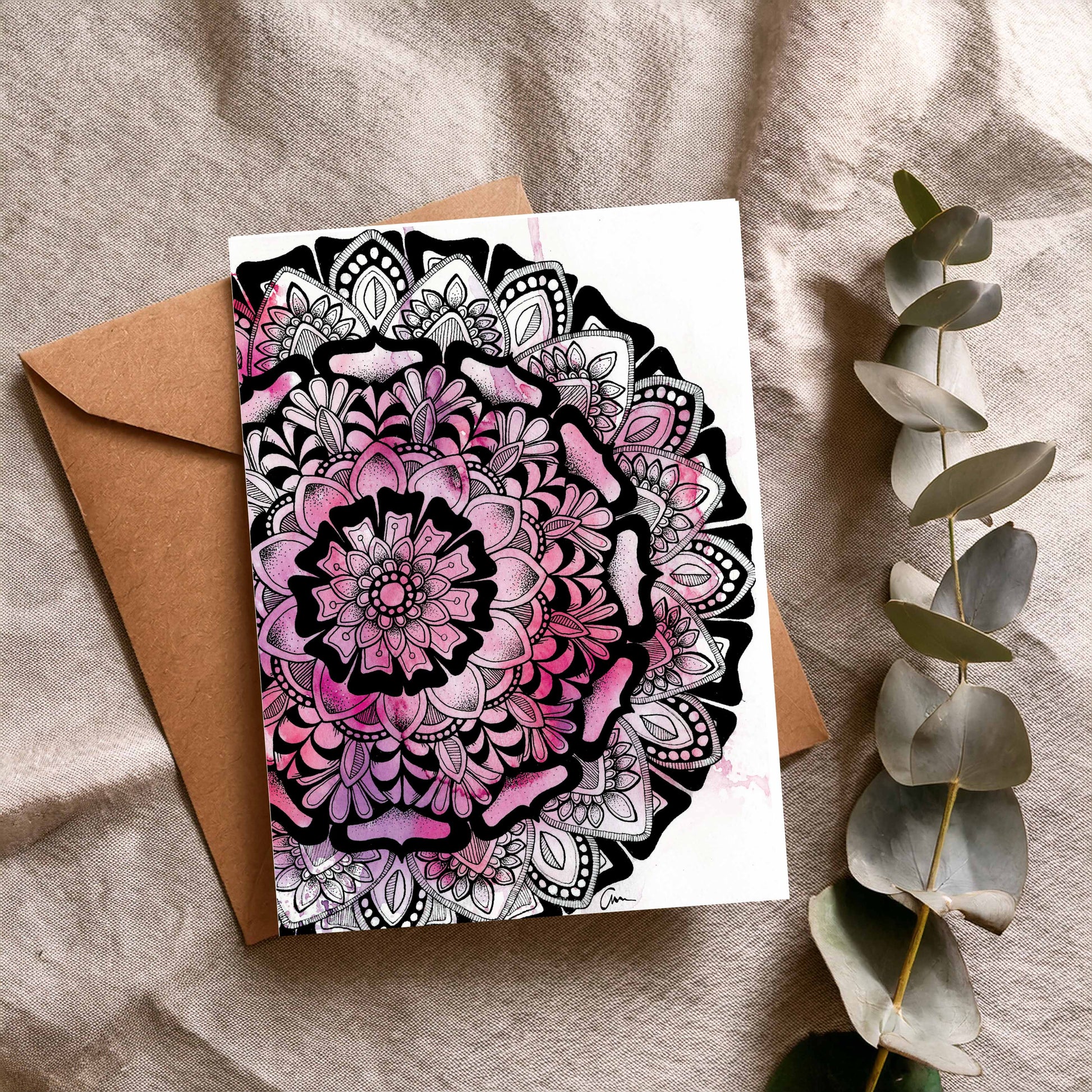 Purple Pink Mandala Greeting Card – Half Moon Watercolour with Geometric Drawing
