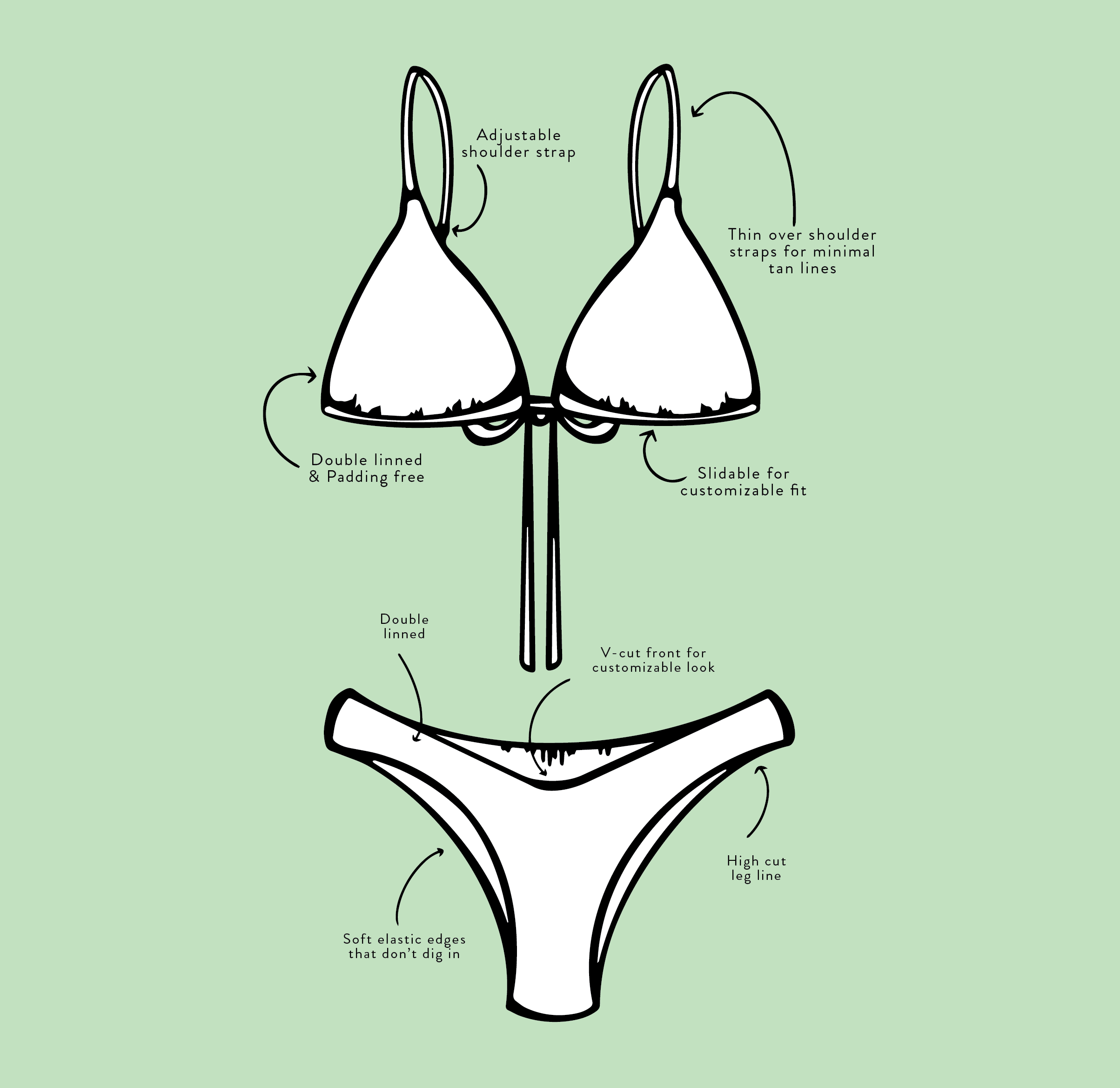 The string triangle top features delicate over-the-shoulder straps that can also be tied as a halter neck for a fresh look. Paired with our classic V-cut bikini bottoms, you can wear them high-rise for a leg-lengthening silhouette or low on the hips for a relaxed fit, while soft elastic edges ensure all-day comfort without digging in.