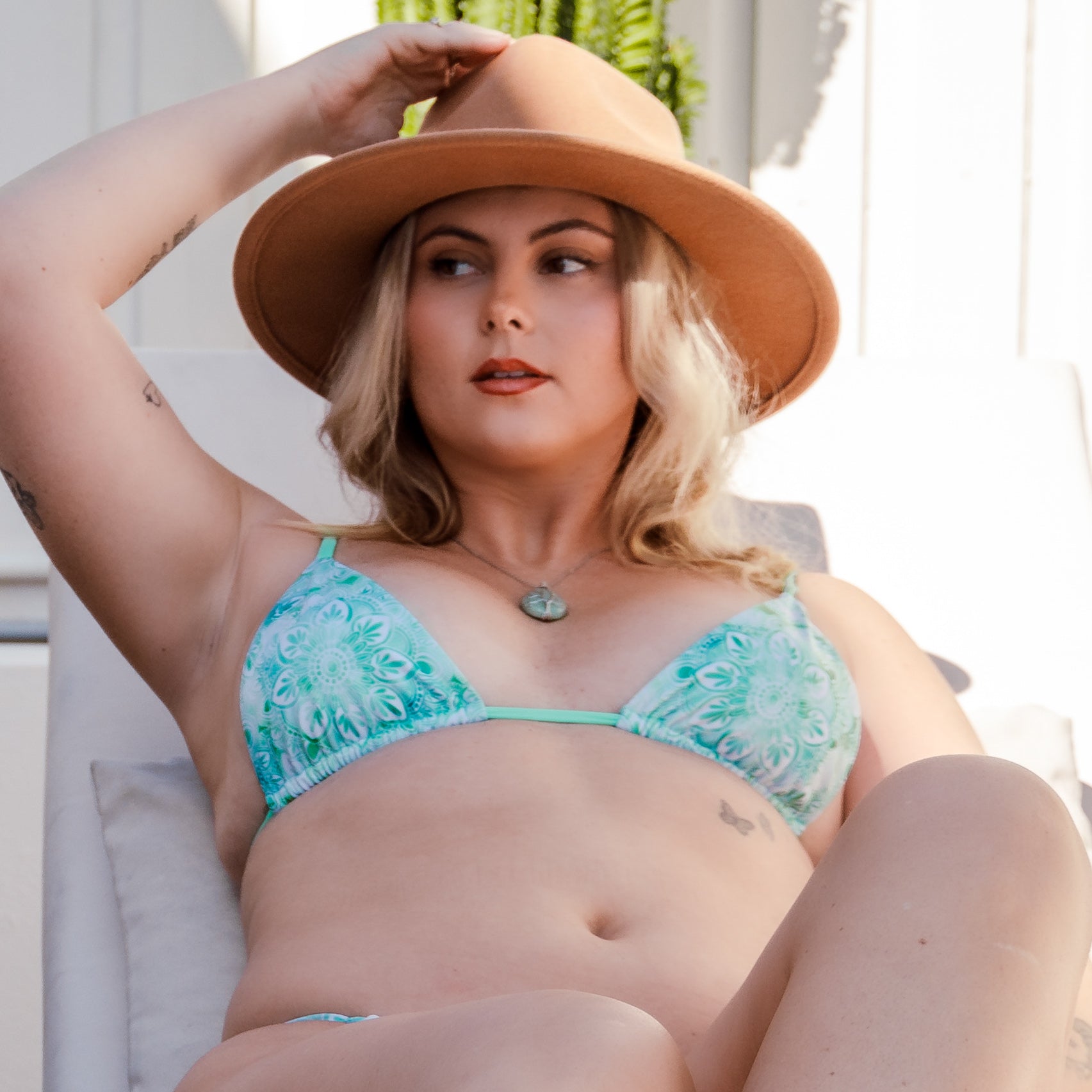Soak up the sun and sea in our Mandala Green Patterned String Triangle Bikini Top. Designed with minimal tan lines in mind, this top features delicate Aqua Green over-the-shoulder straps for a secure, comfortable fit that won't pull on your neck. Prefer a different look? It easily converts into a halter-neck style to suit your vibe.
