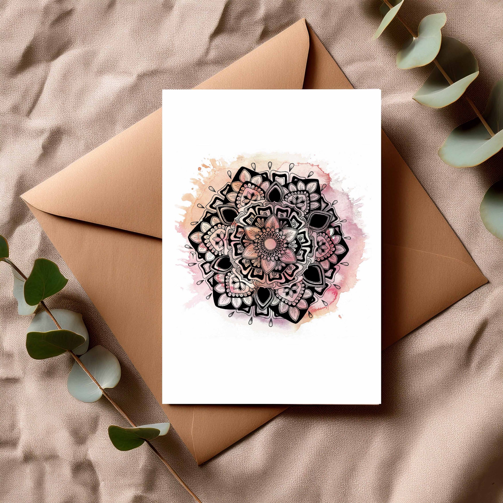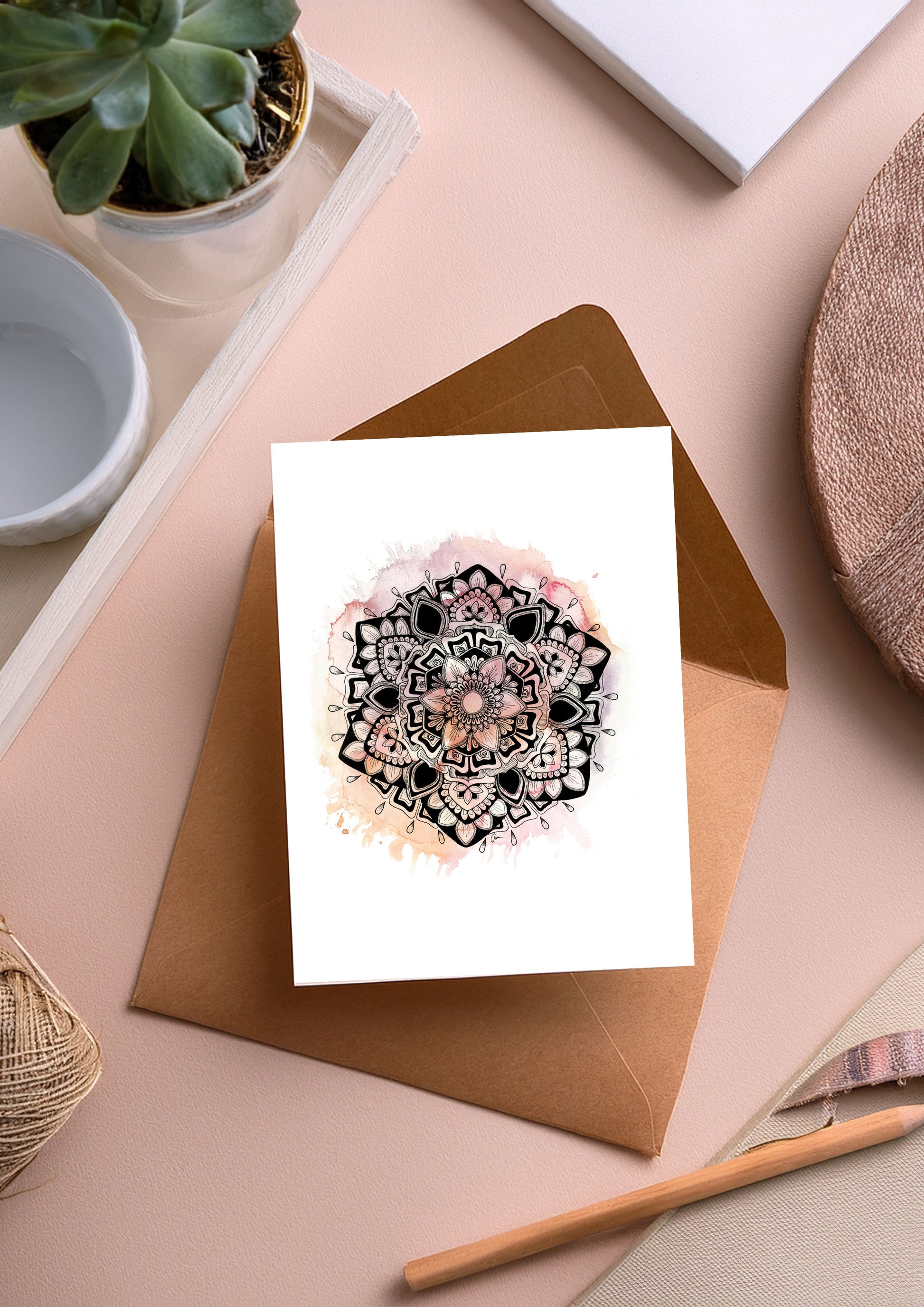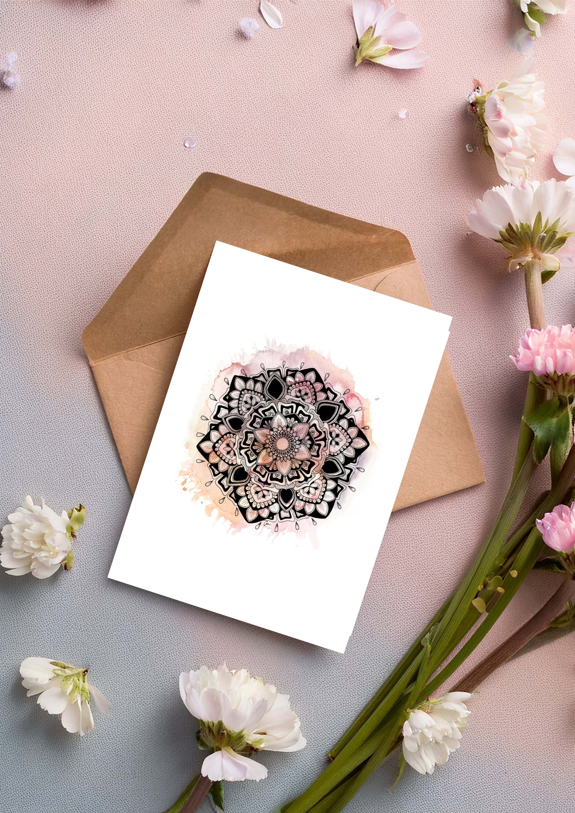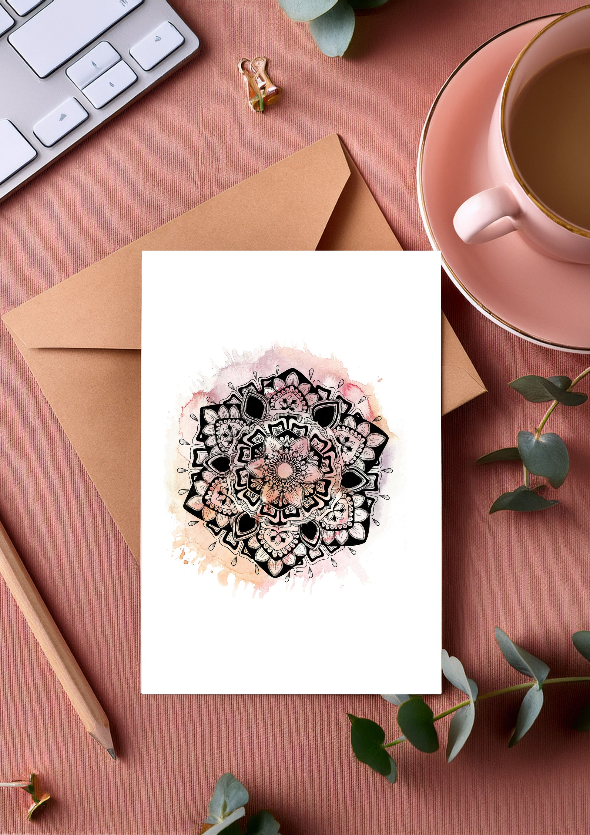 Pink Mandala Greeting Card – Pastel Watercolour with Geometric Drawing