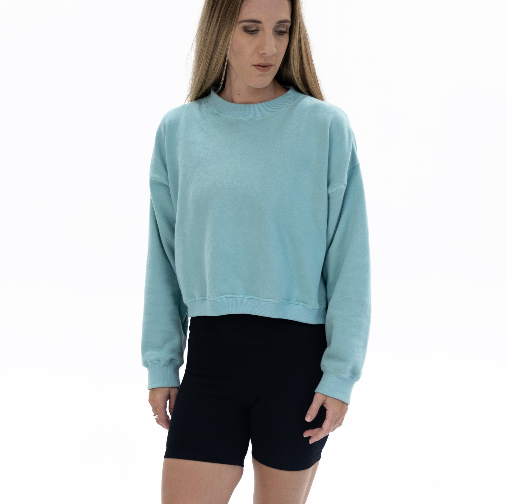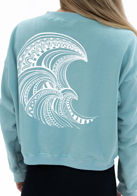 This cropped sweatshirt is a loose fitted jumper made from a cosy lightweight French Terry cotton. The sweater is ethically dyed in a pastel teal green hue and has a hand drawn white wave mandala screen print on the back.