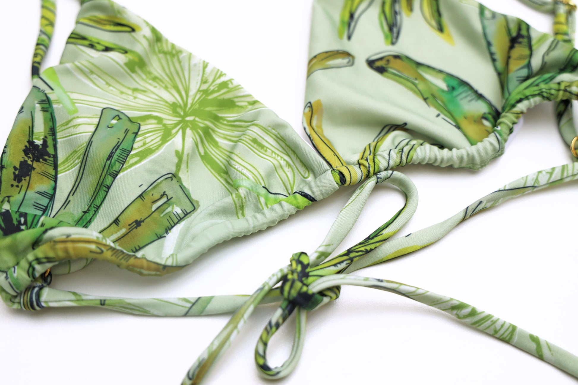 Hand-painted with a blend of green tropical watercolour leaves, this patterned bikini design is truly one-of-a-kind.