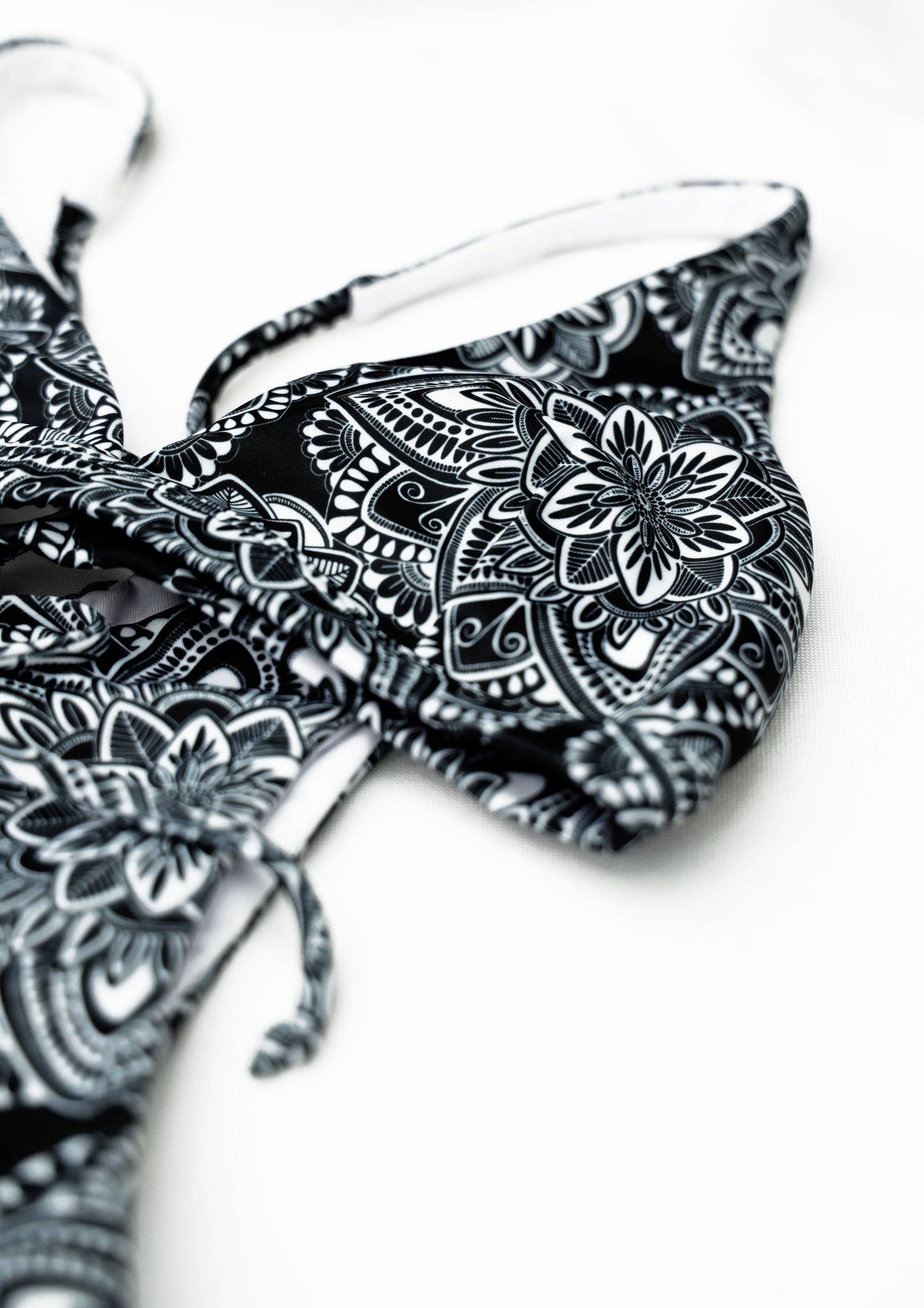 Enjoy comfort and support without the underwire! Our Signature Black and White Triangle Bikini Top caters to all sizes—from A to G cups—featuring adjustable, thick shoulder straps and an adjustable back tie for the perfect fit on both narrow and wider backs.