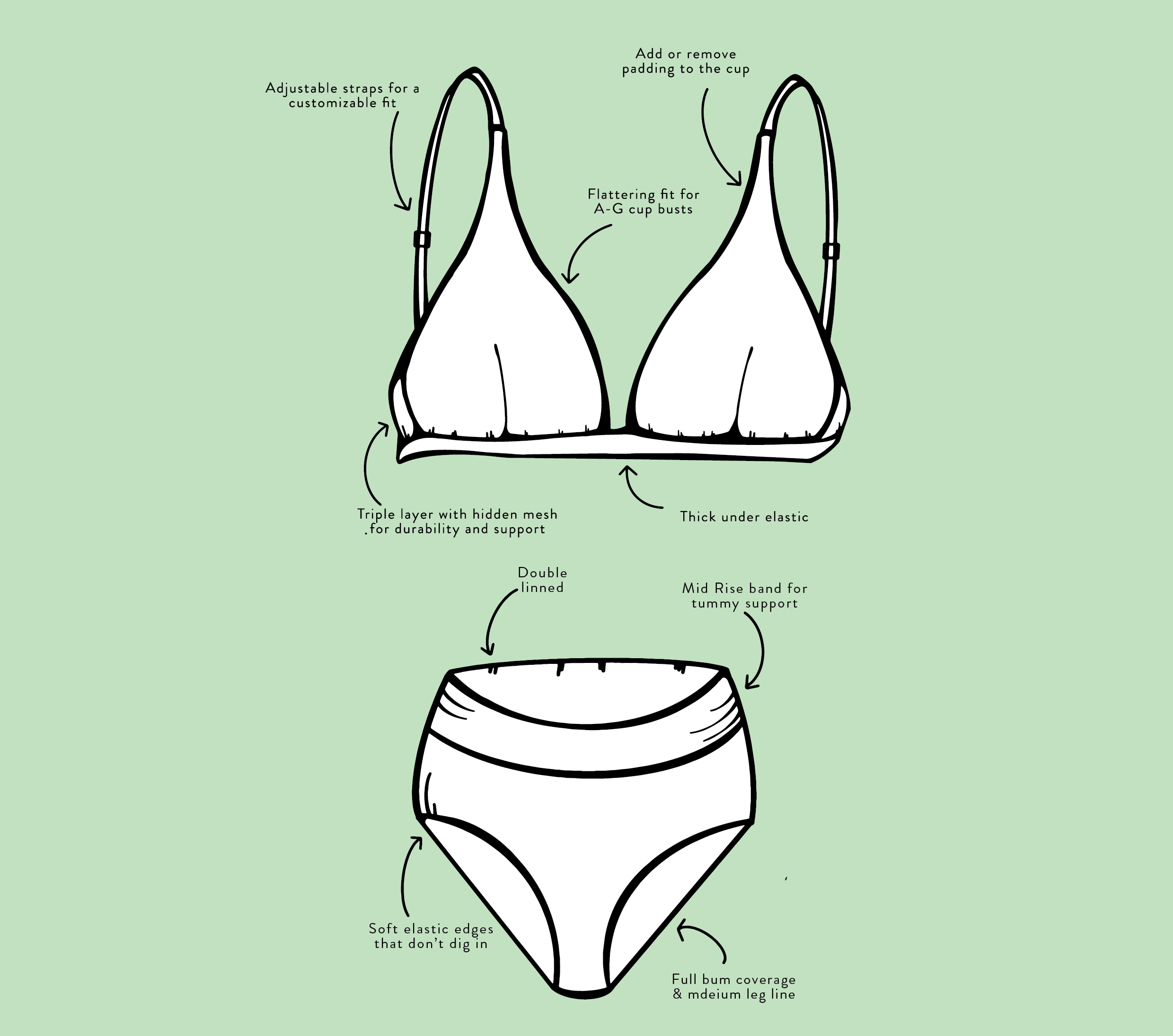 Designed for movement and comfort, this set combines a high-rise bottom with a secure, flattering fit and a hand-painted triangle top offering adjustable support for all sizes. Thoughtfully crafted from recycled fabrics, it stays in place—whether you're catching waves or soaking up the sun. Soft elastic edges ensure a comfortable fit without digging in, while the Signature Green Patterned Triangle Bikini Top features thick adjustable straps and a back tie for a custom fit—all without the need for underwire.
