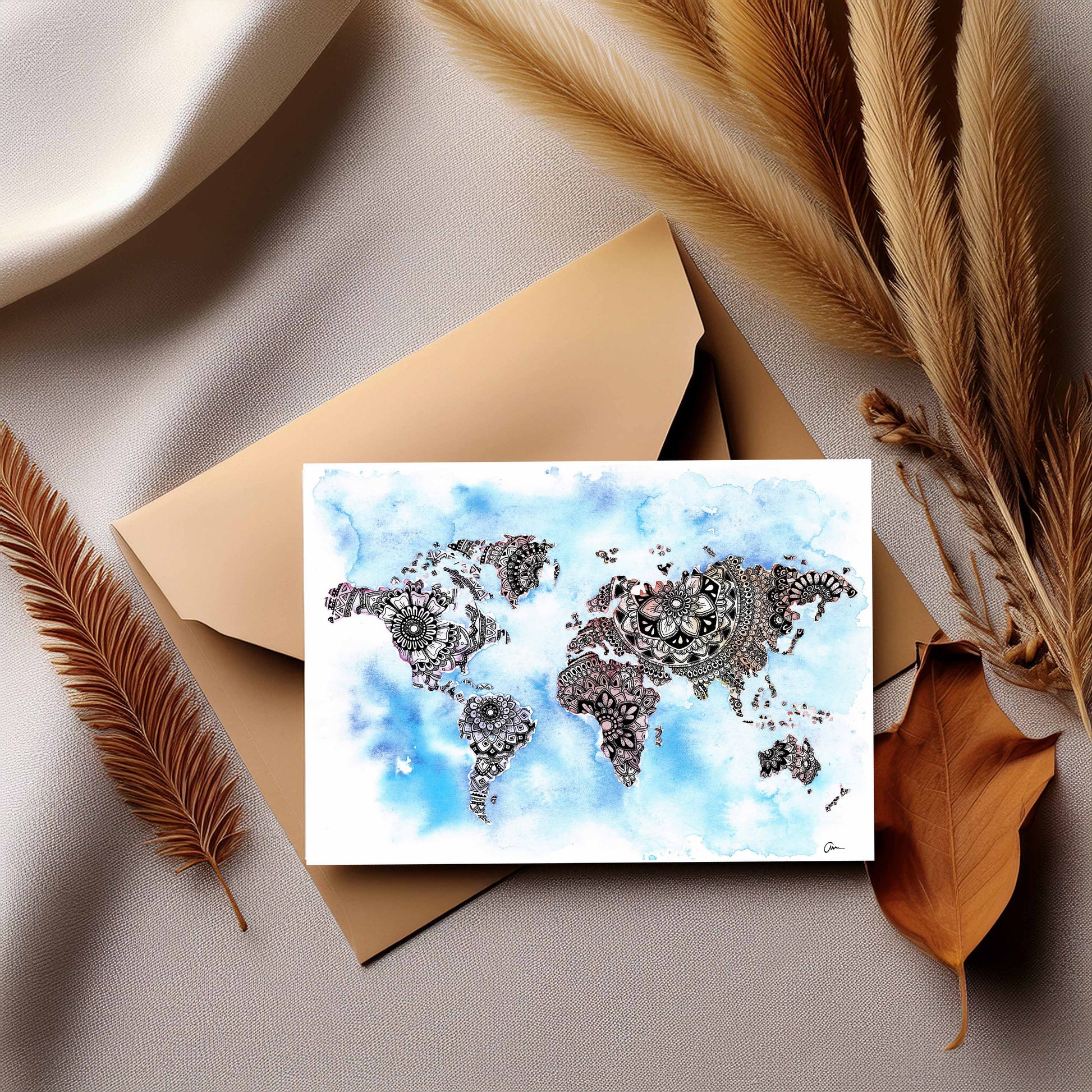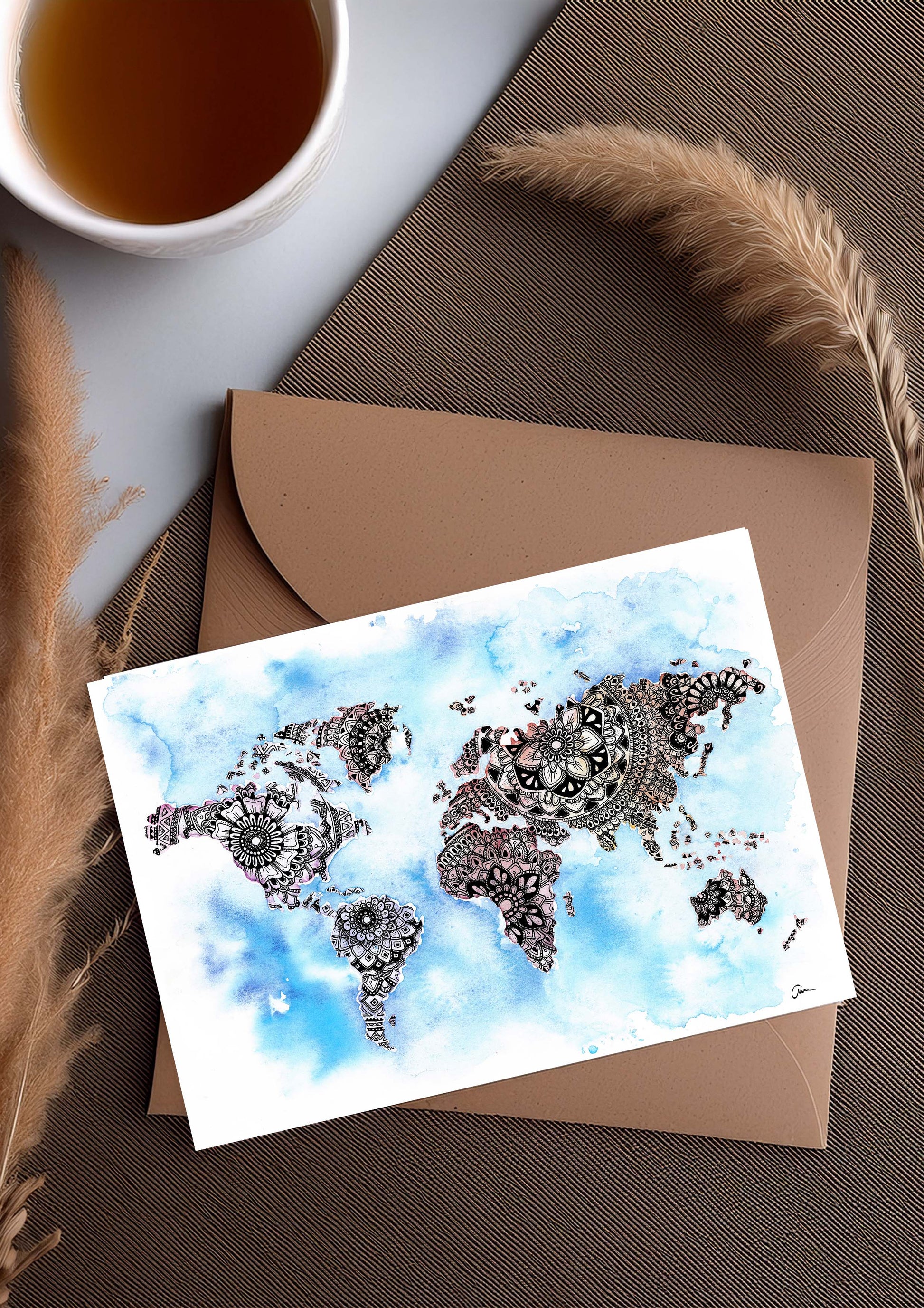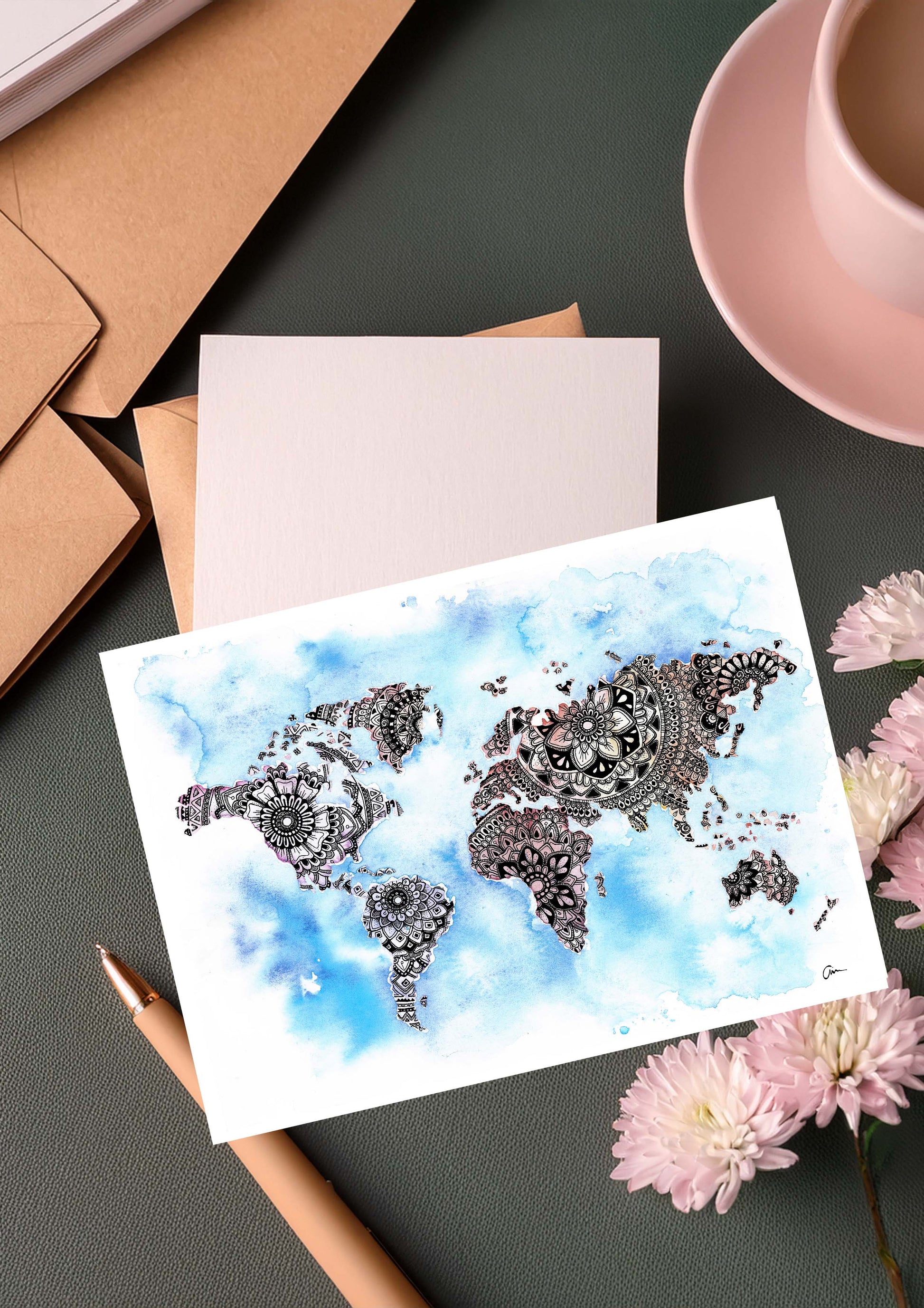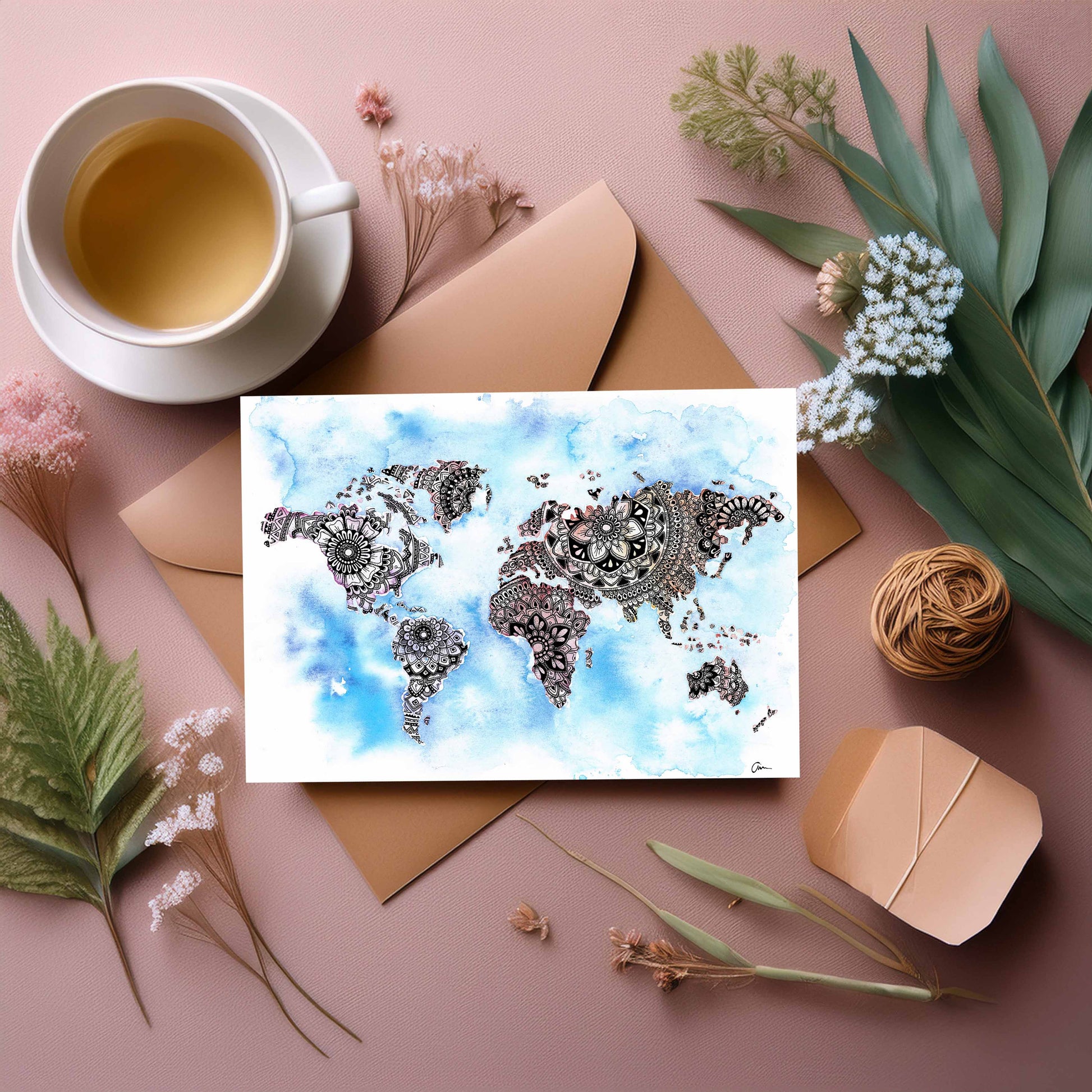 This dreamy greeting card blends soft pastel watercolours with intricate mandala linework, celebrating the beauty of global adventure and the quiet stillness of mindful living.