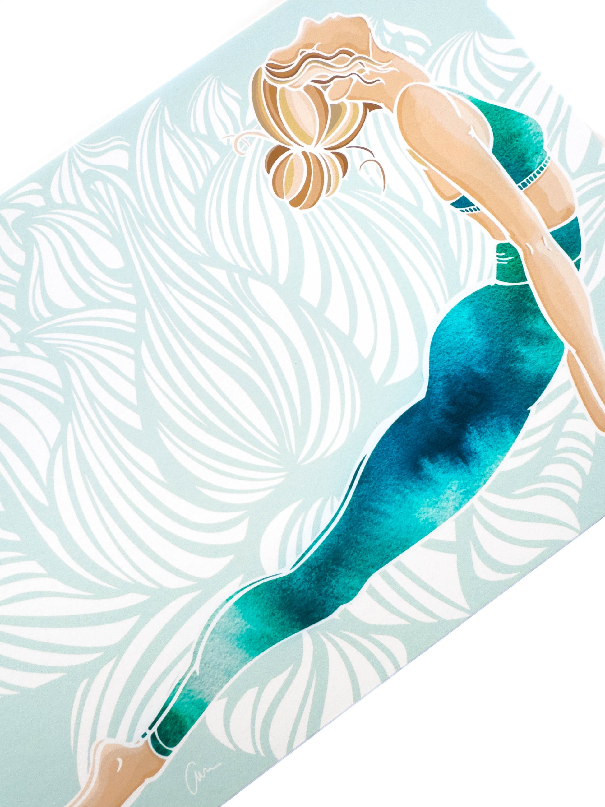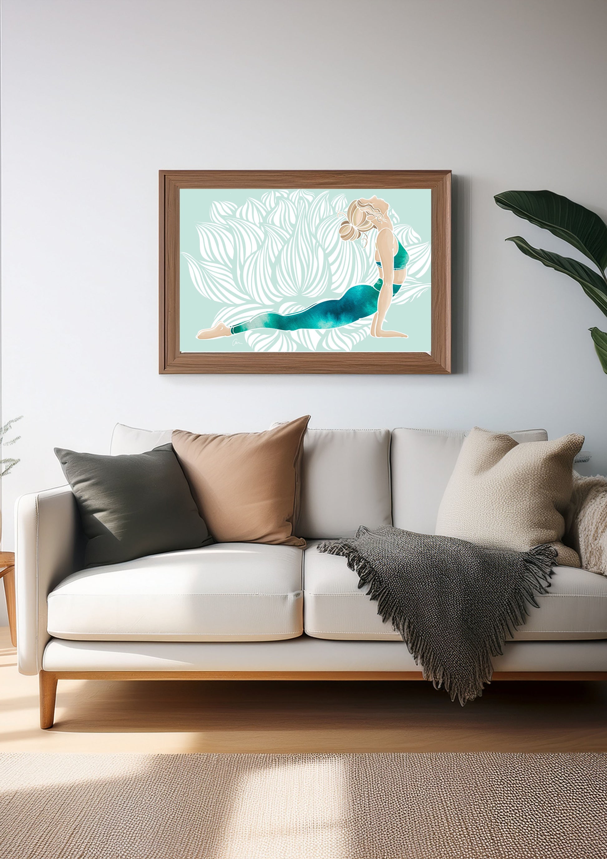 Inspired by the heart-opening yoga posture Upward Facing Dog — or Urdhva Mukha Śvānāsana in Sanskrit — this artwork features a graceful feminine figure with a blooming lotus flower in the background.