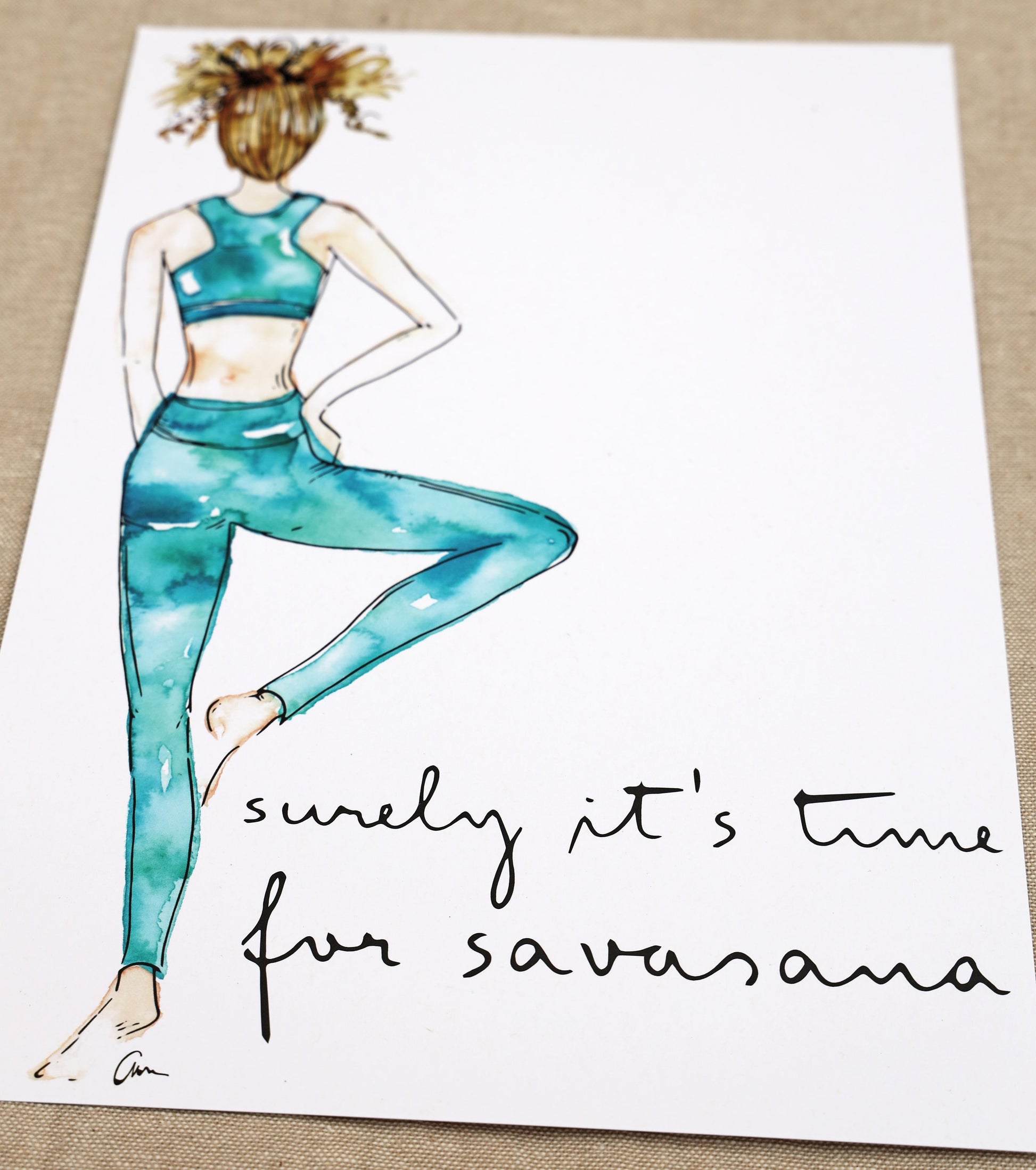 This yoga watercolour print is inspired by the tree pose. The turquoise blue yoga girl quote, talks about being ready to finish the classes and lay down in Savanasa.