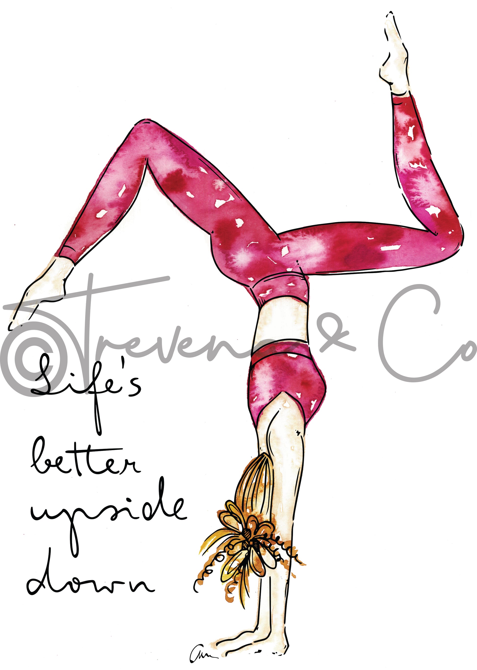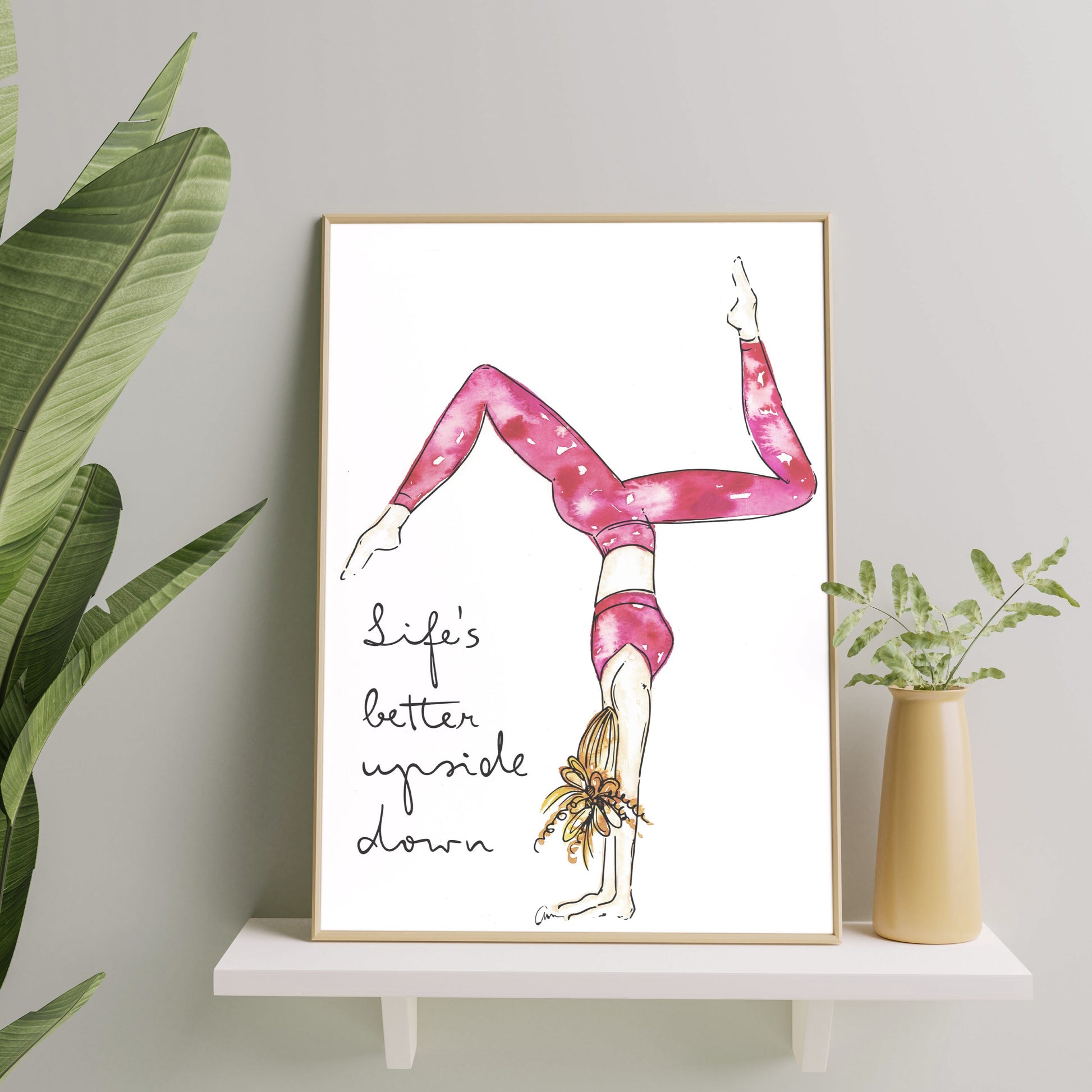 This yoga watercolour print is inspired by the handstand pose. The pink yoga girl quote, talks about how much better life is upside down.