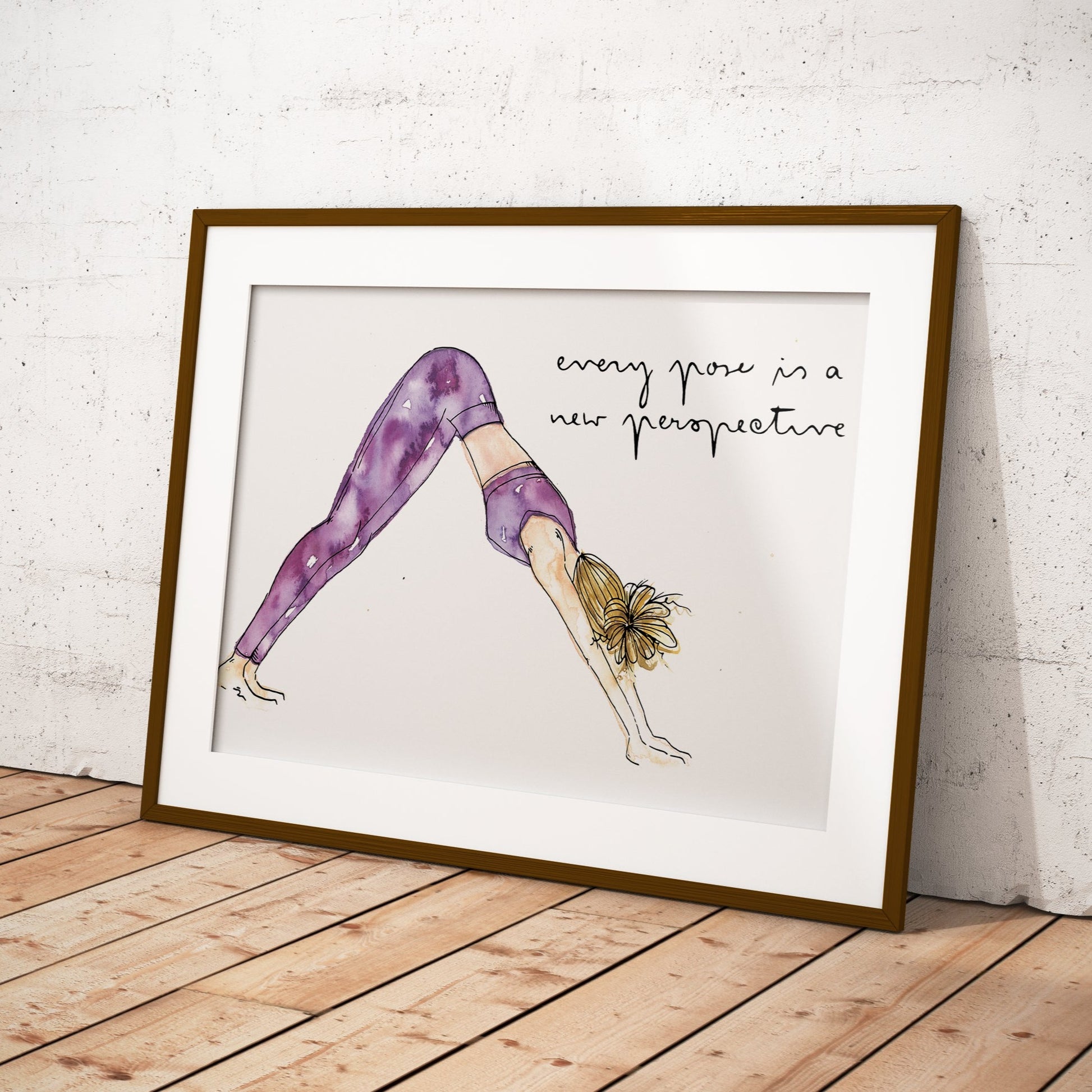 This yoga watercolour print is inspired by the downward dog. The purple yoga girl quote talks about seeing things from different perspectives.